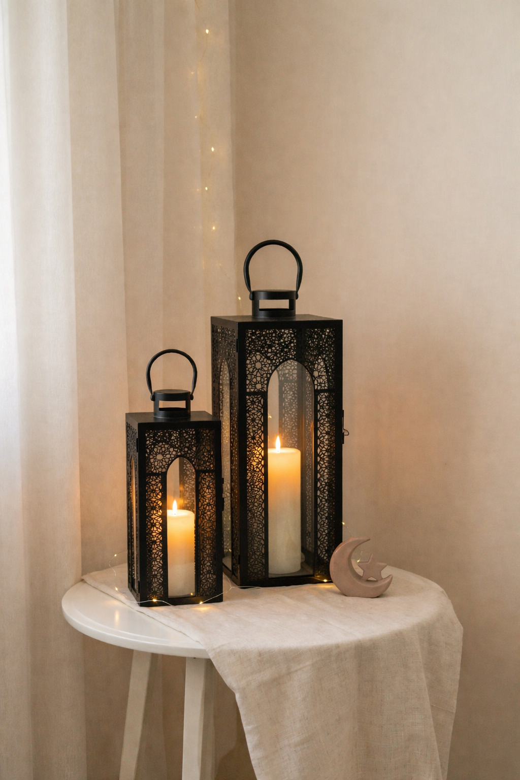 Bring a warm, refined glow to your space with an intricate cutwork silhouette and a graceful arched window that feels inspired by old city lanterns. The deep matte black finish adds a modern, sculptural presence while the patterned panels cast mesmerizing shadows across walls and tabletops. Style it by an entryway, on a console, or beside a balcony seating area to create an inviting atmosphere that feels thoughtfully curated and quietly luxurious.