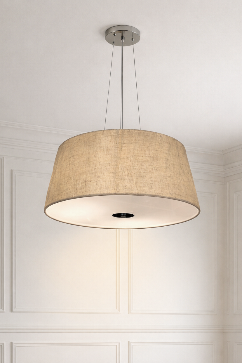 This fabric pendant lamp brings soft texture and quiet elegance into your space, defined by its smooth drum form and warm diffused glow. Designed to create a calm, welcoming atmosphere, it enhances dining areas, living rooms, bedrooms, and refined commercial interiors with understated sophistication. The neutral fabric shade gently filters light, allowing you to shape an interior that feels balanced, relaxed, and thoughtfully curated.
