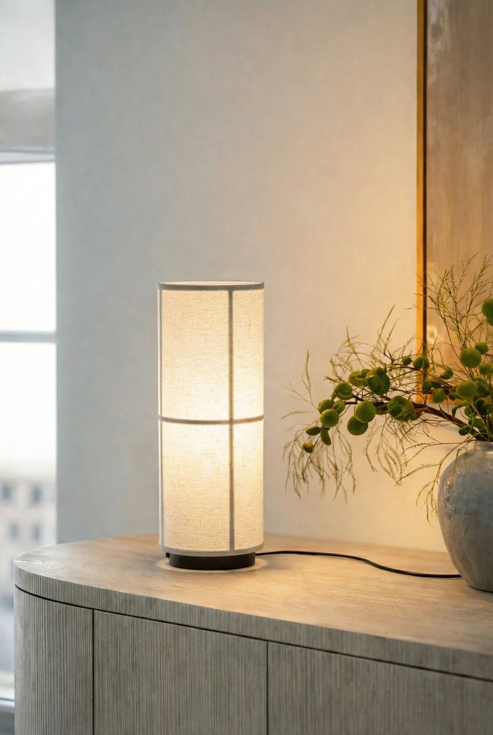 A refined cylindrical silhouette wrapped in softly textured fabric, diffusing a warm and calming glow throughout your space. The balanced proportions and clean vertical lines create a serene, modern presence, while the neutral tone blends effortlessly into minimalist, contemporary, or softly layered interiors. Perfect for consoles, bedside tables, or styled shelves, it enhances your room with understated elegance and inviting ambient light.