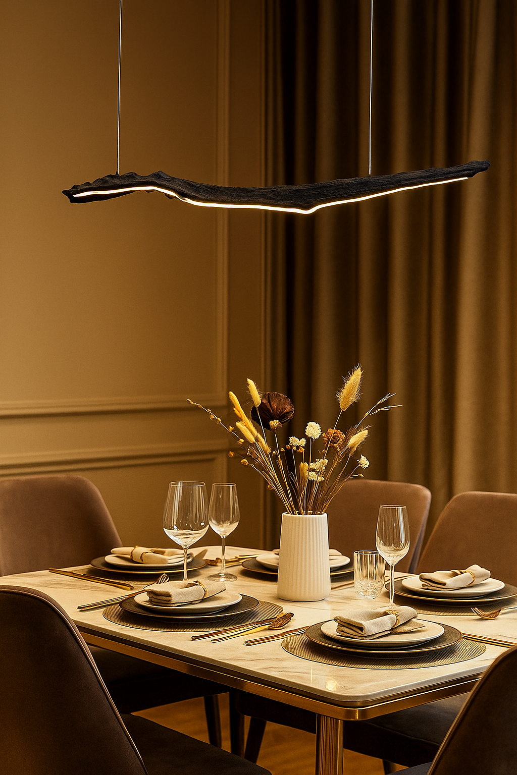A stunning linear pendant light that combines organic elegance with modern design. Inspired by the silhouette of a charred tree branch, this sculptural fixture features a textured matte black surface and a warm integrated LED strip that follows its natural contours. As you gather beneath its dramatic, elongated shape, the soft ambient glow highlights your space with contemporary rustic charm. Perfect for minimalist interiors, industrial lofts, and Scandinavian-inspired homes seeking an artistic statement piece.