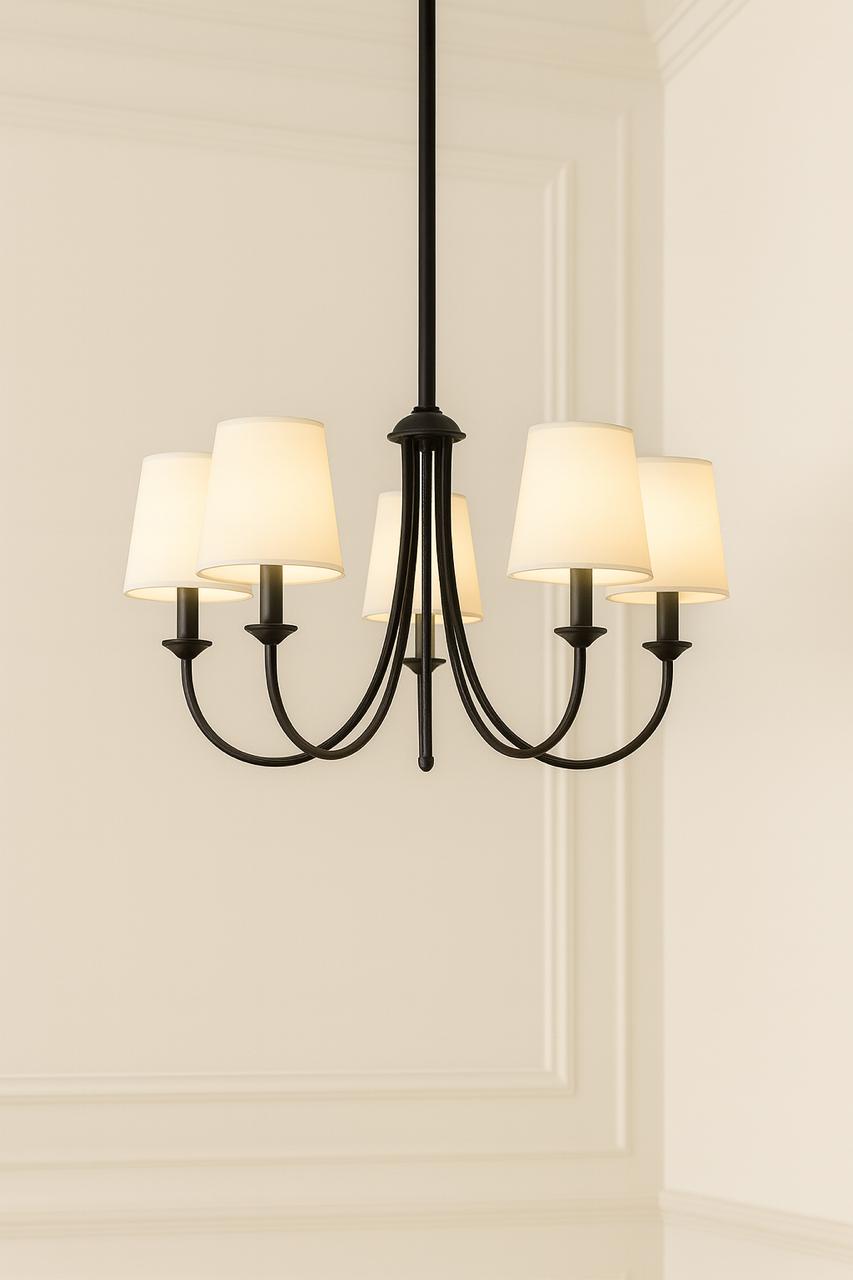 Step into refined elegance as soft fabric shades cast a warm, inviting glow across your room. The smooth black metal arms curve with perfect symmetry, their slender shape balancing strength with grace. Subtle contrast between the dark finish and the ivory texture of the lampshades gives your space a modern yet timeless charm making you the center of style and comfort.