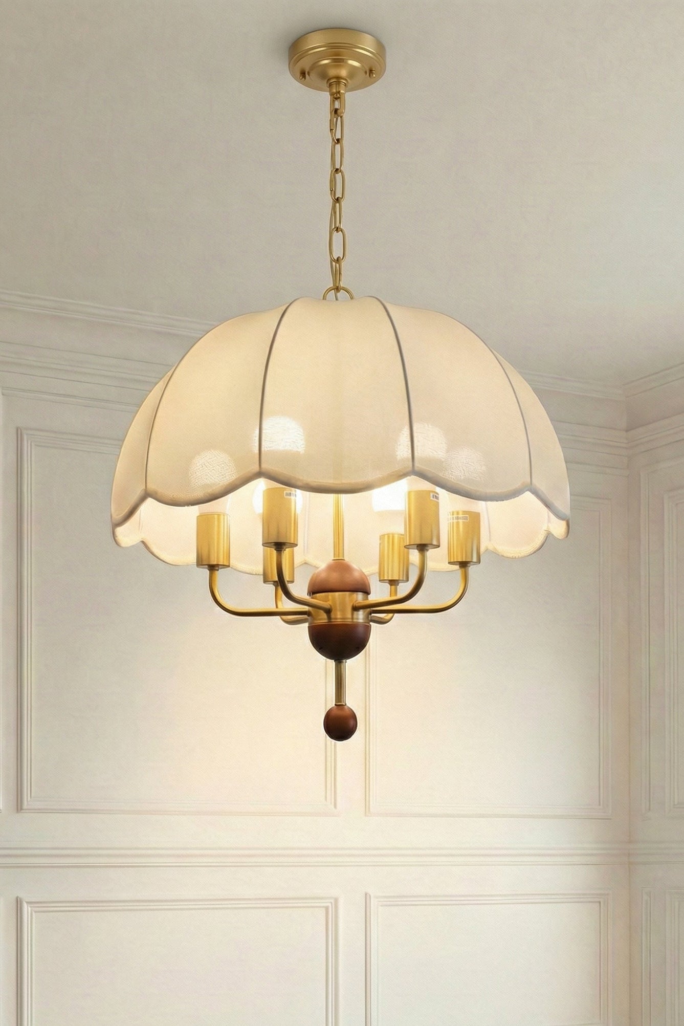 This pendant lamp brings soft elegance to interiors through its gently scalloped fabric shade and warm, diffused glow that feels both timeless and inviting. Designed to soften modern spaces, it creates a calm focal point above dining tables, bedside settings, reading corners, and boutique interiors, adding a refined balance of texture, light, and quiet charm.