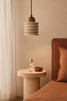 Invite a warm, sculptural glow with Ripple, a pendant lamp crafted in travertine marble. The natural beige stone shade features a ribbed cylindrical profile that feels tactile and quietly luxurious, while the compact form casts focused, ambient light over a bedside or dining nook. Paired with a matching marble ceiling base and fabric cord, this minimalist, organic design layers beautifully in modern and Japandi interiors.
