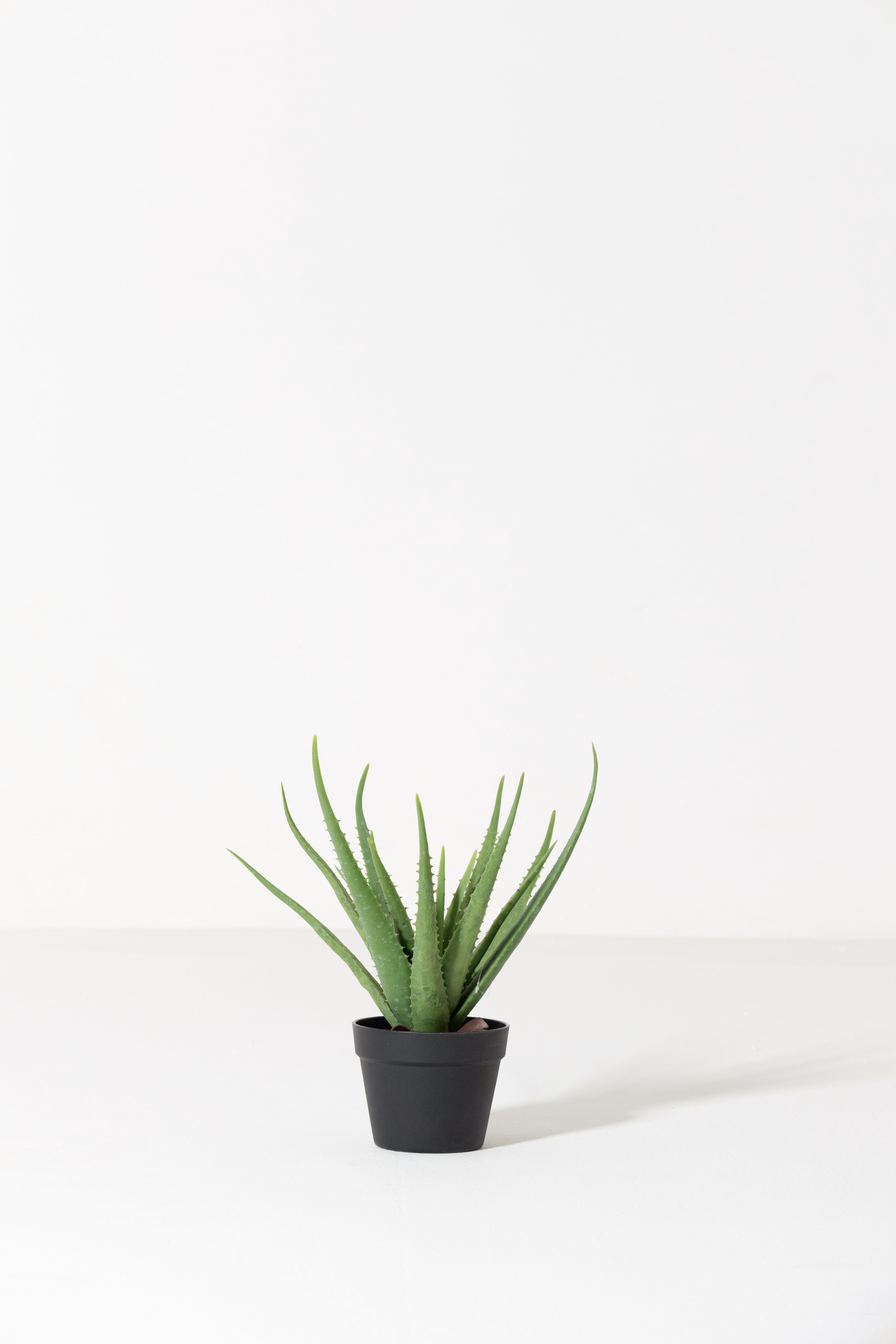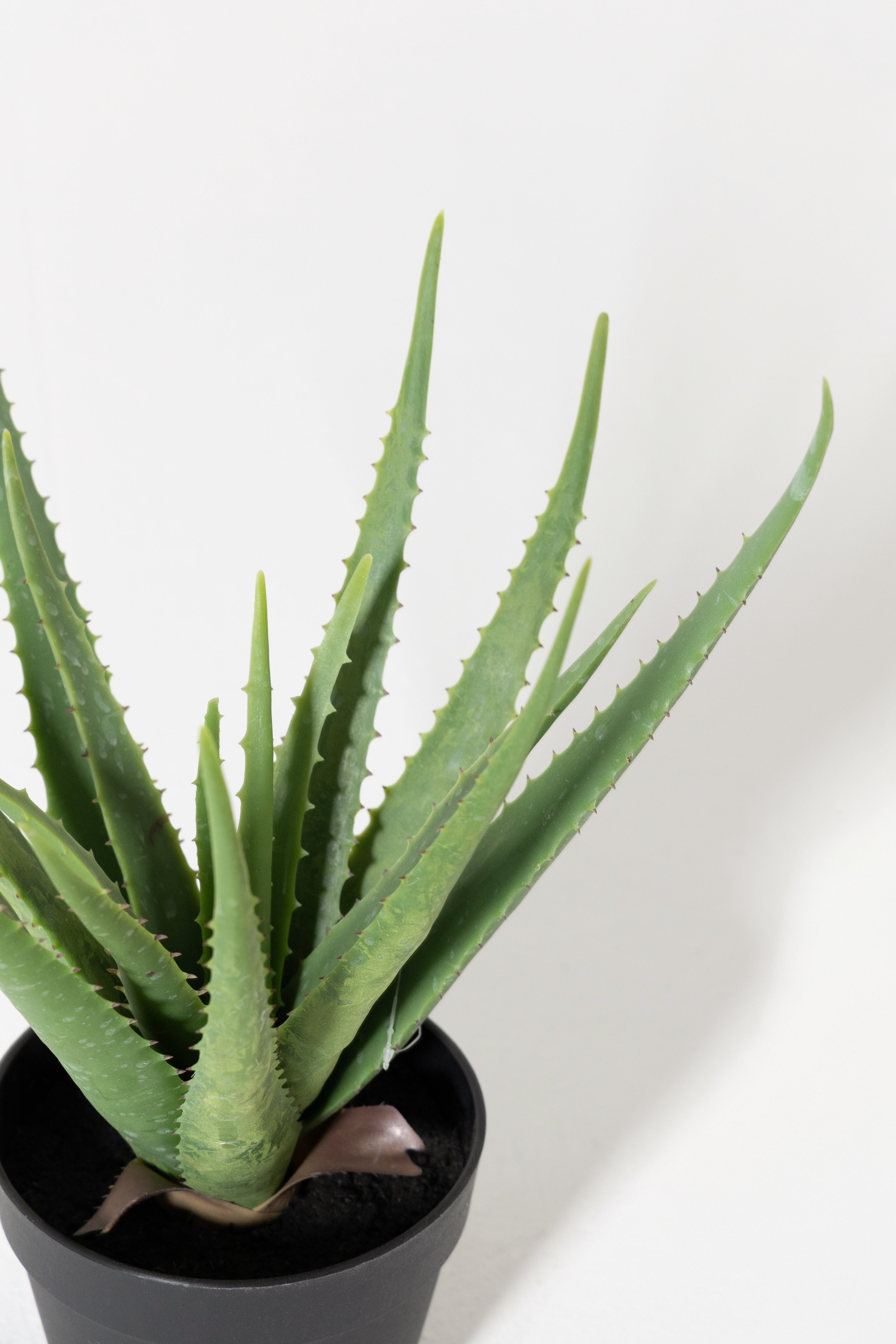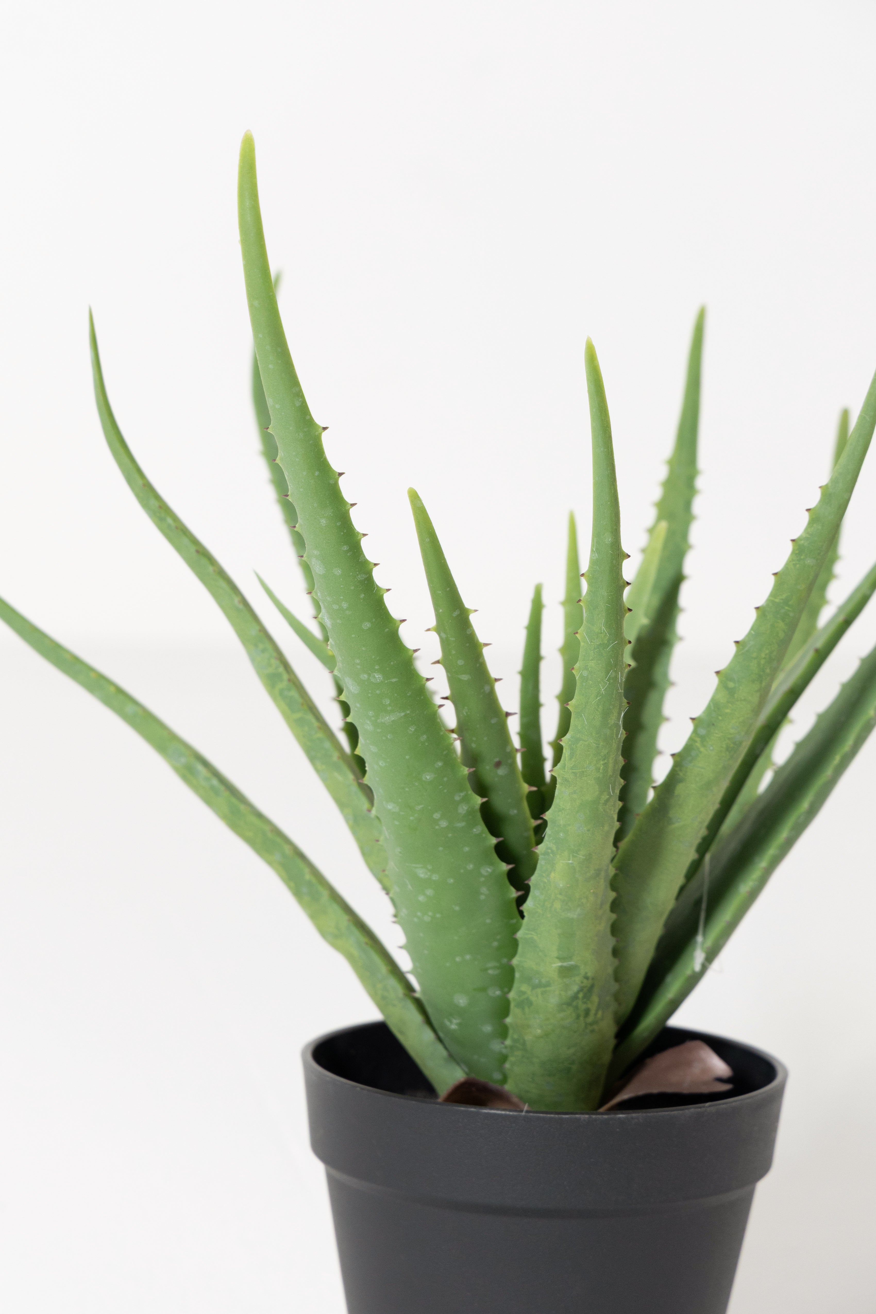 Bring a refreshing touch of greenery to your space with this realistic aloe plant, crafted with thick, pointed leaves that mimic the natural structure of live aloe. The smooth matte green finish and upward-spreading form create a clean, sculptural look, while the compact black pot makes it easy to style on desks, shelves, countertops, or small corners. Designed to stay vibrant with zero maintenance, it adds a fresh, modern accent to any room with its simple and calming appearance.