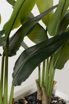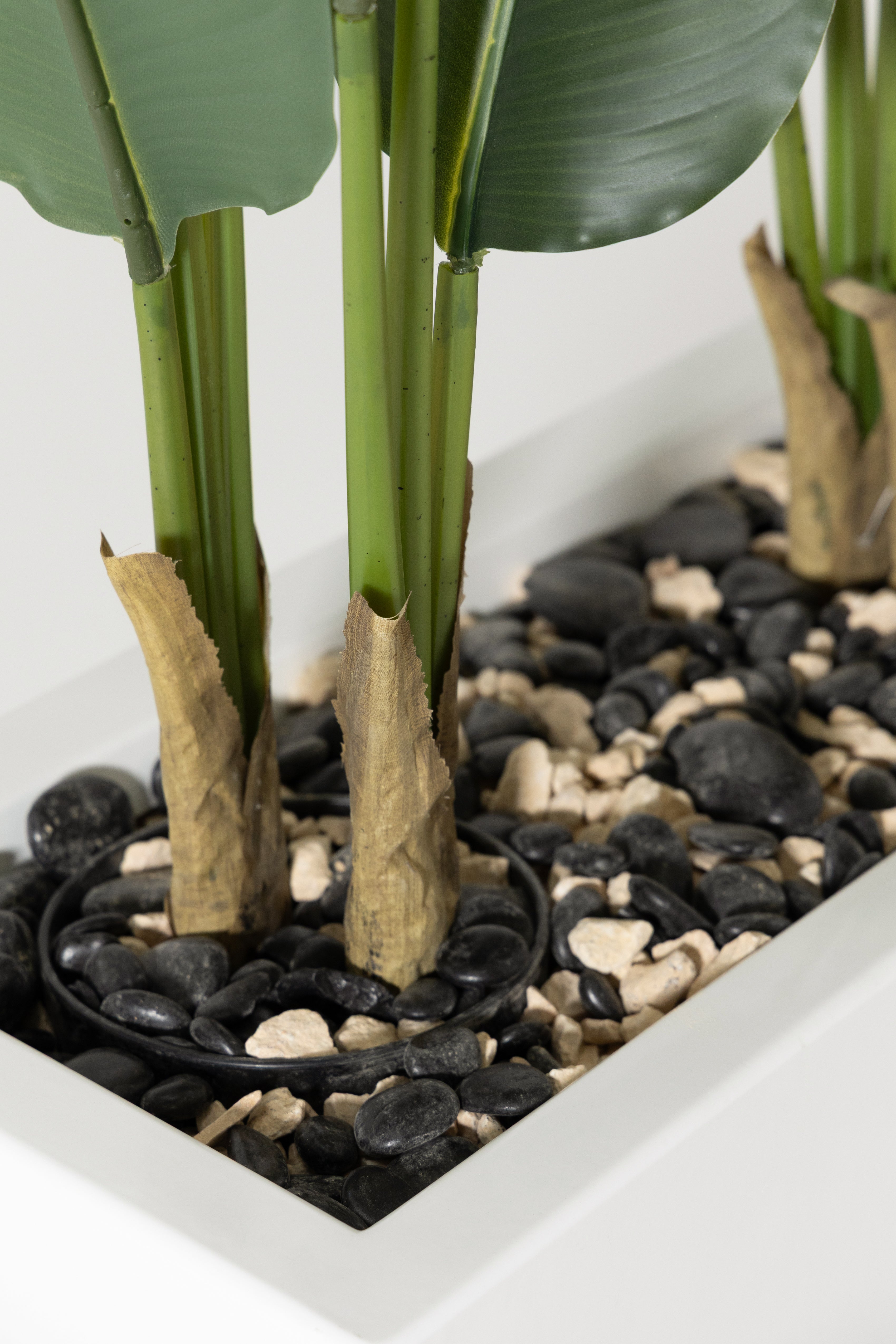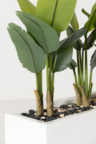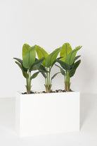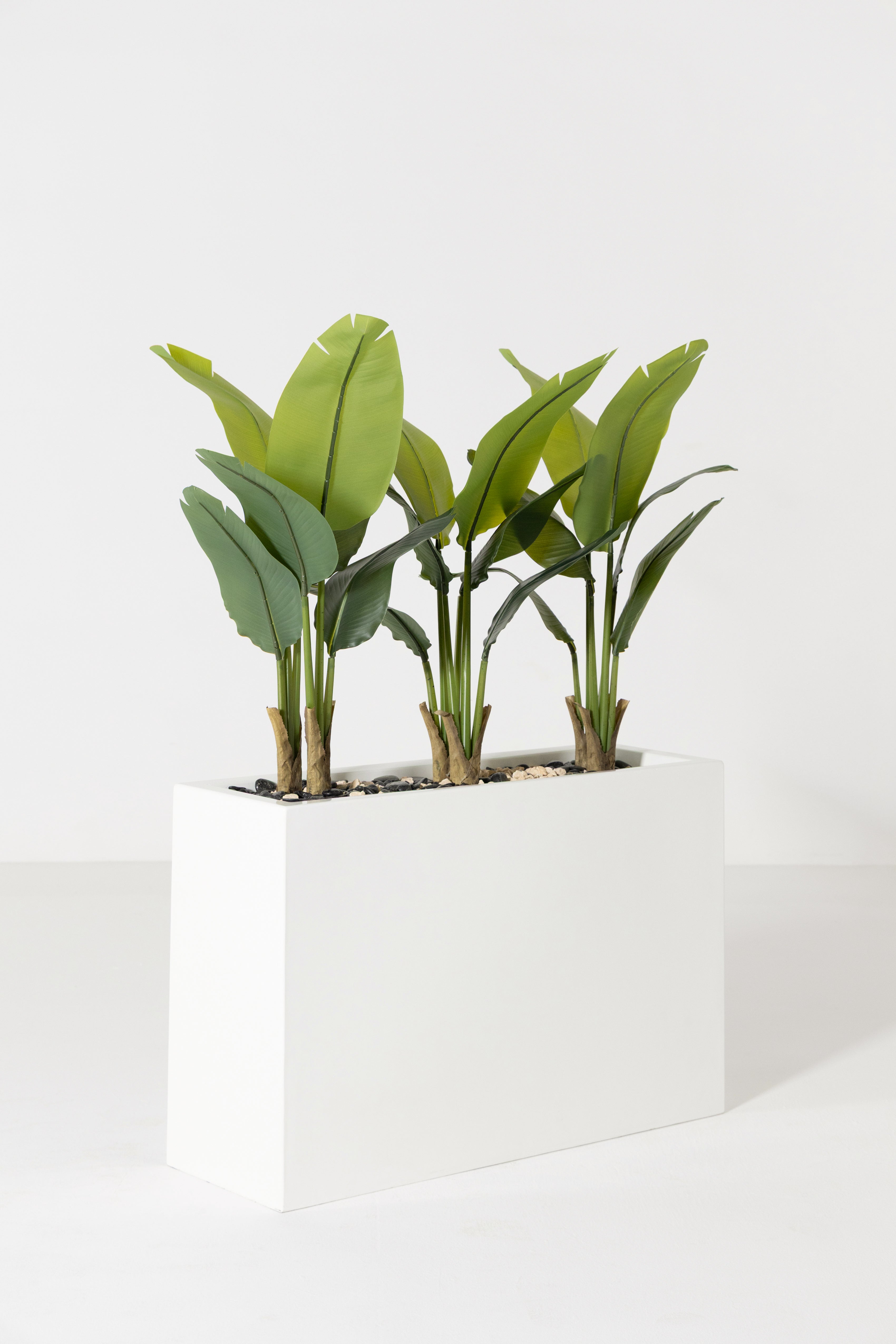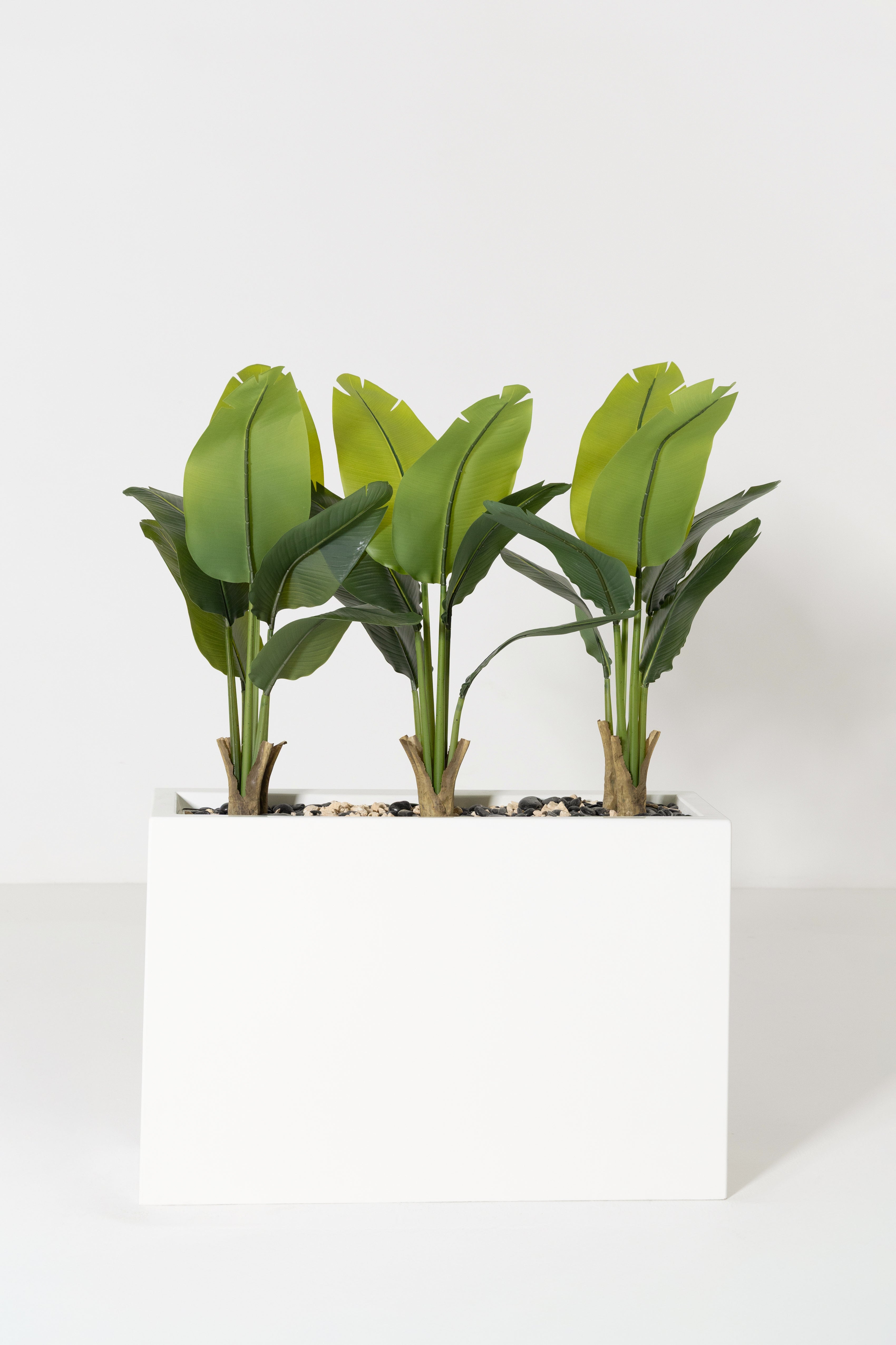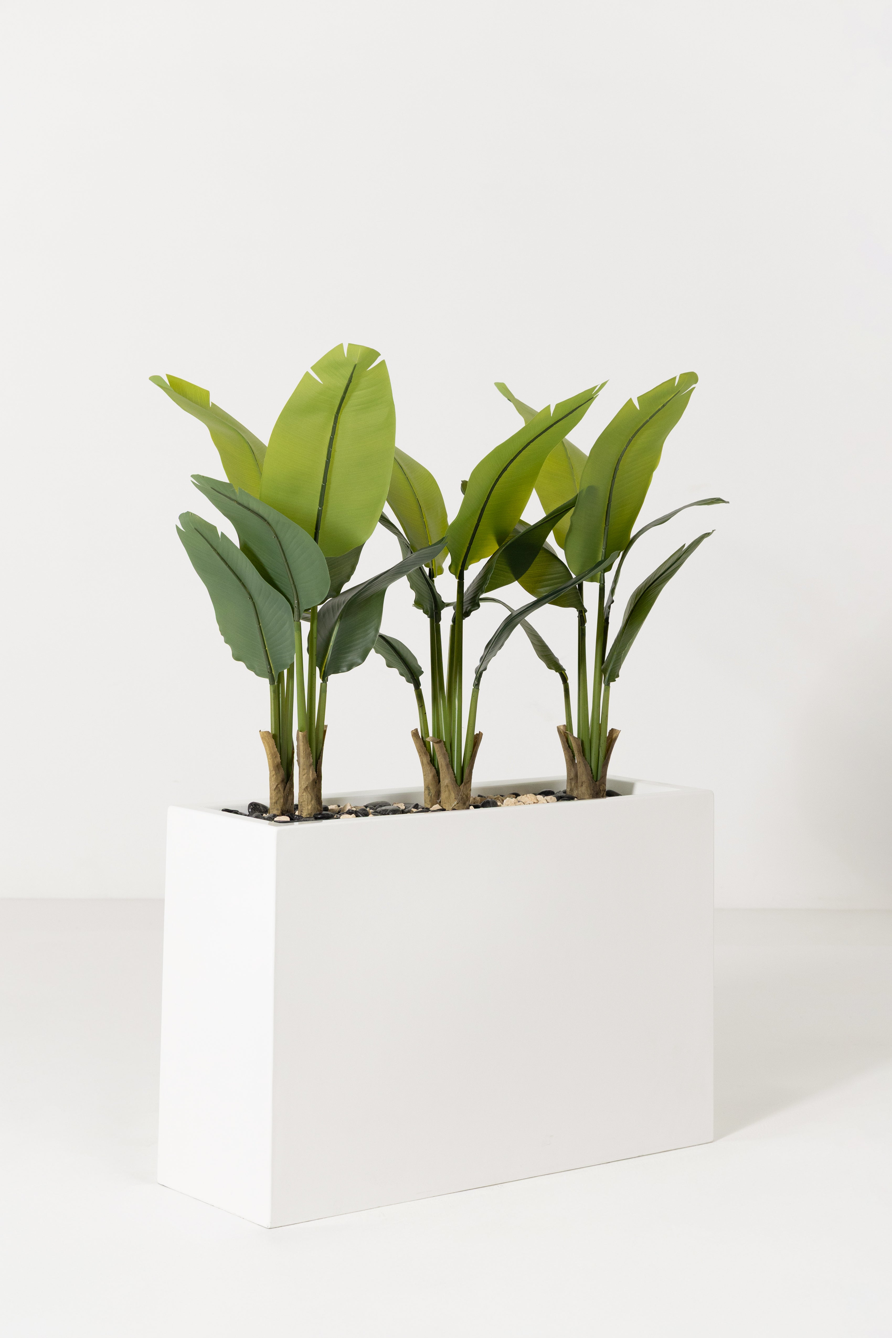 Bring a fresh tropical feel to your space with this lush banana plant arrangement, featuring tall upright stems and wide, sculpted green leaves for a bold natural look. The vibrant foliage is neatly placed in a sleek rectangular white planter, creating a clean modern contrast that fits beautifully in living rooms, hallways, offices, or entryways. With its realistic texture and maintenance-free design, it adds height, color, and a calming tropical vibe to any contemporary interior.