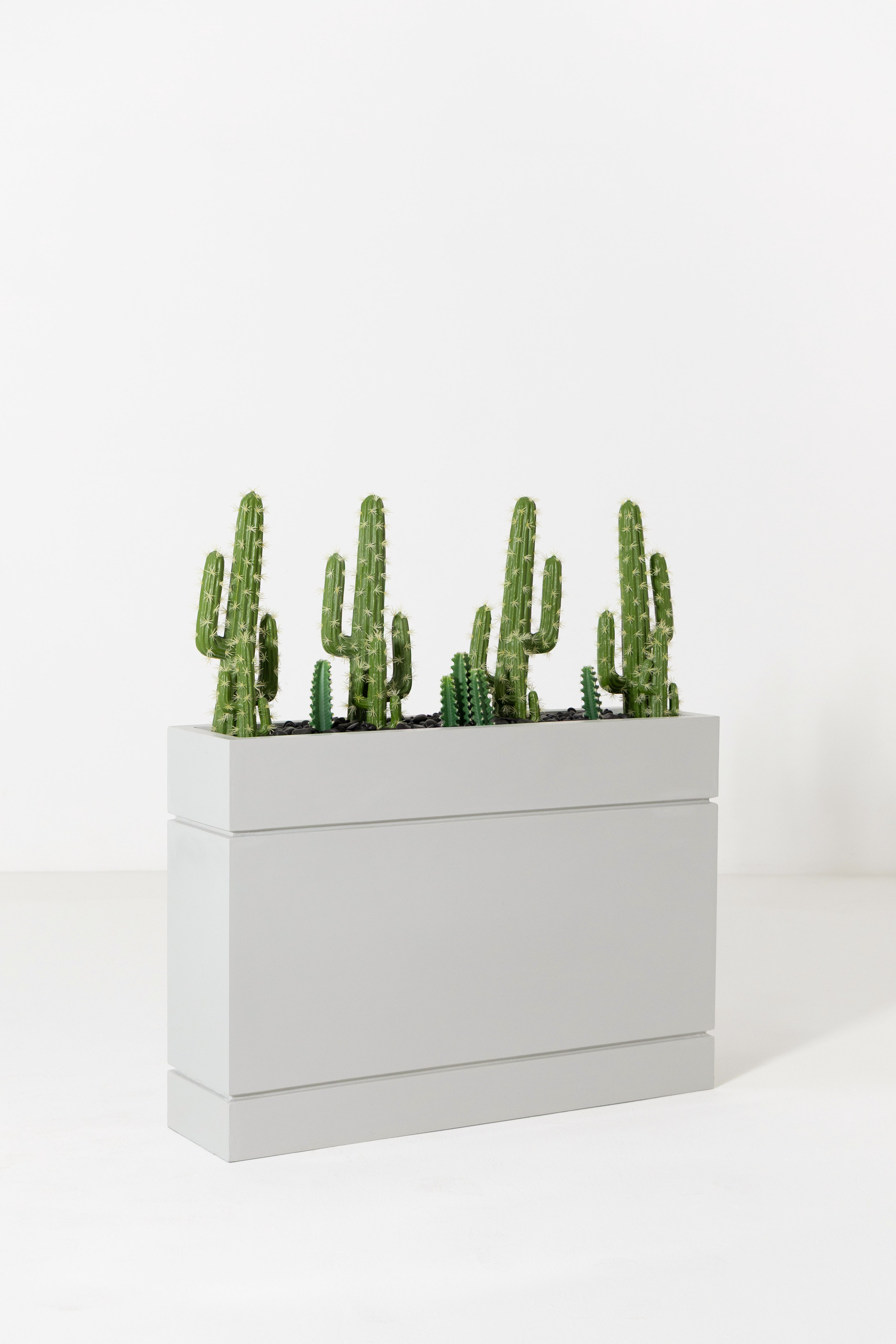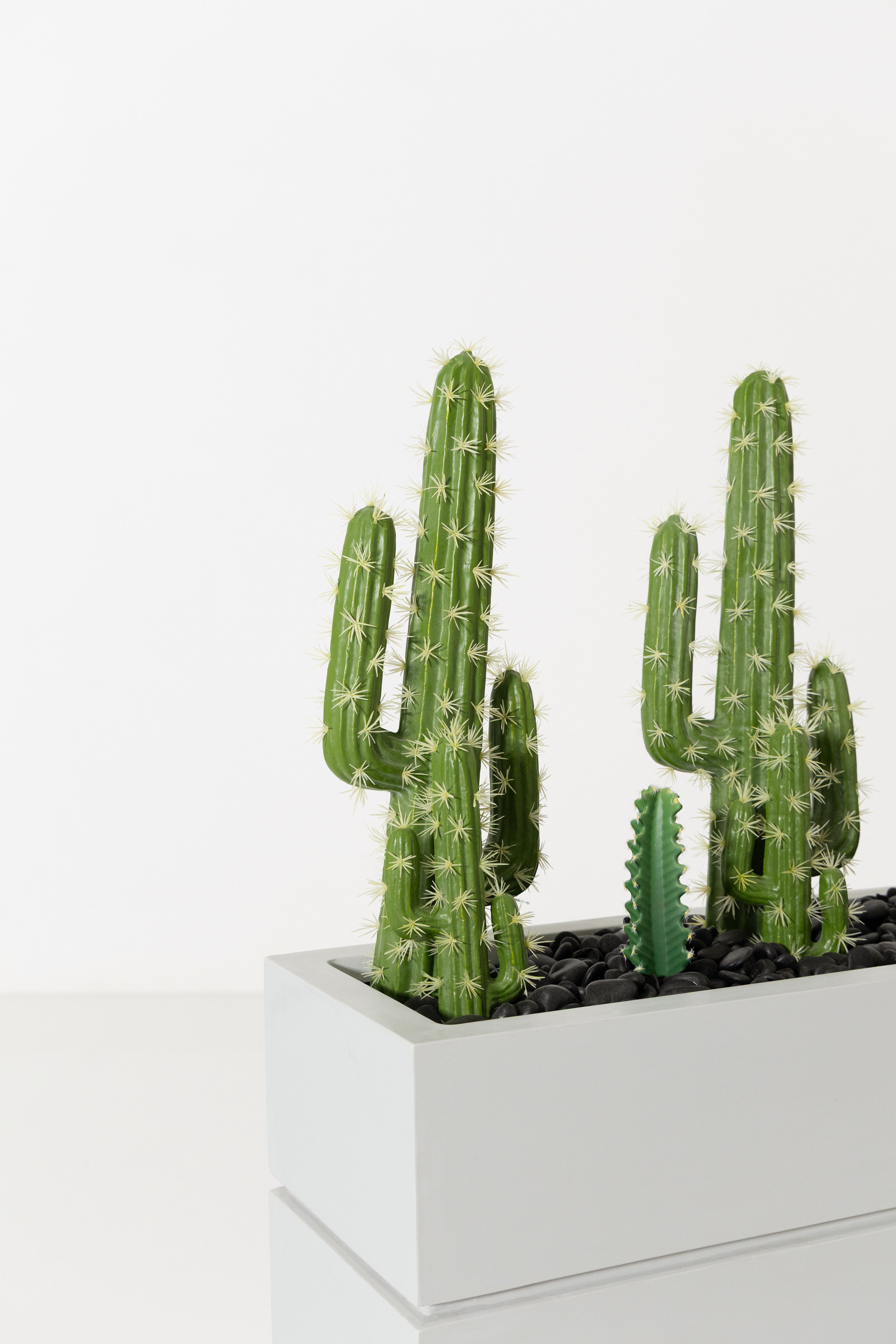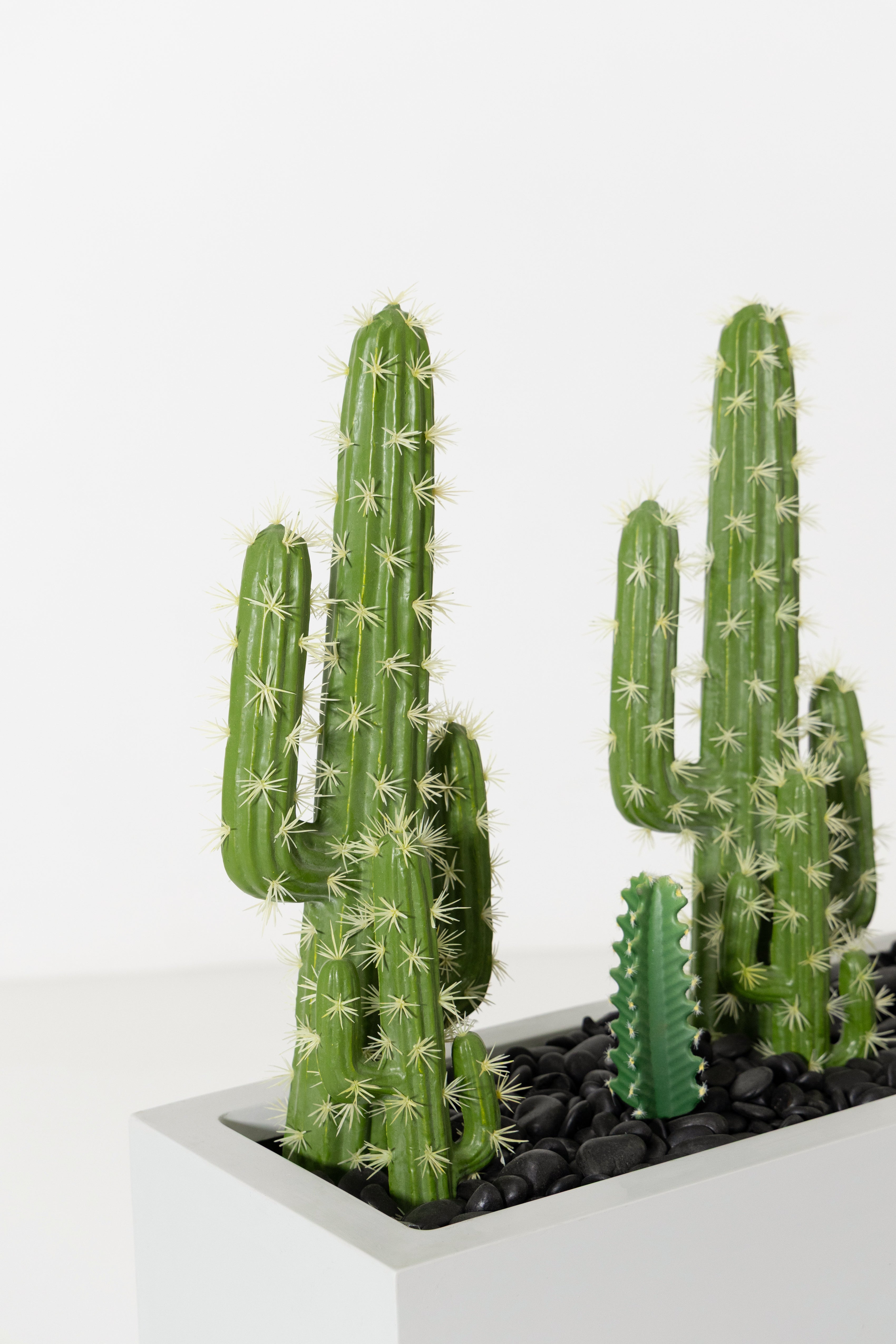 Bring a bold desert-inspired touch to your décor with this modern cactus arrangement, featuring multiple lifelike cereus cacti in varying heights for a dynamic, sculptural look. The rich green tones and ribbed textures add realistic detail, while the sleek rectangular grey planter creates a clean, contemporary contrast. Perfect for console tables, office spaces, reception areas, or minimalist interiors, this maintenance-free piece adds personality, structure, and a fresh hint of greenery without requiring any care.