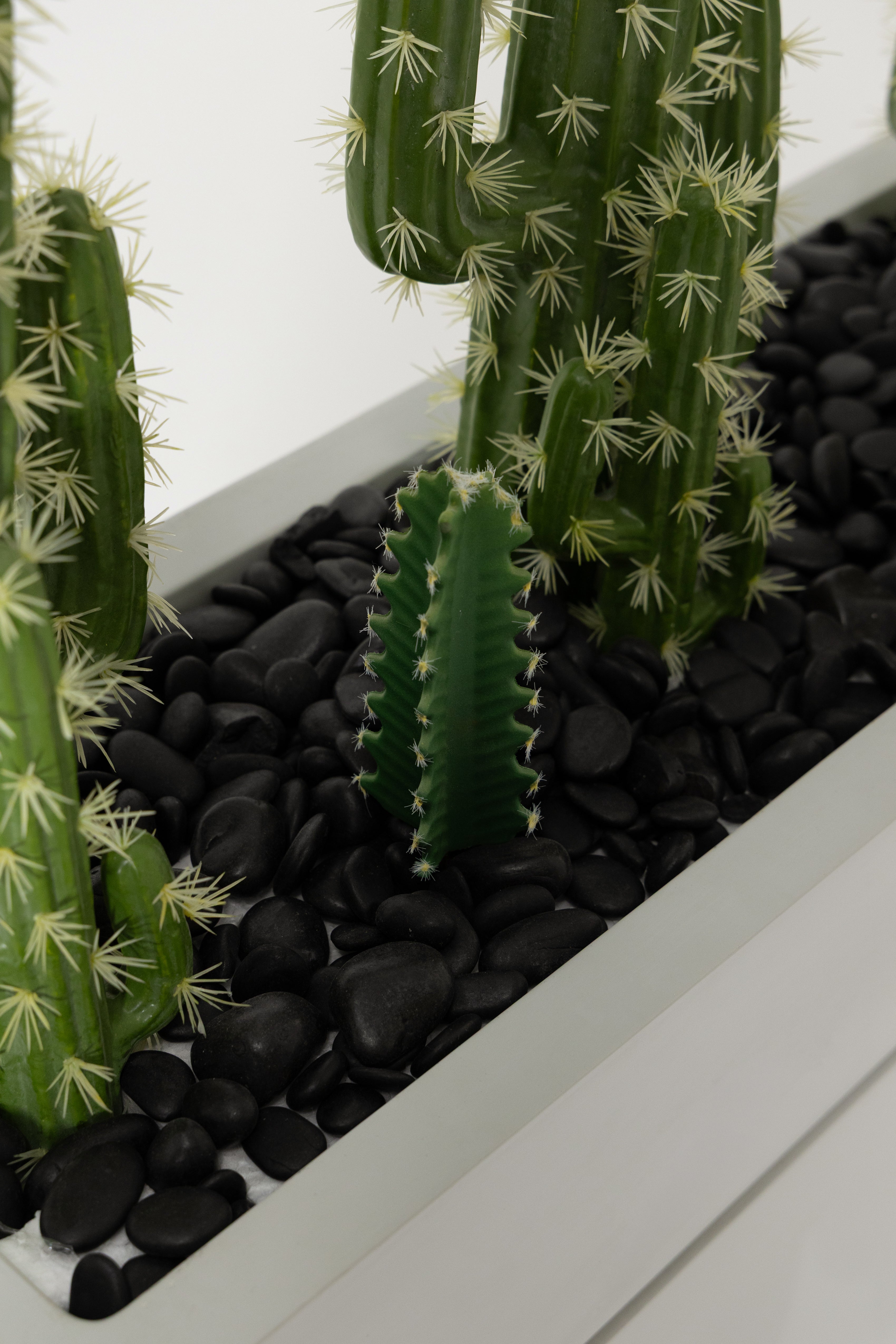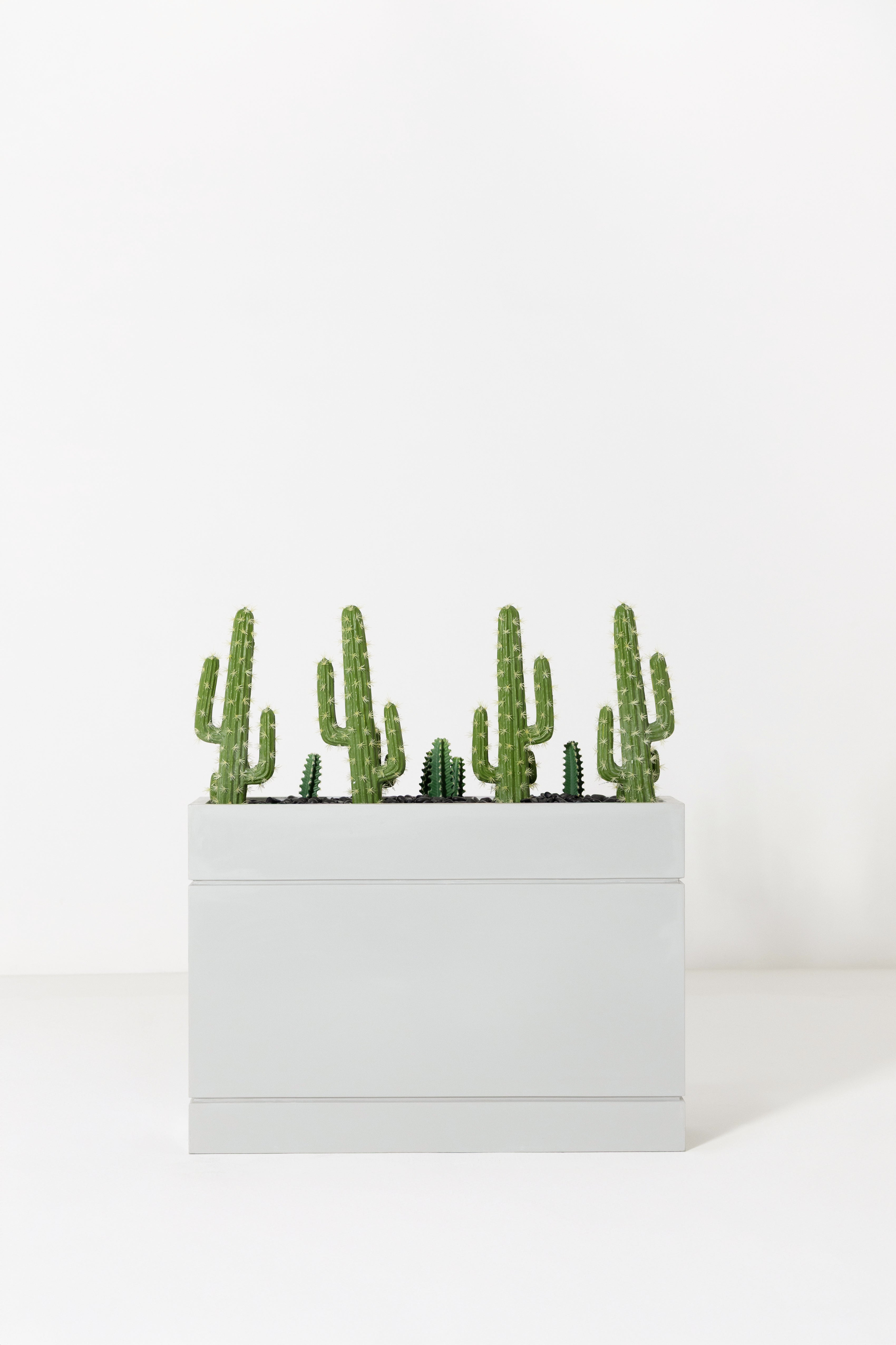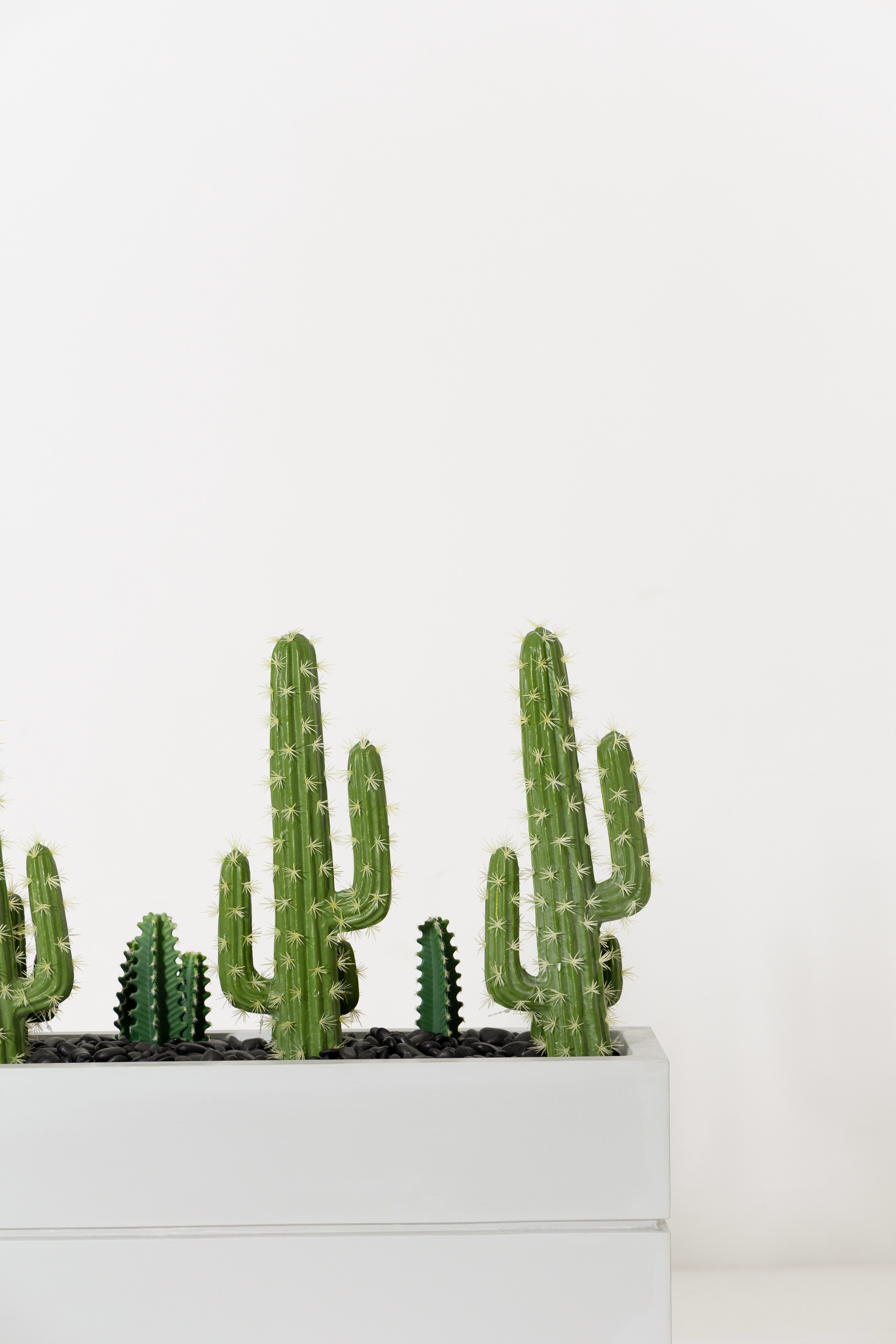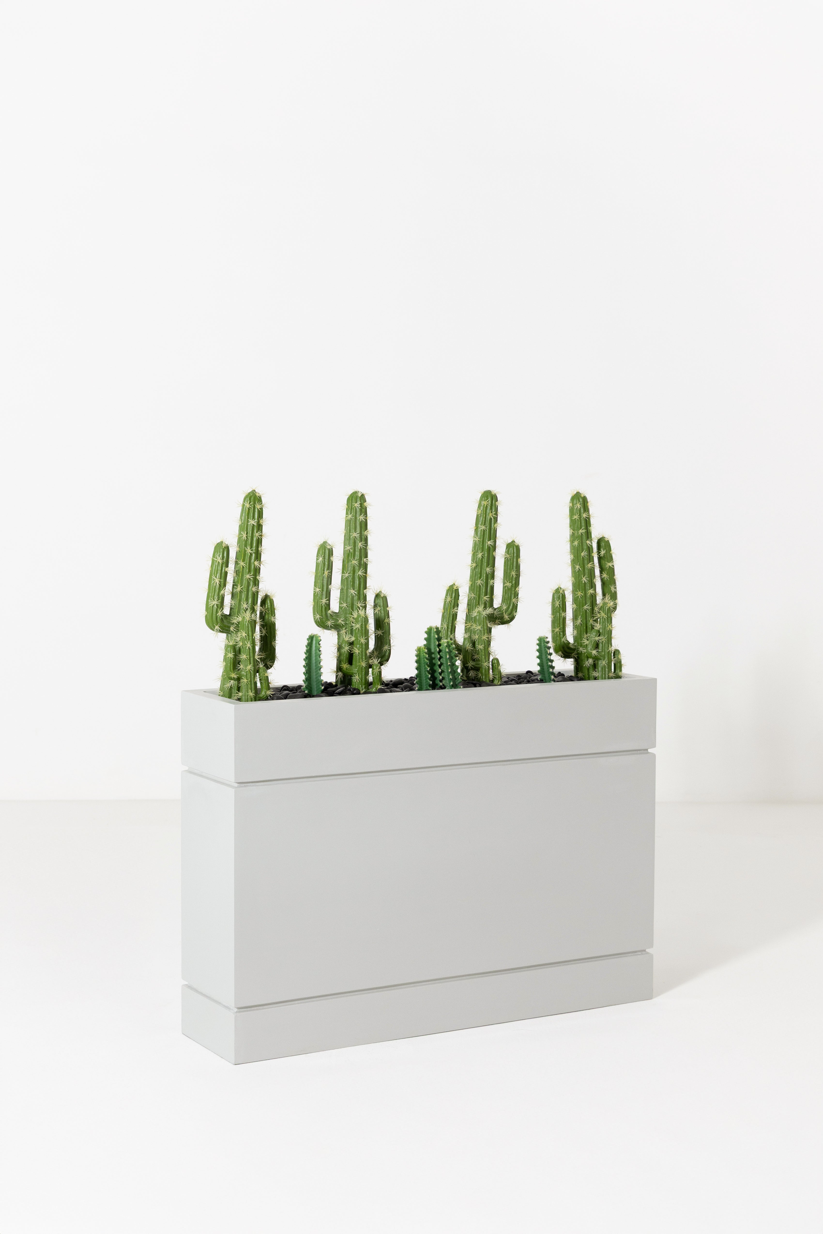 Bring a bold desert-inspired touch to your décor with this modern cactus arrangement, featuring multiple lifelike cereus cacti in varying heights for a dynamic, sculptural look. The rich green tones and ribbed textures add realistic detail, while the sleek rectangular grey planter creates a clean, contemporary contrast. Perfect for console tables, office spaces, reception areas, or minimalist interiors, this maintenance-free piece adds personality, structure, and a fresh hint of greenery without requiring any care.