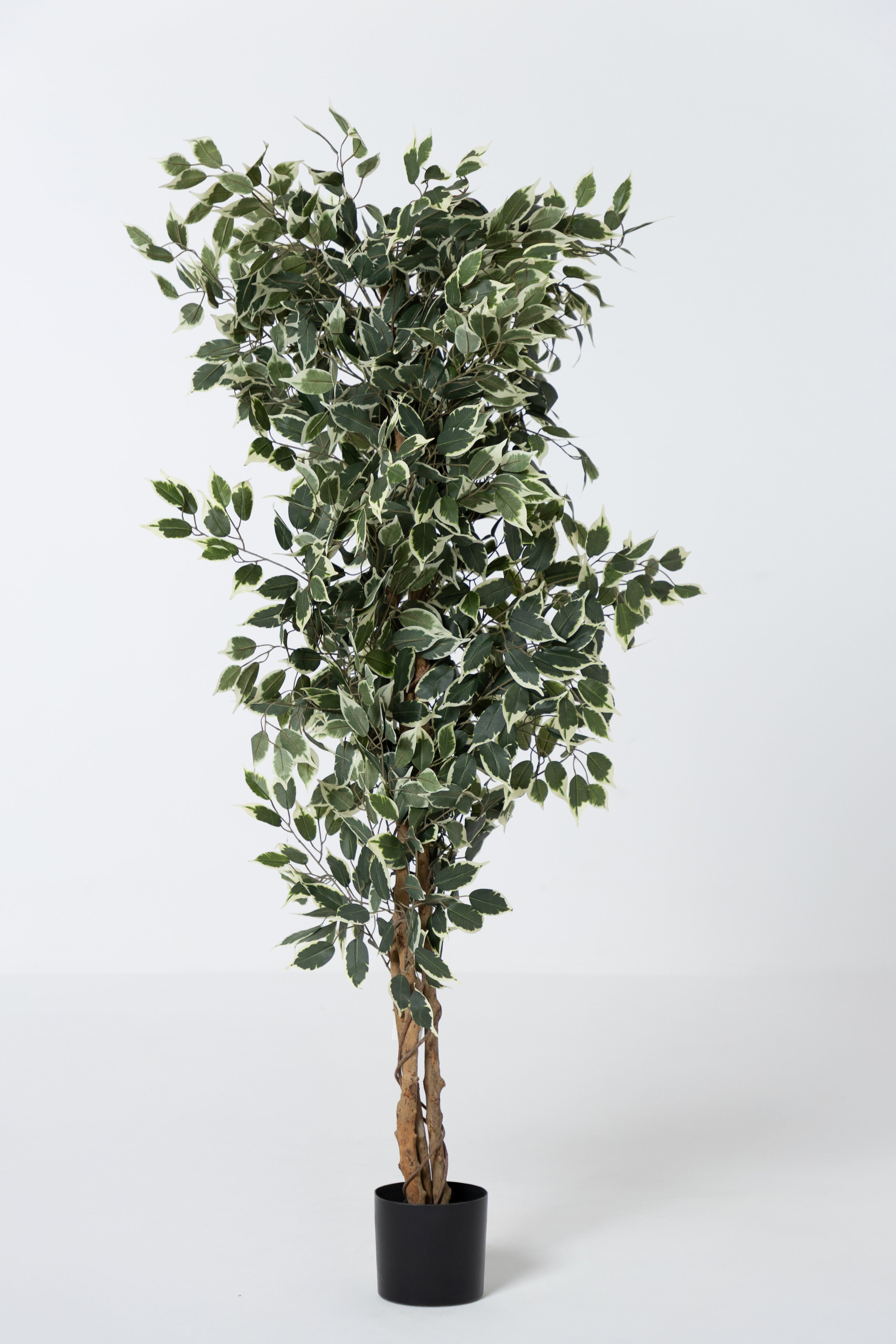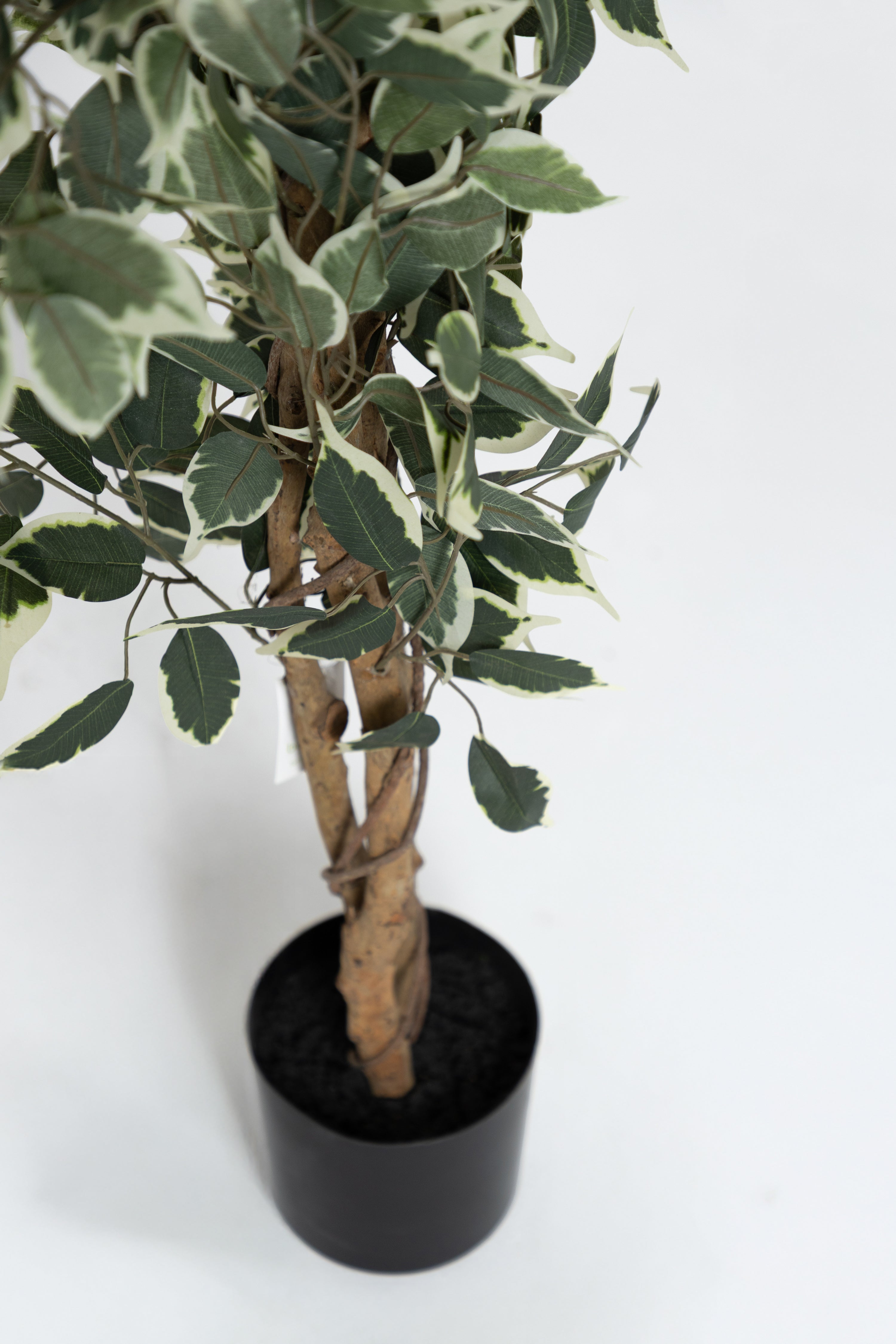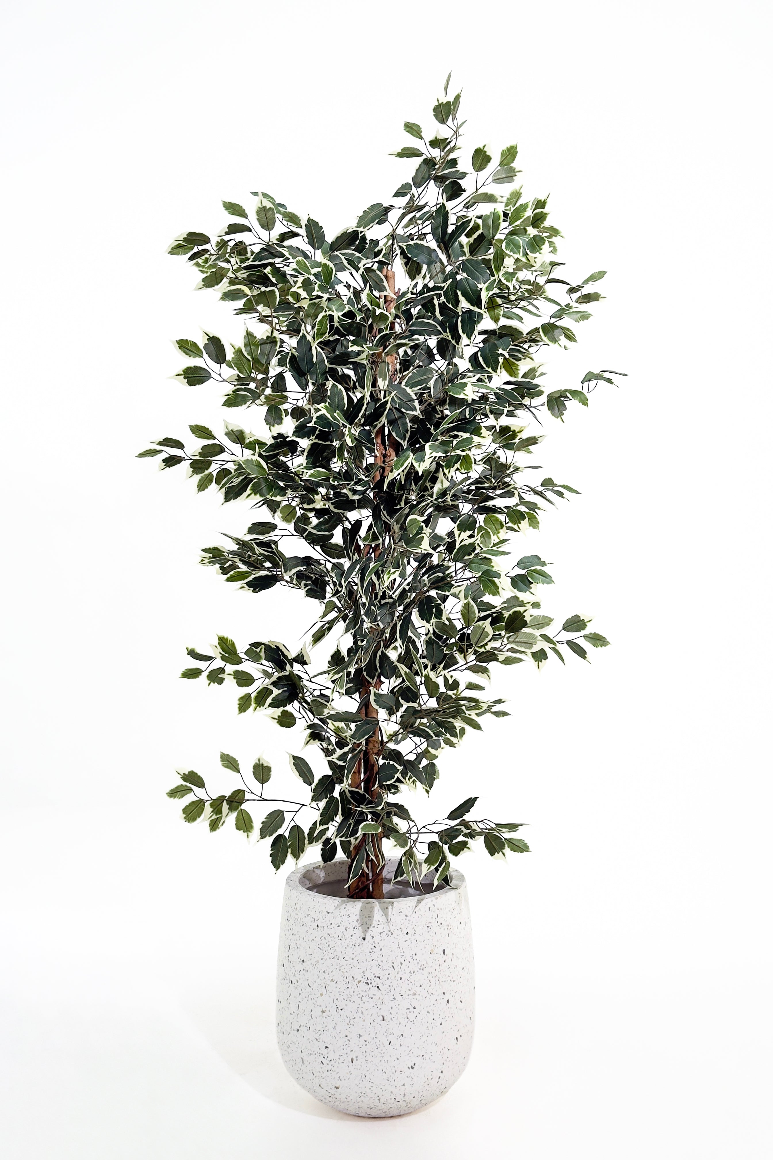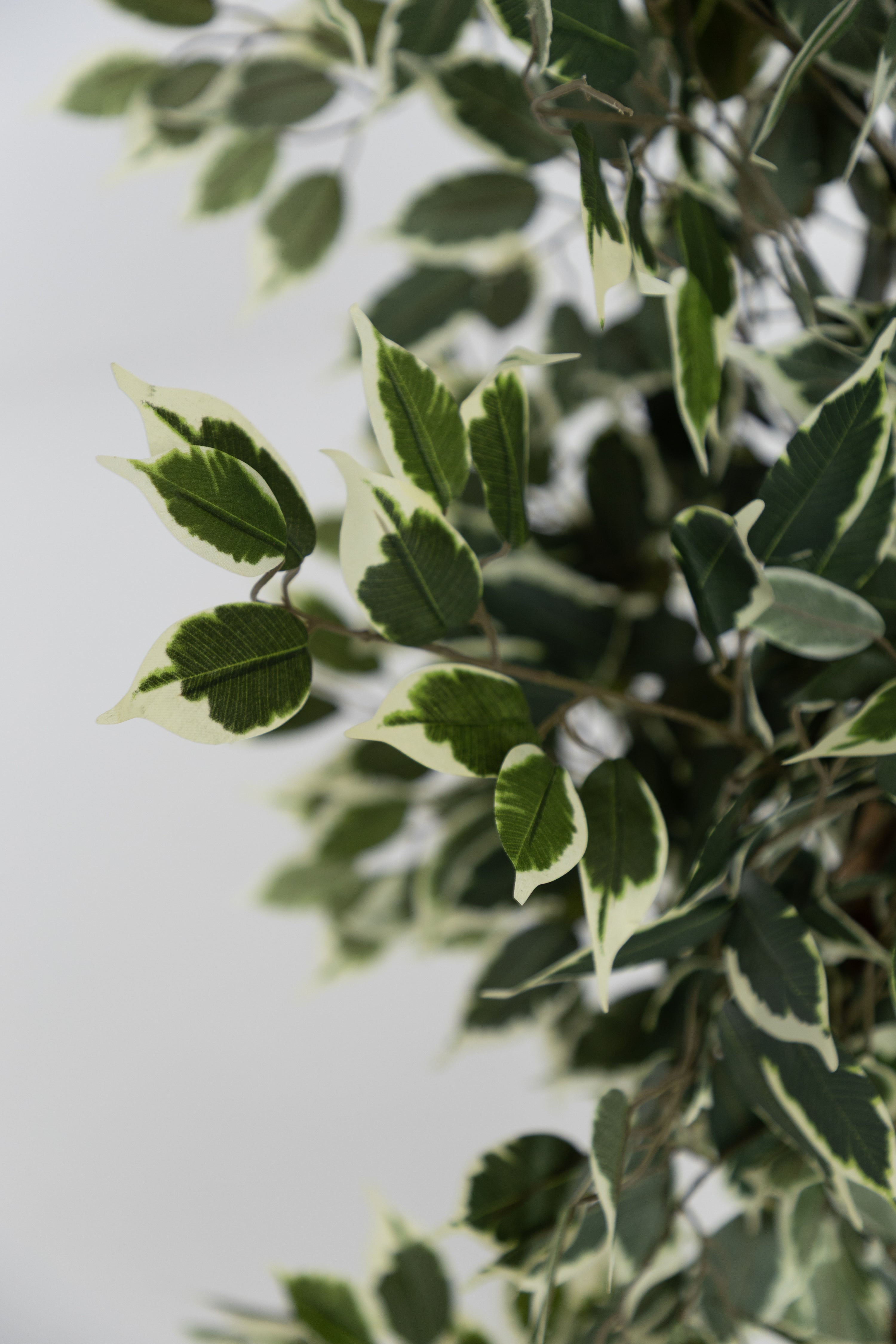 Featuring an abundance of gracefully arching branches and ultra-realistic, slender green leaves with soft variegation, this faux tree captures the refined elegance of the live Ficus Exotica. Each detail—from the vibrant foliage to the carefully textured, natural-looking trunk—is expertly crafted to offer a lifelike presence without the upkeep. Whether placed in a cozy corner or a stylish office lobby, this maintenance-free plant adds a timeless, evergreen charm to any interior.