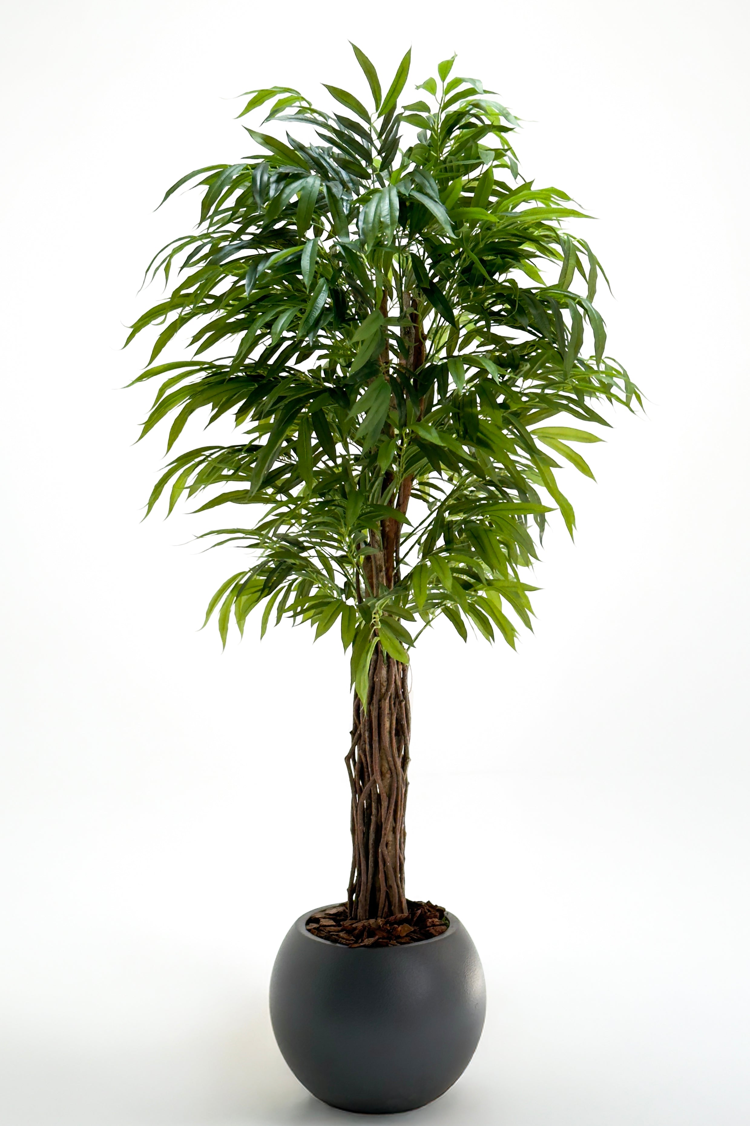 Showcasing realistic, elongated leaves in rich green tones and supported by braided, woody stems, this faux tree is a stunning, low-maintenance alternative to the real thing. Its natural height and lush foliage bring a refined, organic presence to living rooms, entryways, offices, or hospitality settings. Whether styled in a ceramic planter or woven basket, this Ficus brings sophisticated calm with zero upkeep.