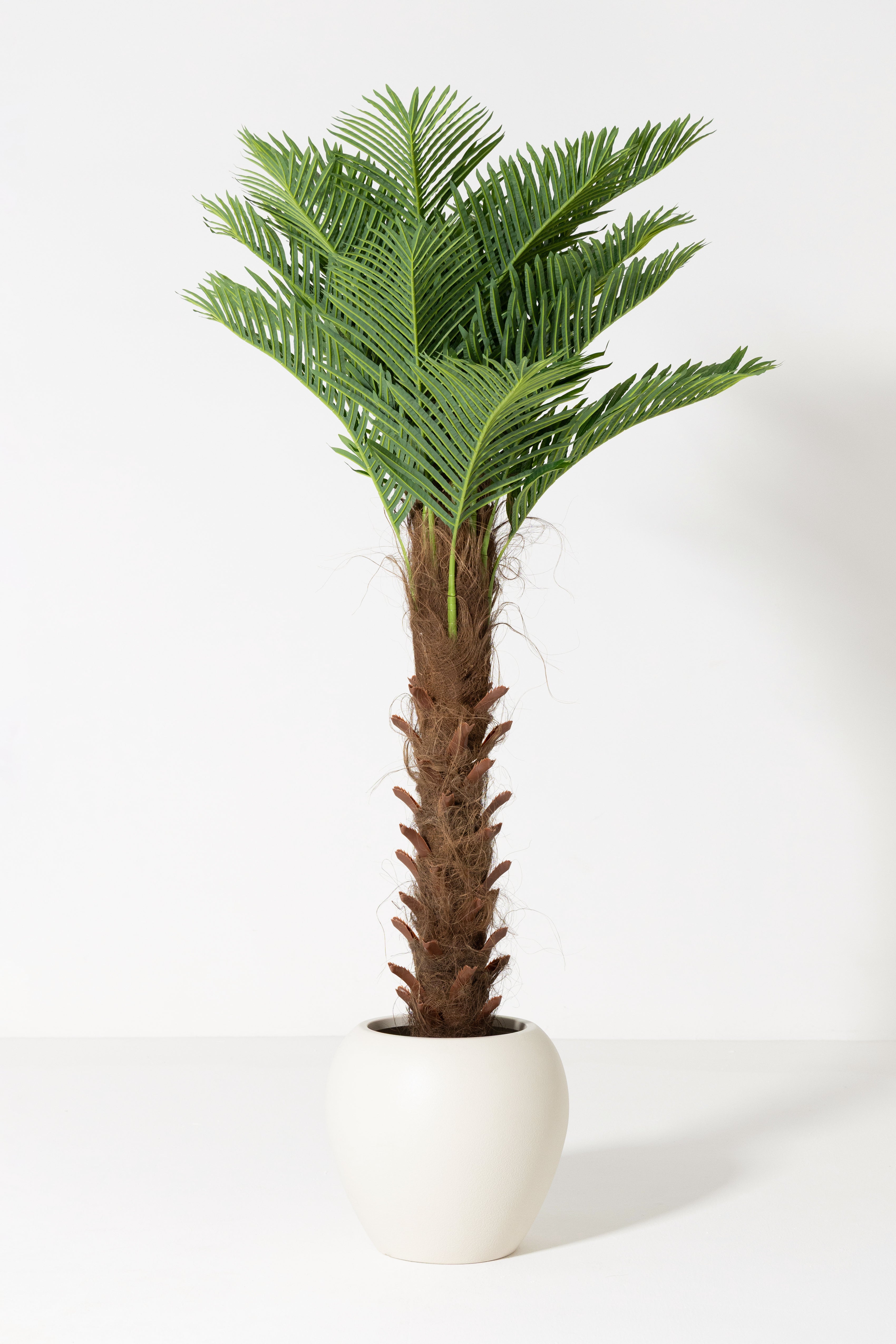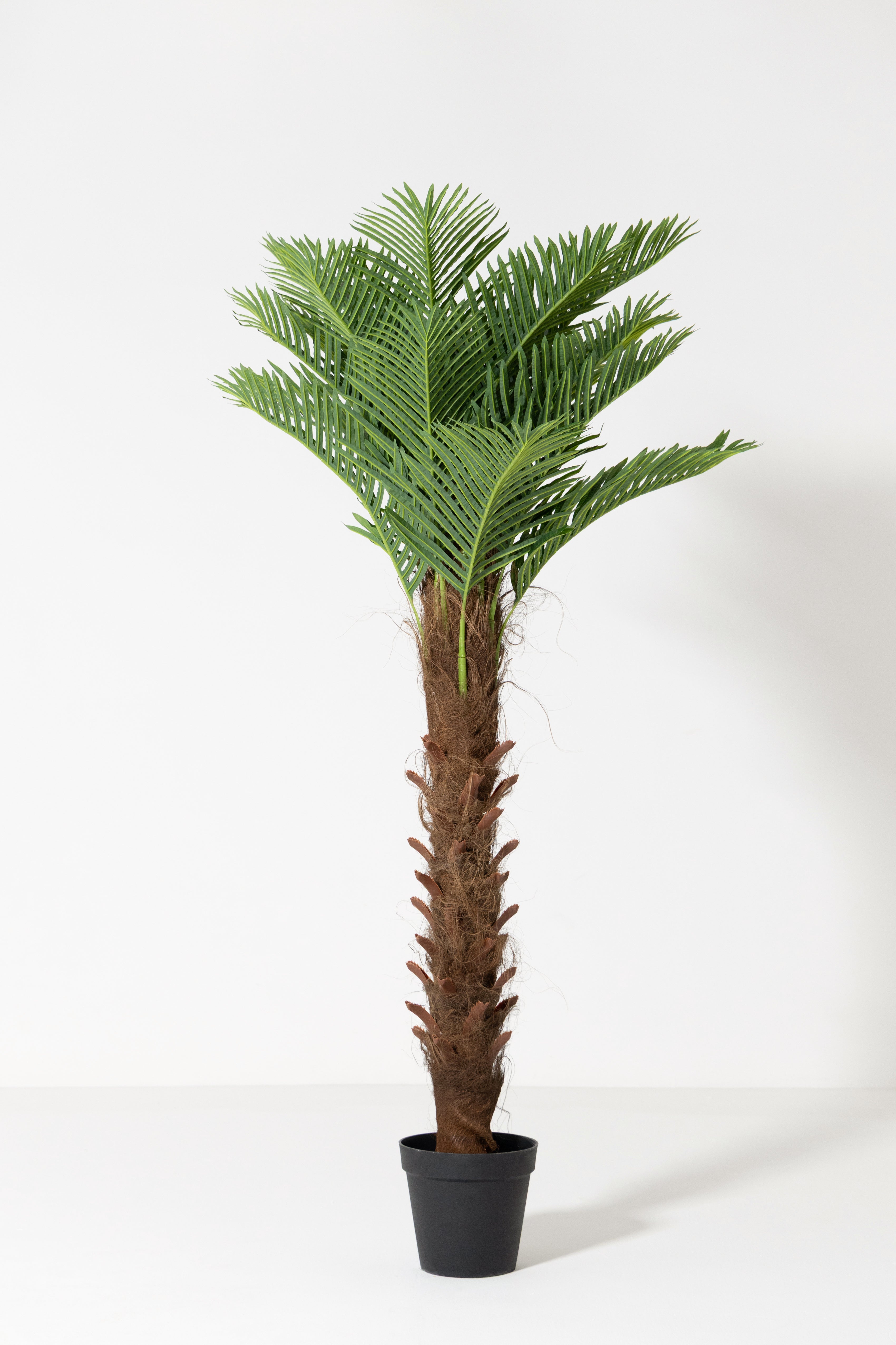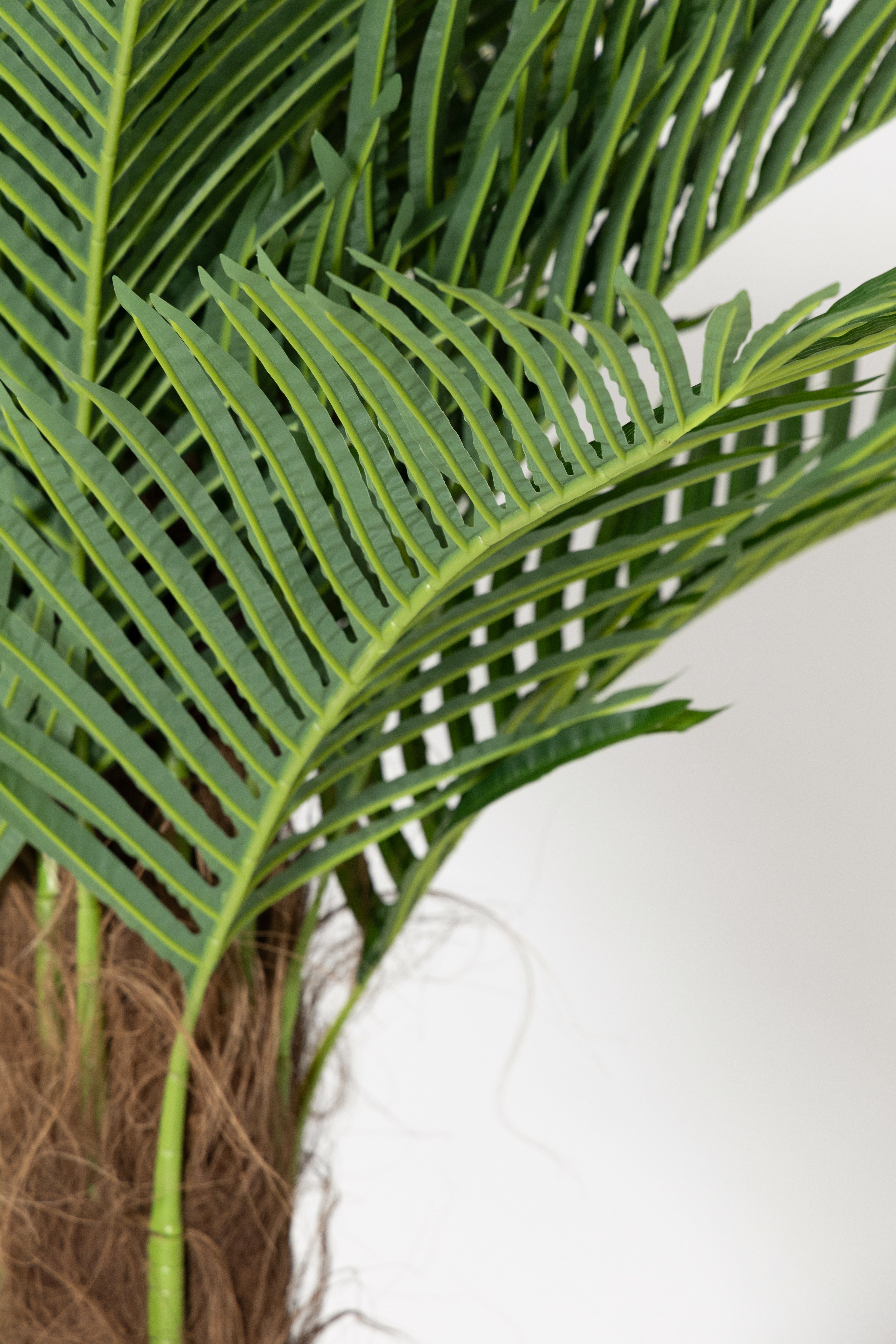 Bring a warm tropical touch into your space with lifelike palm greenery that instantly brightens the room. The tall textured trunk features natural brown fibers while the rich green fronds open into a full crown that feels calm and refreshing the moment you walk in. You become the curator of a sun soaked oasis, perfect for living rooms, entryways, offices or any corner that needs height and character. Designed to look hyper realistic in shape, color and texture, this statement piece adds dimension and a luxurious resort feel to your interior.