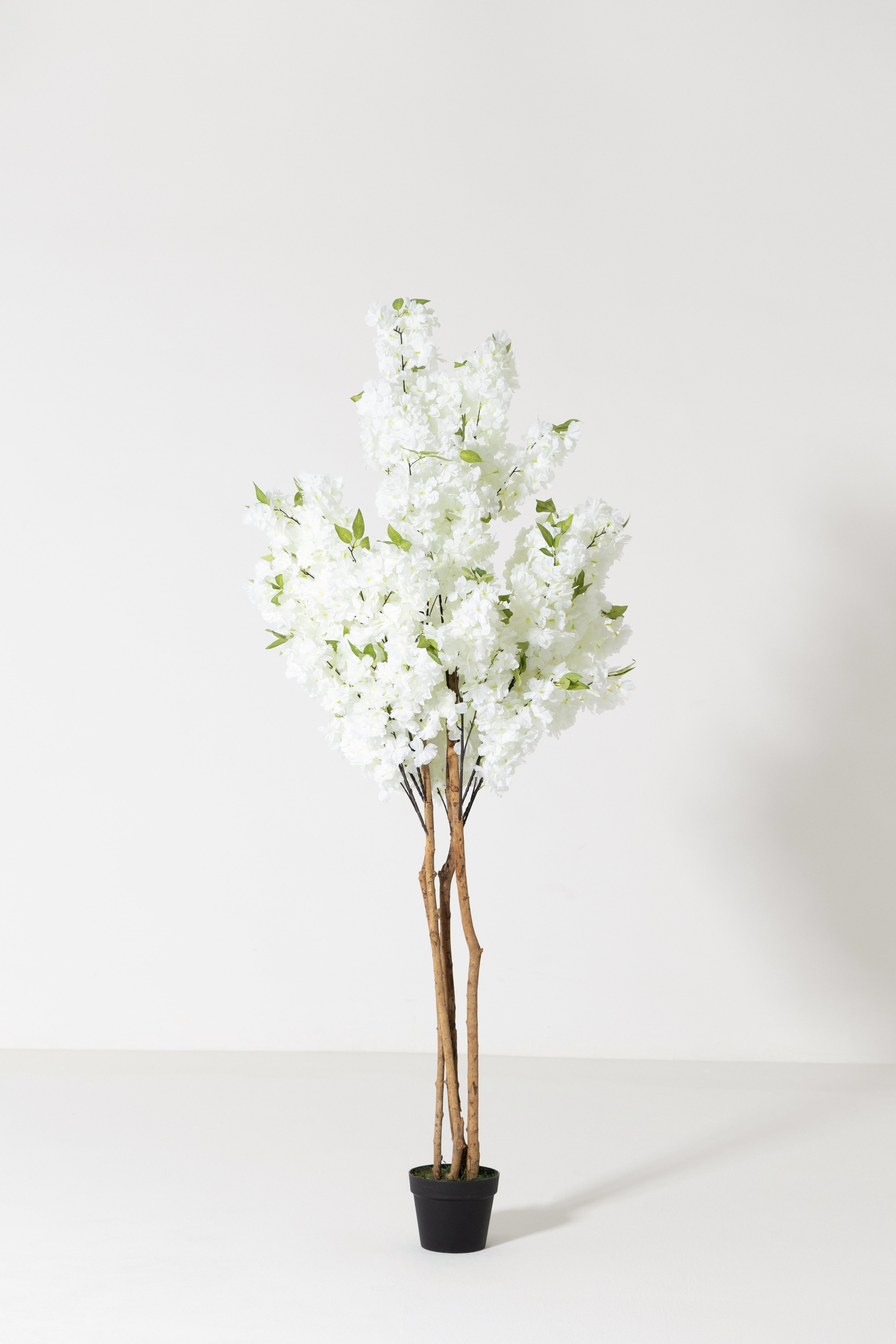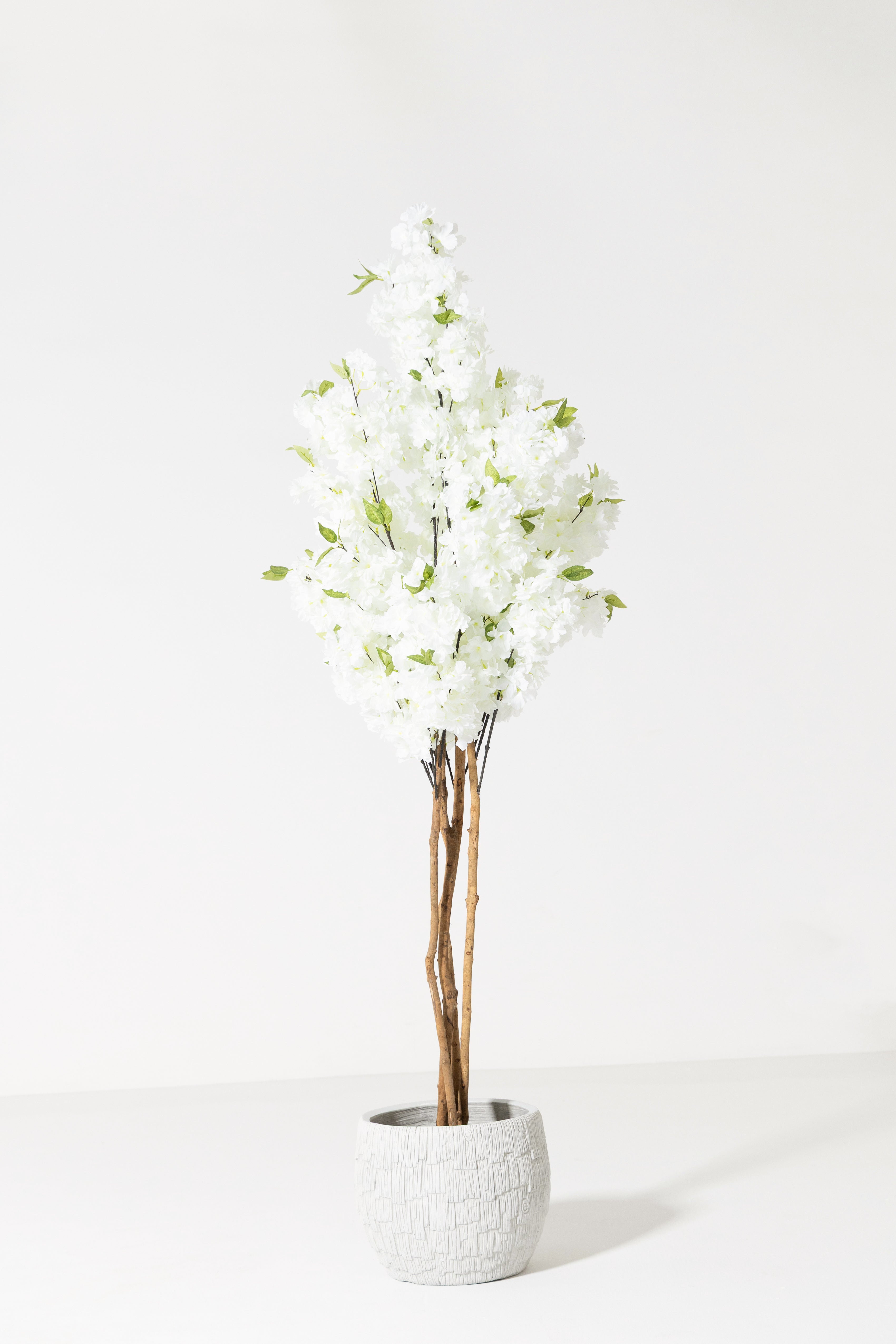 Soft white blossoms cascade from slender, natural-looking trunks, bringing a serene Japanese-inspired elegance that instantly elevates any setting. Standing at an impressive 180cm in height, this stunning arrangement creates a striking vertical presence while maintaining a calming, cloud-like softness. The lifelike blooms offer plush texture, and the beautifully branching structure adds graceful movement, volume, and visual harmony. Paired with fresh green leaves, the bright white flowers create a clean, airy color palette that blends seamlessly with modern, minimalist, and luxury interiors. Whether styled in an entryway, living room, boutique, or event setup, this statement piece delivers the timeless charm of cherry blossoms all year—effortlessly and without maintenance.