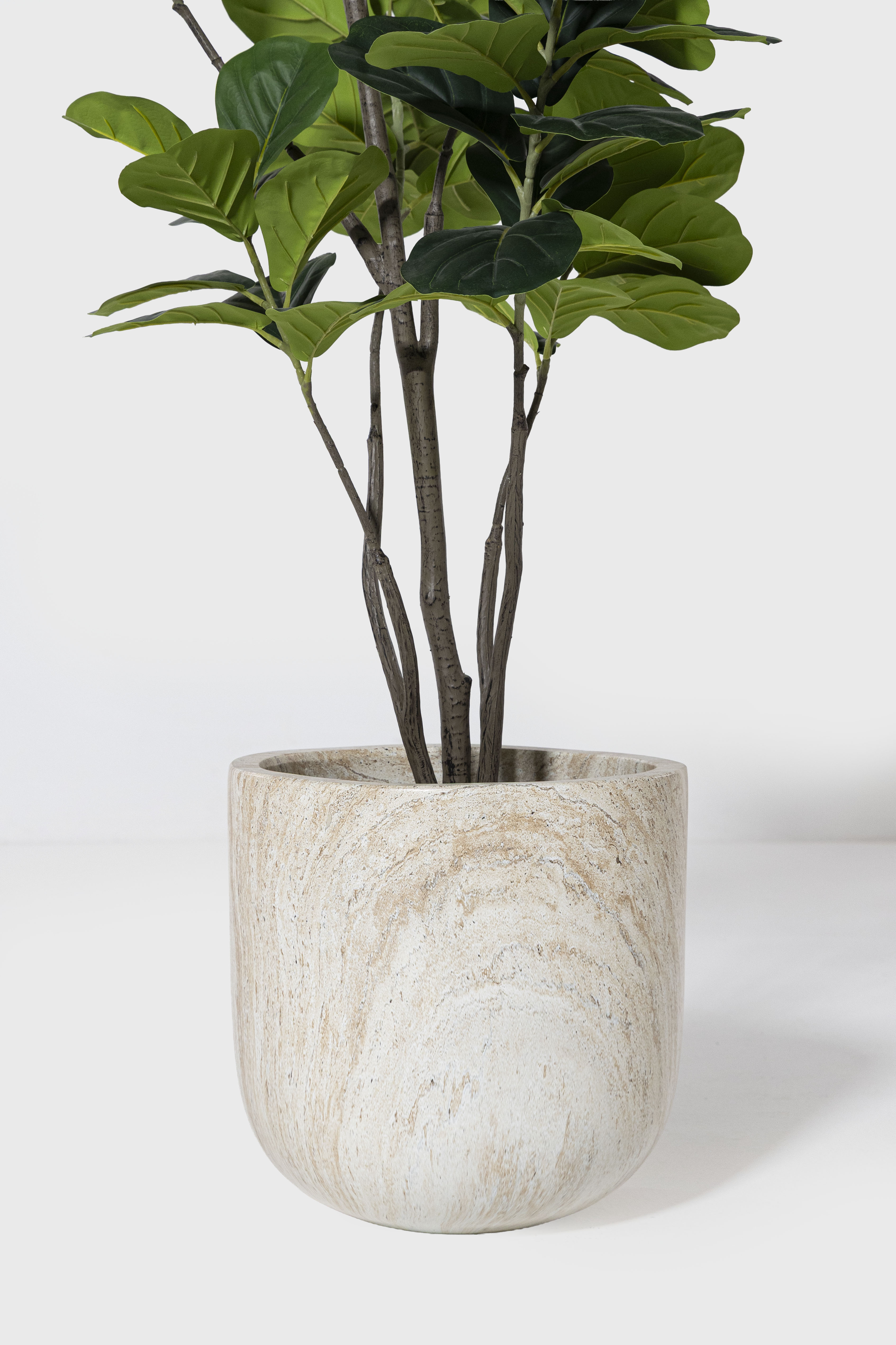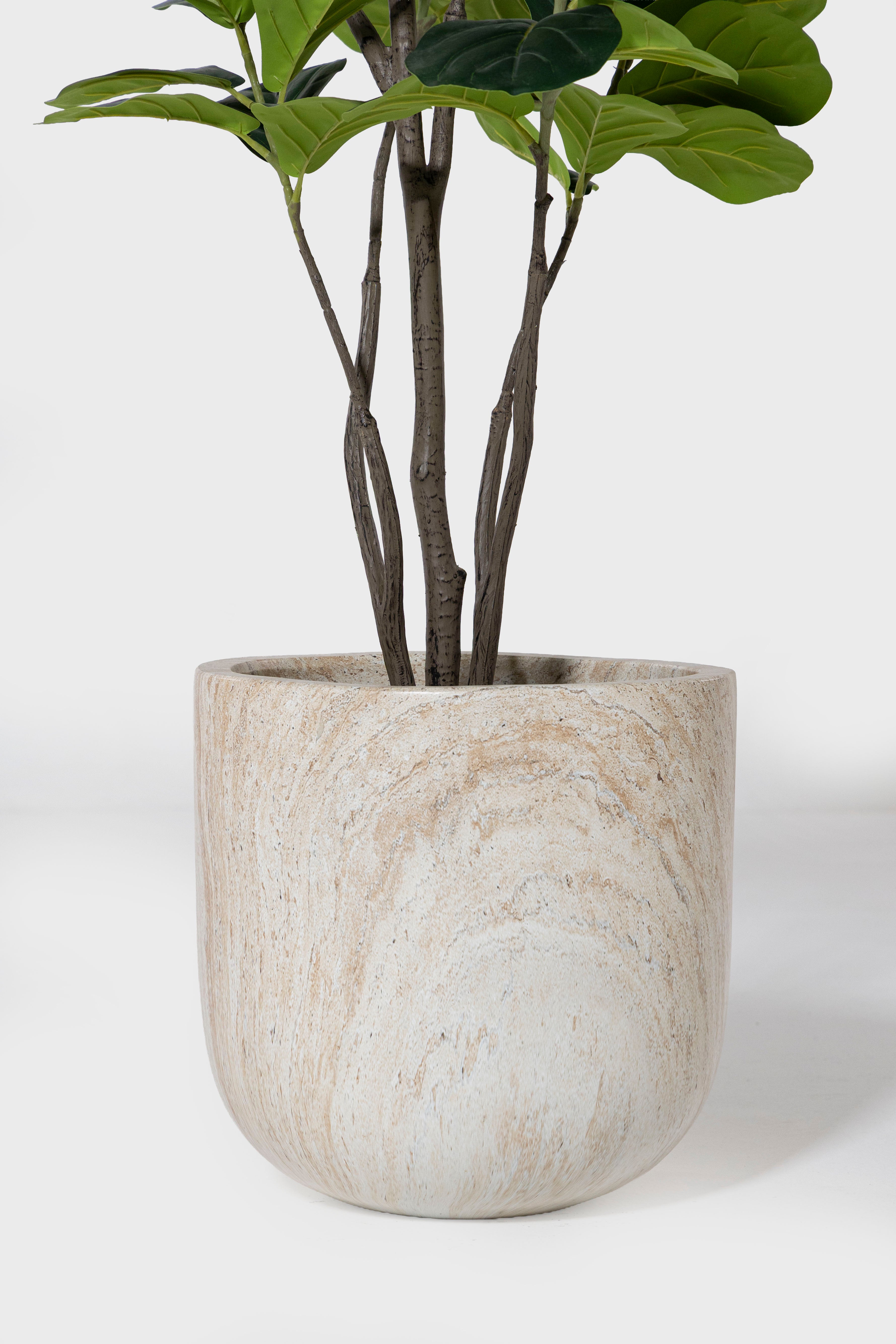 Bring refined elegance to your space with a pot crafted in a warm travertine inspired fibercement finish that showcases soft mineral movement and natural stone character across its smooth curved silhouette. Made from durable fibercement, it blends strength with the organic beauty of travertine, enhancing both indoor and outdoor environments with an earthy timeless presence. The gentle variation in tone adds depth and texture that complements greenery with an understated yet elevated contrast. With its minimalist cylindrical form and subtly textured matte surface, it offers a versatile and enduring design that works beautifully with real or artificial plants and suits residential or commercial settings with ease.