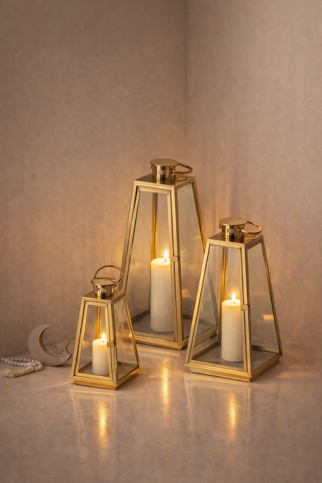 Illuminate your Ramadan evenings with this stunning set of three gold lanterns. Each lantern has a a sleek clean design, evoking a sense of beauty and spirituality. The gold finish adds a touch of elegance, making these lanterns perfect for creating a warm and inviting atmosphere during the holy month. Whether used as a centerpiece for your Iftar table or as a decorative accent in your home, these lanterns are sure to bring a sense of joy and peace to your Ramadan gatherings.