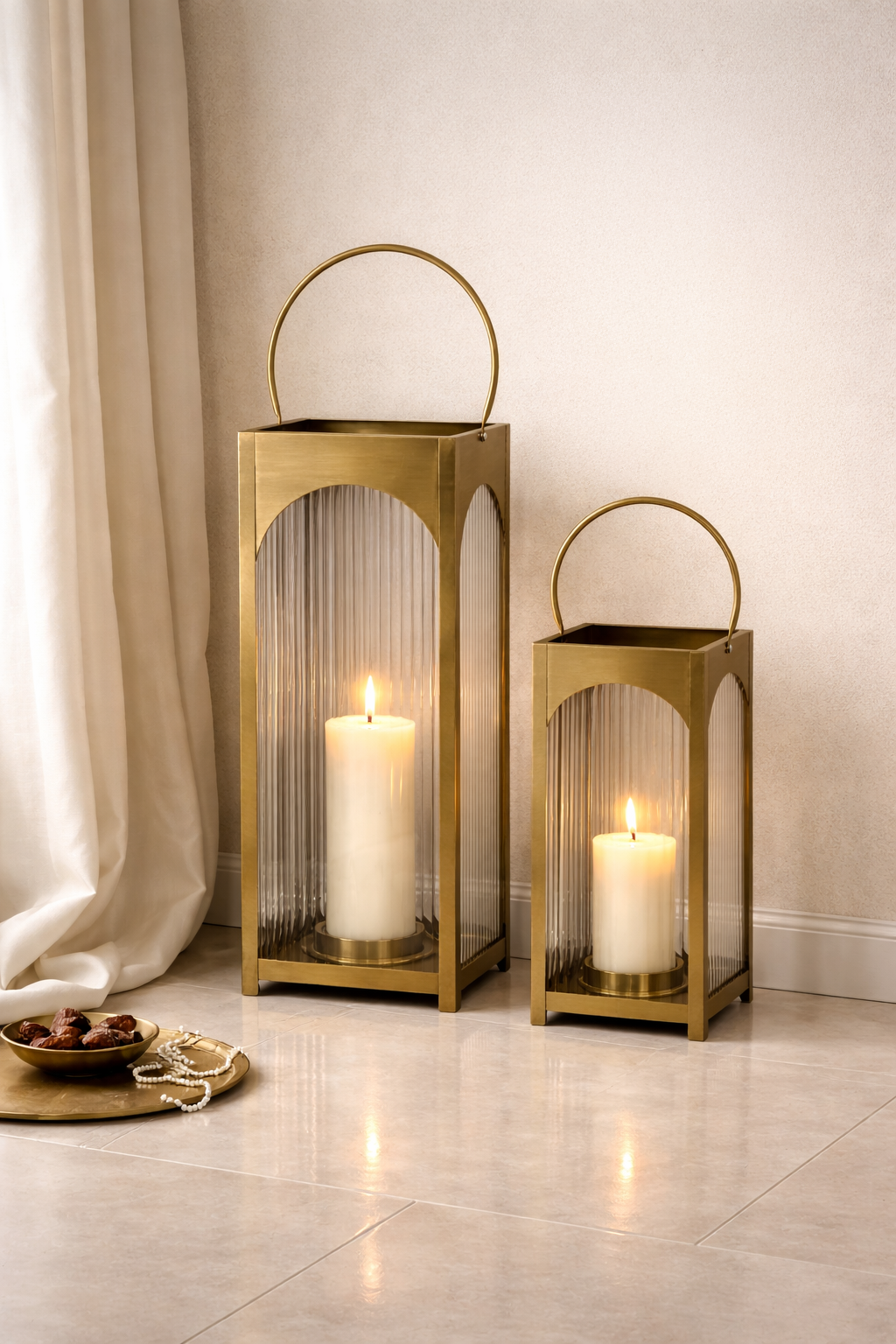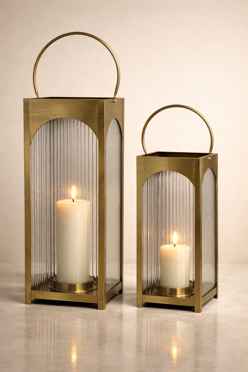 Bring a refined glow into your space with an architectural statement that feels both timeless and modern. Designed with an elegant arched frame, warm antique gold finish, and softly ribbed glass panels, this lantern turns candlelight into a calm, ambient shimmer that instantly elevates consoles, entryways, and dining settings. Style it solo for a sleek focal point or pair it with layered decor to create a cozy, luxury atmosphere that feels effortlessly curated.
