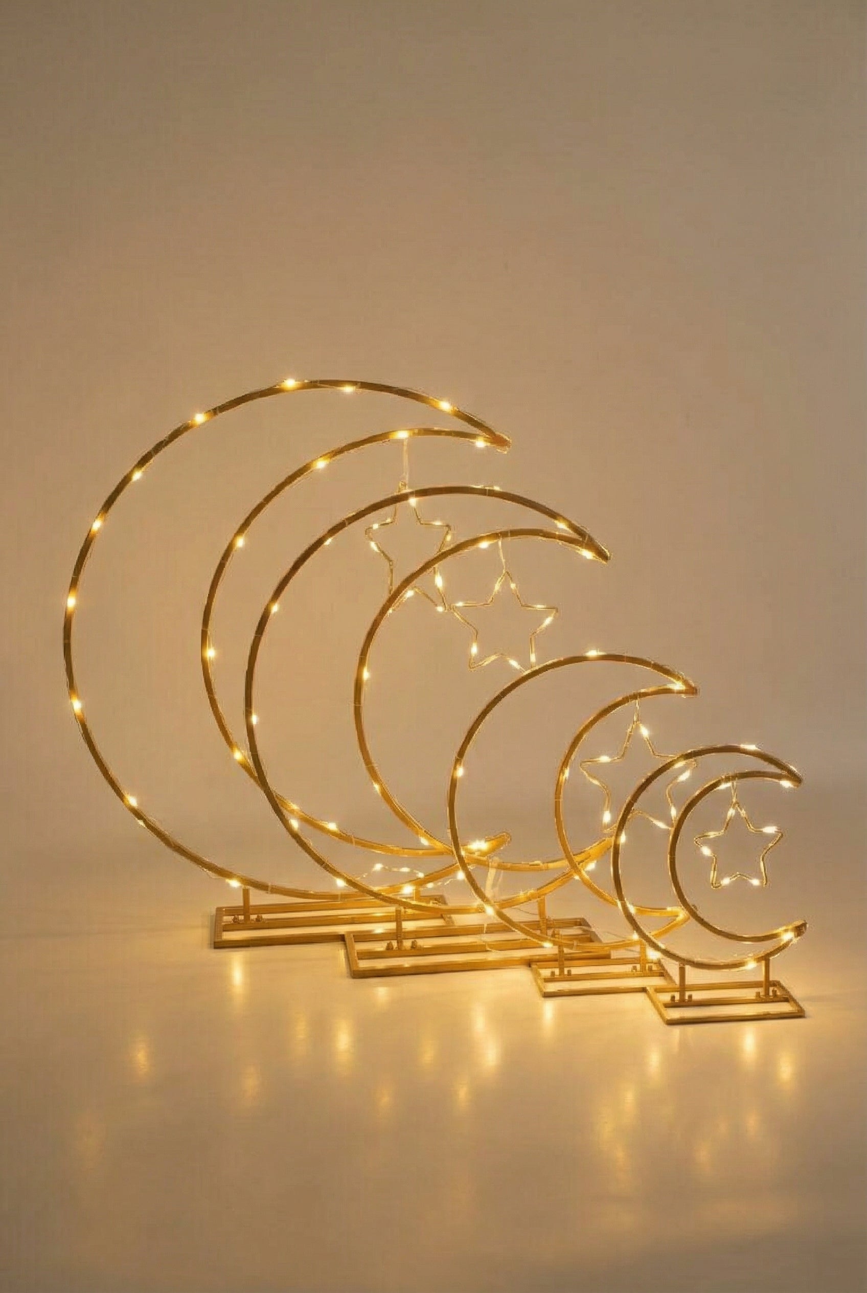 Add a touch of Ramadan charm to your home with this Crescent Moon & Star Decor with LED. Crafted with intricate detailing, this piece features a beautiful crescent moon and star design, symbolizing the spirit of the holy month. The built-in LED lights illuminate the piece, creating a warm and inviting glow that enhances the ambiance of any room.