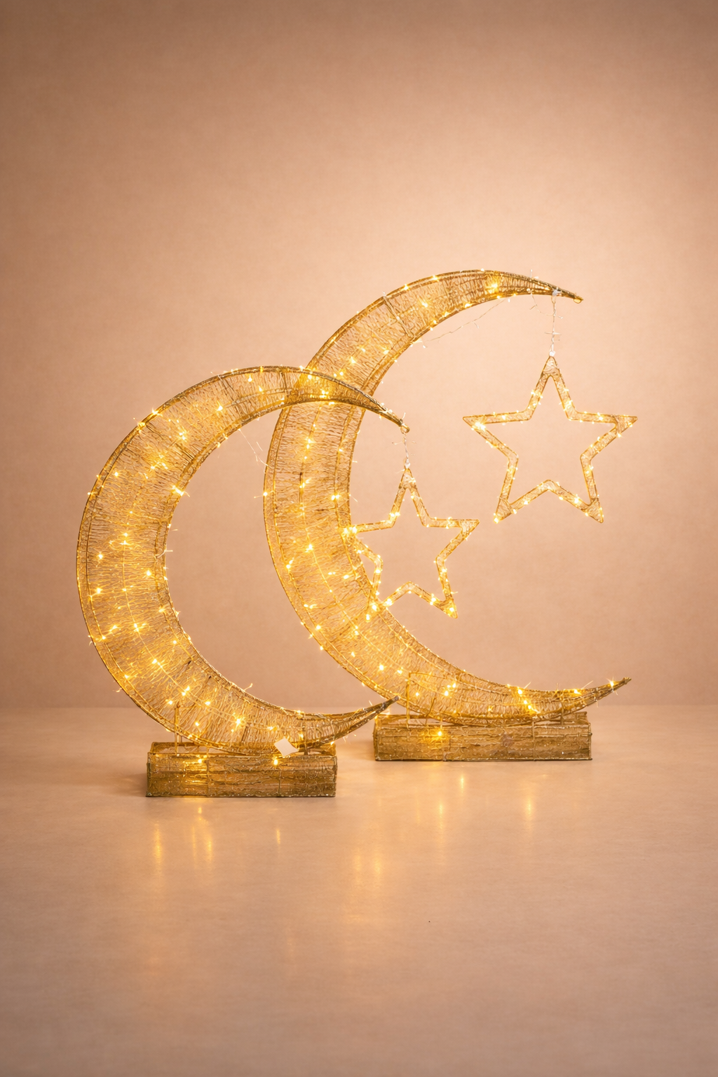 Illuminate your Ramadan gatherings with our exquisite Crescent & Star Ramadan Decor. Crafted in a radiant golden hue, this elegant piece features intricate detailing, including traditional motifs and delicate filigree. The inclusion of LED lights adds a warm and inviting glow, creating a magical ambiance in your home. Whether placed on a mantel, shelf, or table, this stunning decor piece is sure to enhance the beauty of your Ramadan gatherings and bring joy to your heart. Celebrate the season in style with our Crescent & Star Ramadan Decor.