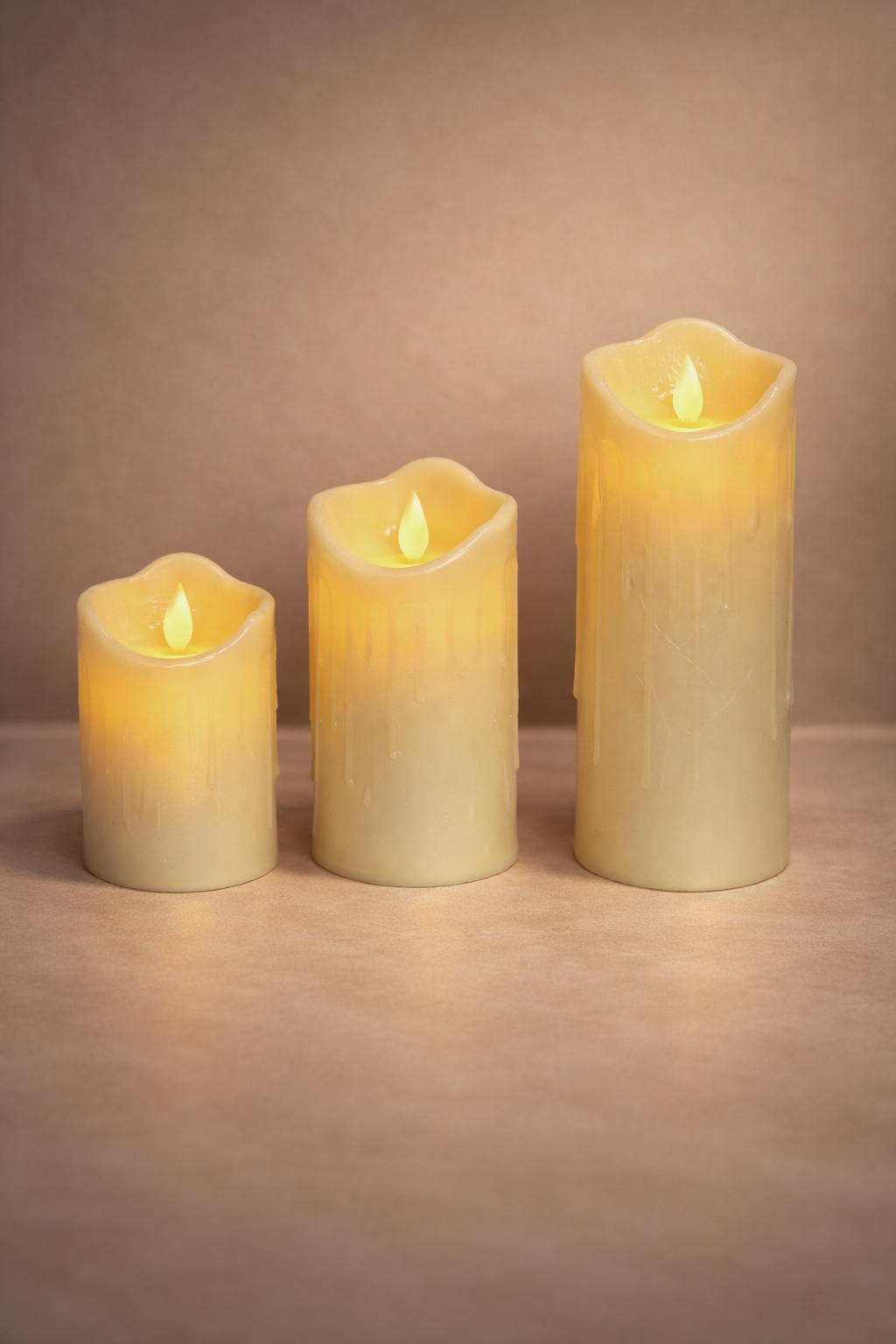 Create a warm and inviting atmosphere with these flameless LED flickering candles, designed to mimic the soft glow of real candlelight. The smooth ivory wax like exterior, curved top, and realistic flickering flame bring elegance to any space, while the battery-powered design ensures safety and convenience. Perfect for home decor, weddings, or cozy evenings, these LED candles offer a hassle-free alternative to traditional wax candles without compromising ambiance.