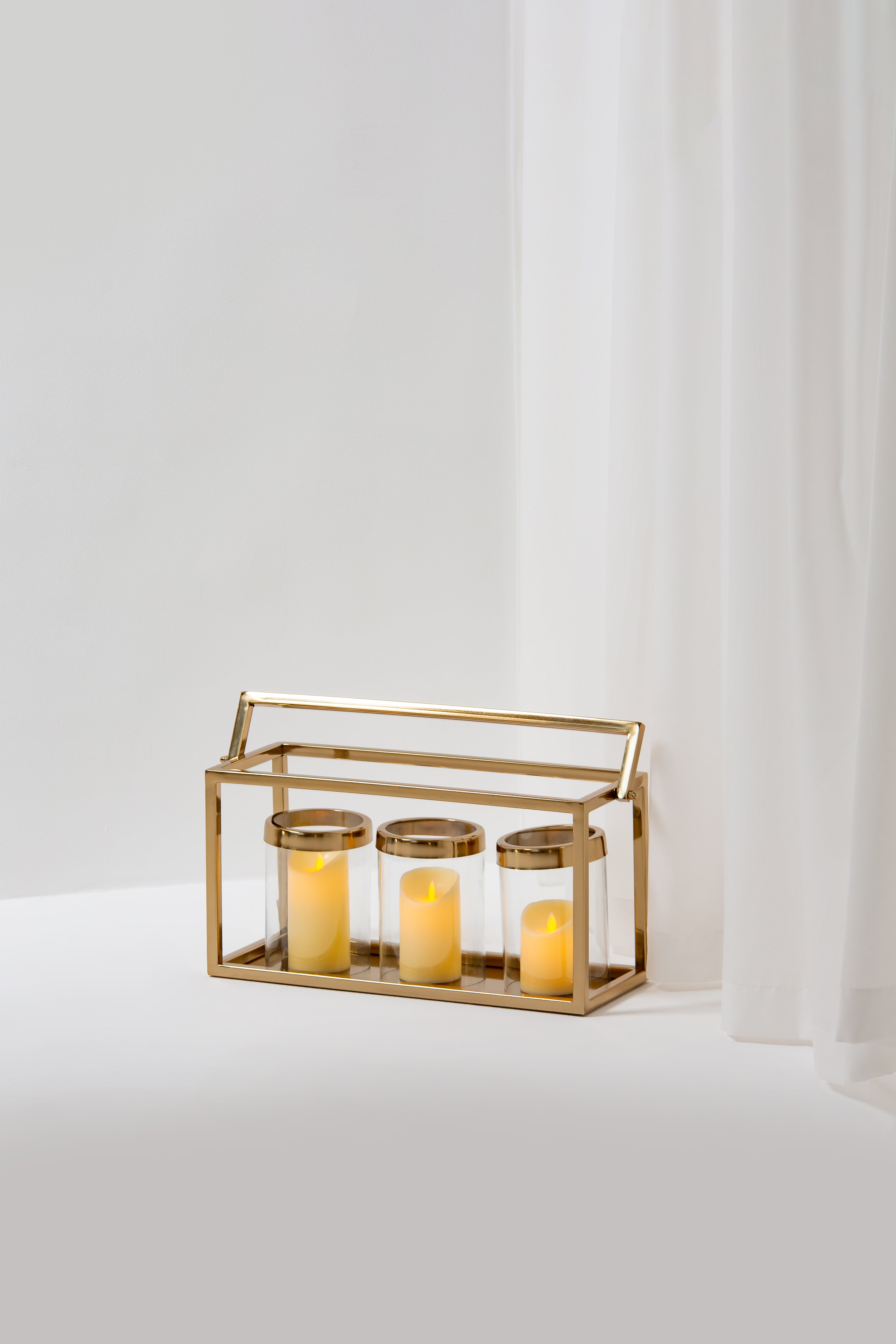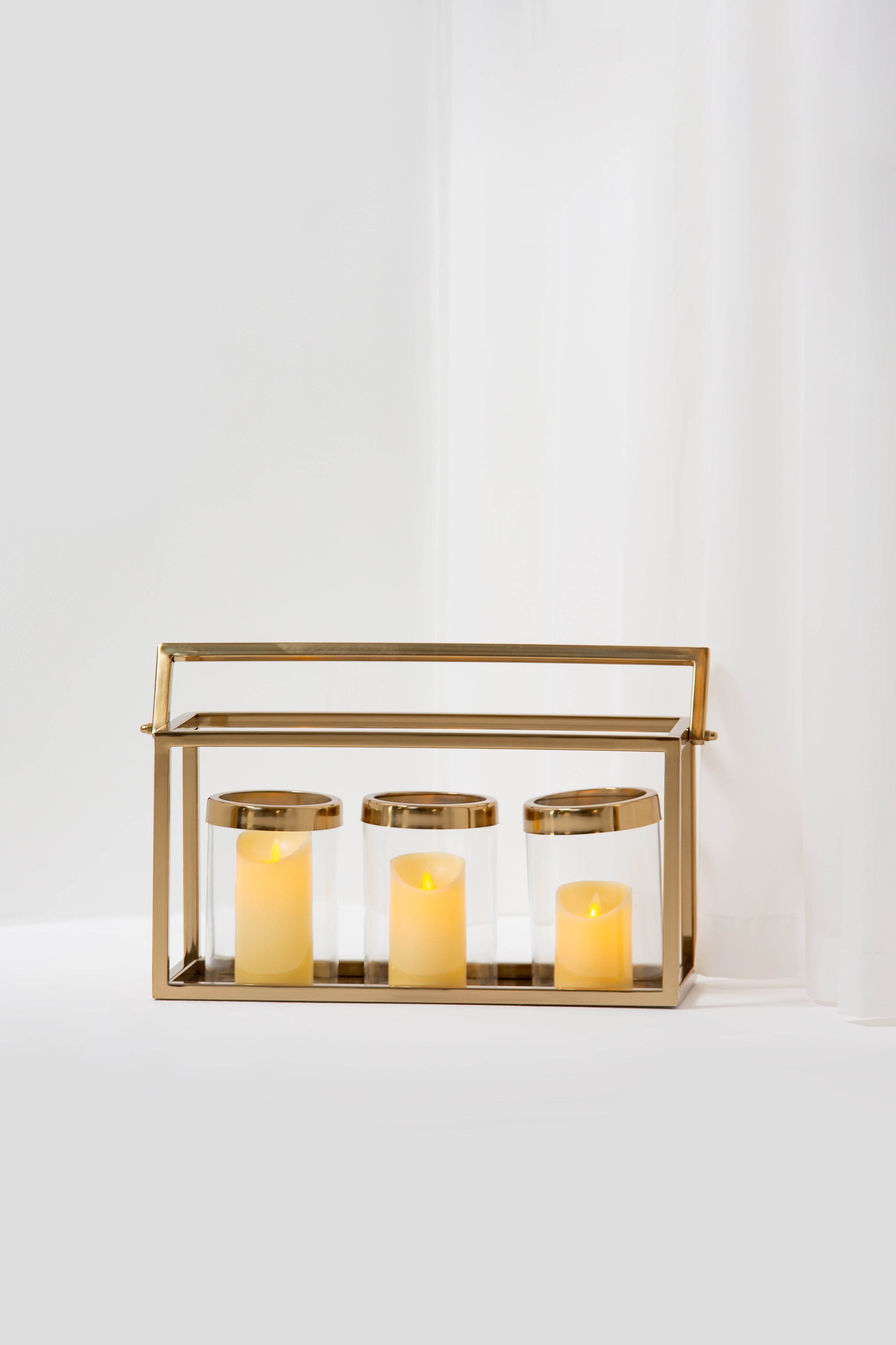 This sleek candleholder, crafted from stainless steel and glass, showcases a modern design with clean lines and a radiant gold finish. The open rectangular frame elegantly encases 2 & 3 glass cylinders, providing a sophisticated glow to any indoor setting. Ideal for enhancing your living room or dining table, this stylish piece adds a touch of warmth and luxury.