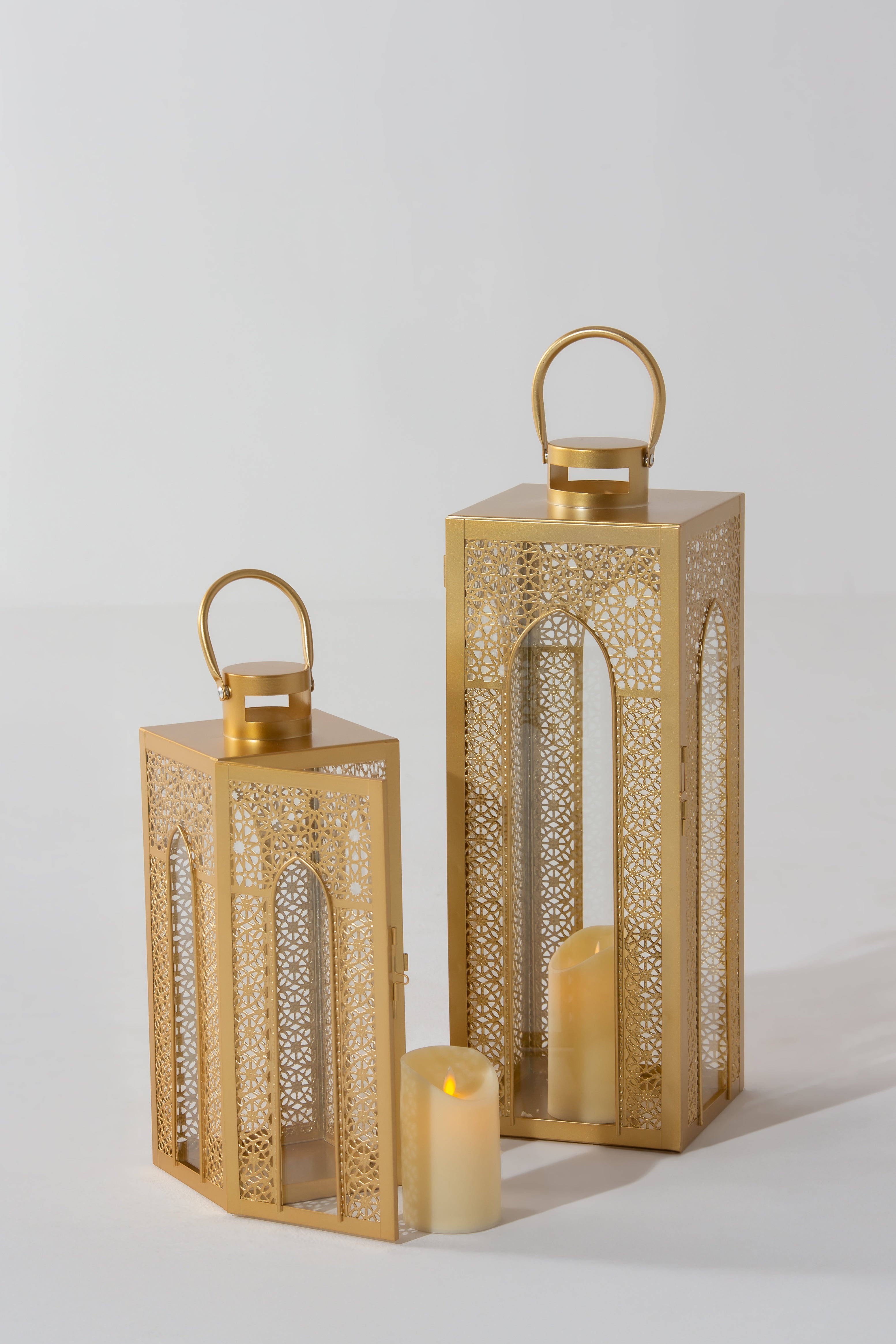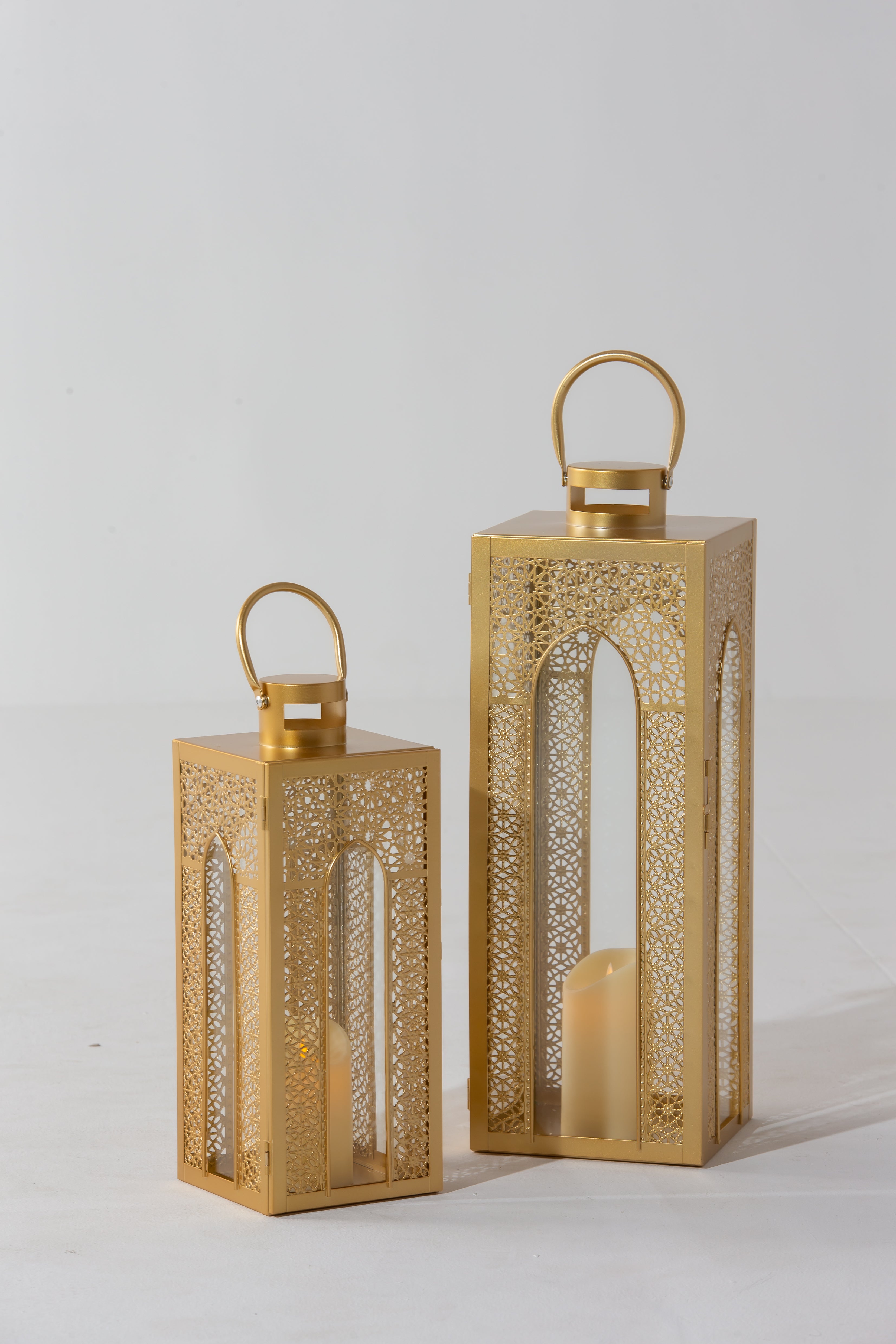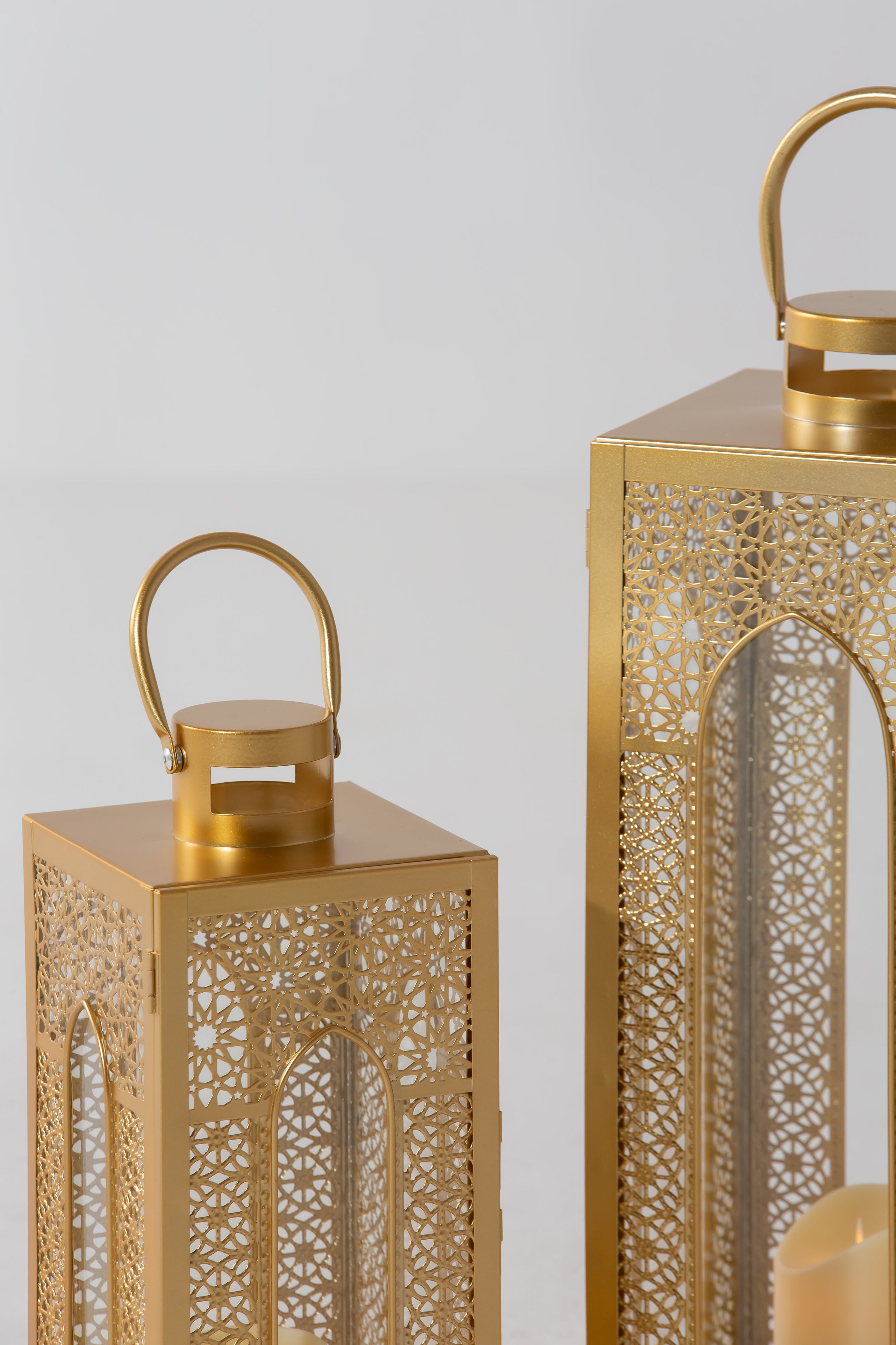 Transform your home with the enchanting glow of these gold lanterns. Crafted with intricate geometric patterns on a tall, rectangular frame, they cast mesmerizing shadows, perfect for Ramadan and Eid décor. The openwork design and sturdy handle make them a versatile statement piece for indoor and outdoor settings. Add warmth and elegance to your space with their timeless charm.