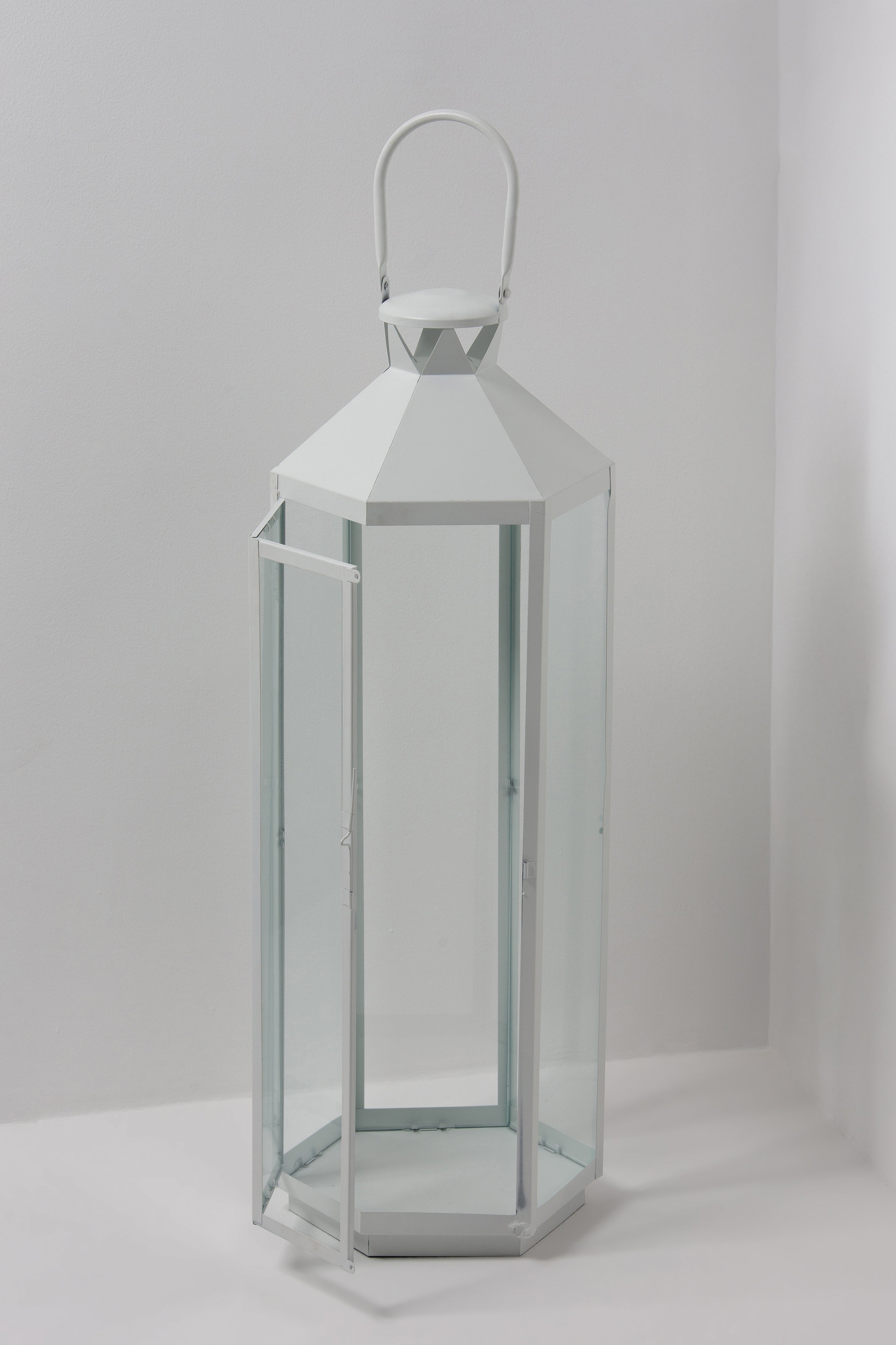 Bring a warm, inviting glow to your space with these elegantly crafted lanterns, featuring a crisp white metal frame and clear glass panels. The hexagonal design adds a modern touch, while the sleek handle allows easy placement indoors or outdoors. Whether styled alone or grouped, these lanterns create an ambient setting, perfect for any occasion.