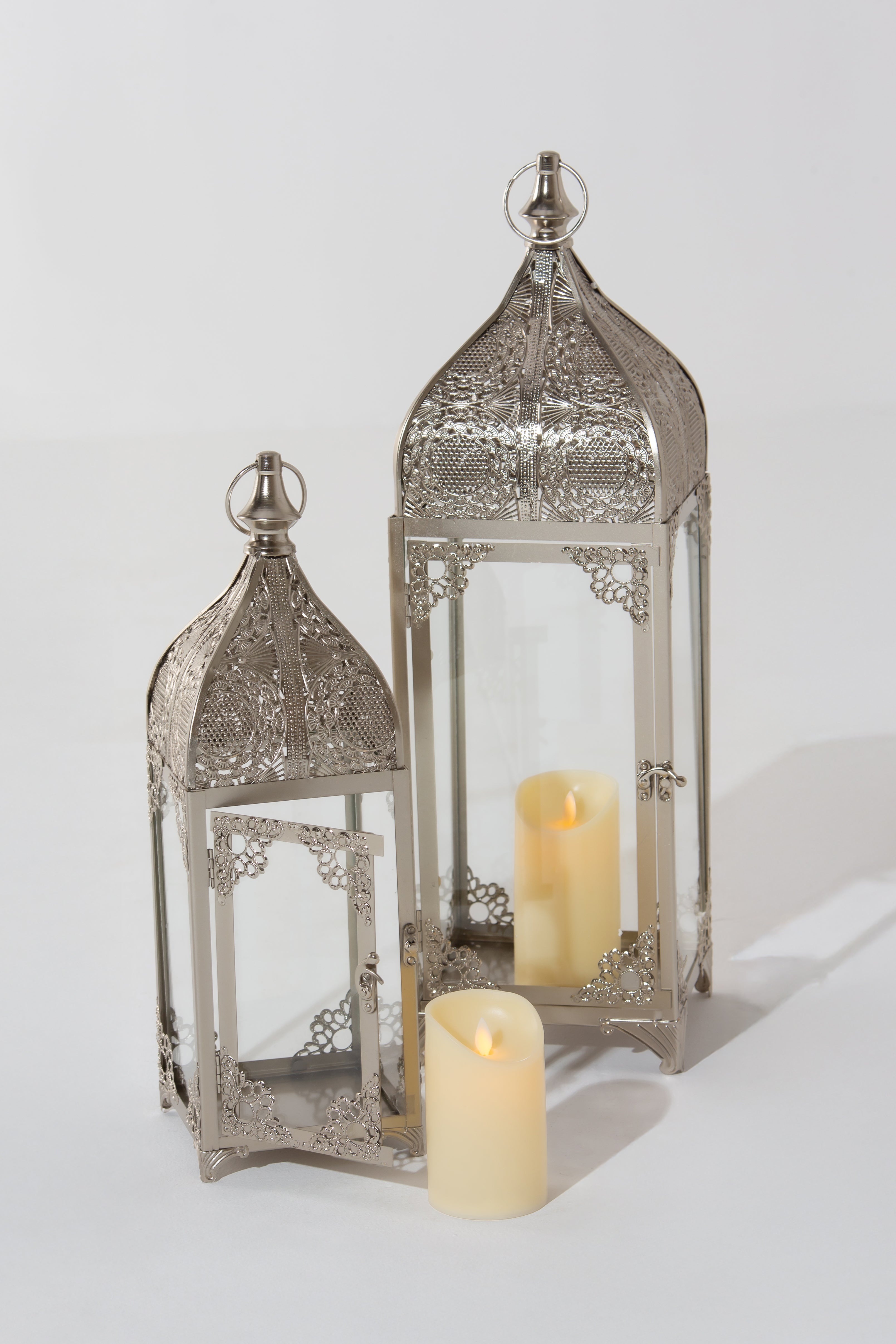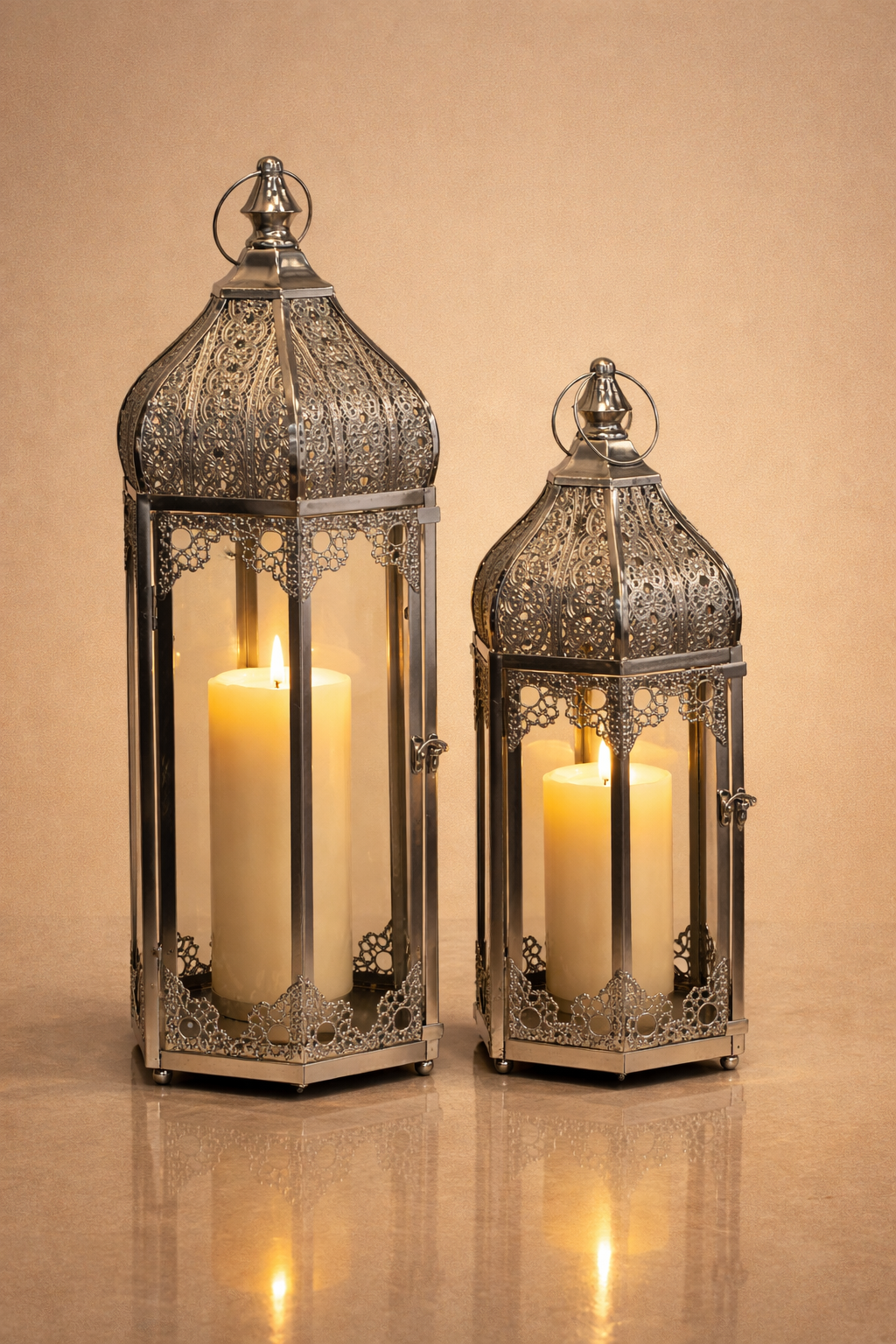 Elevate your space with the intricate charm of these silver lanterns, featuring a domed top, filigree metalwork, and clear glass panels. The reflective silver finish enhances the soft candlelight, creating a mesmerizing glow for Ramadan, Eid, or everyday elegance. With ornate floral details and arched accents, these decorative lanterns are perfect for indoor and outdoor settings, whether placed on a table or hung from a hook.
