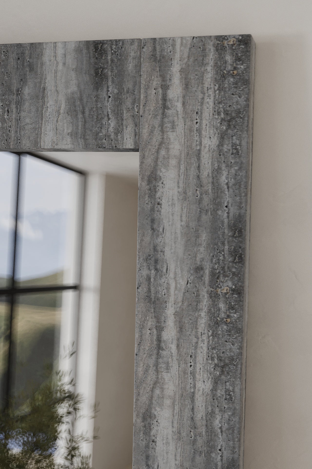 Transform your space with this travertine mirror, a statement of refined elegance. Its bold, rectangular silhouette and rich travertine texture add depth and sophistication to your interiors. The natural stone finish enhances light and space, creating a luxurious ambiance. Perfect for modern, contemporary, or rustic décor, this mirror brings timeless charm to your entryway, living room, or bedroom.