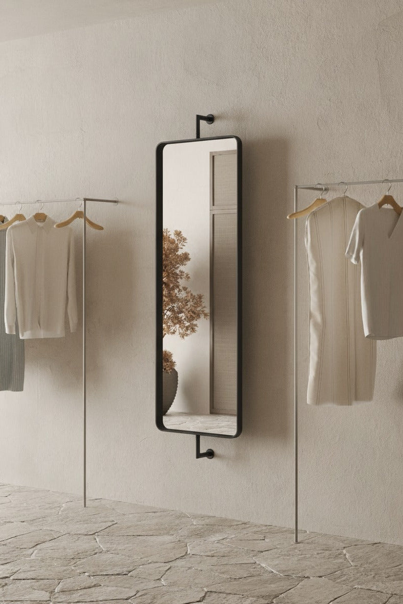 You elevate your space with a modern rotating wall mirror designed to shift gently left and right, allowing you to adjust your view with effortless precision. The sleek black frame adds depth and contrast, while the elongated shape reflects more light and height, opening up compact areas and enhancing your daily routines. Its slim silhouette and smooth swivel motion create both function and visual interest, working beautifully against textured or plain walls and blending seamlessly with minimalist, contemporary and classic interiors. More than a mirror, it becomes an interactive detail in your home, offering clarity, flexibility and timeless elegance.