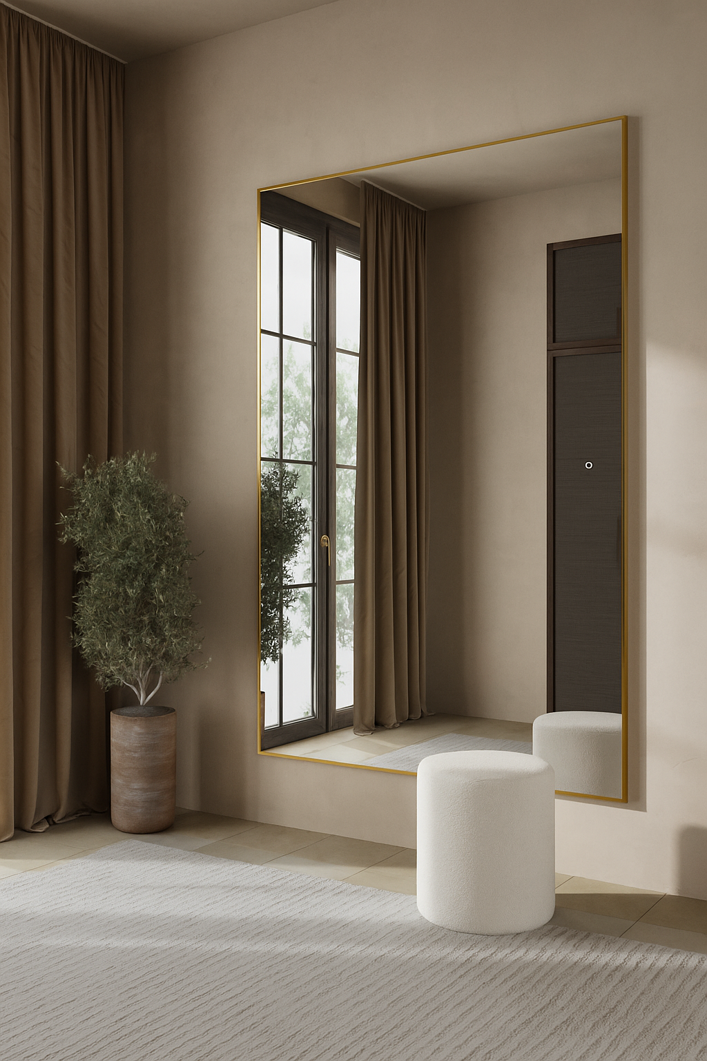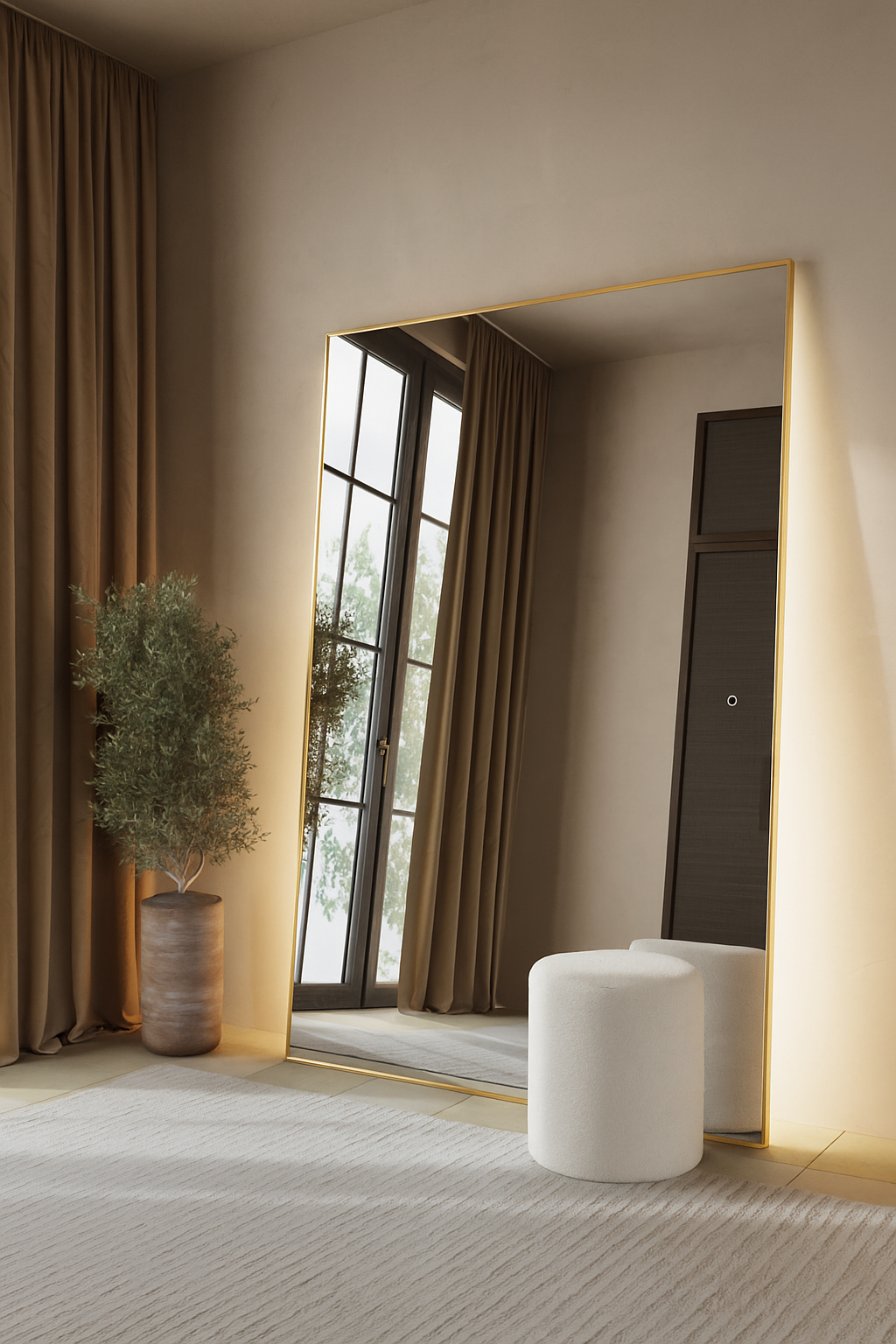 A masterpiece of modern luxury and functionality. Imagine standing before its expansive, crystal-clear surface, framed by a sleek brushed-gold border that exudes sophistication. The integrated warm LED backlighting casts a soft, ambient glow, enhancing both your reflection and the room’s atmosphere. Its tall, rectangular shape visually expands your space, while the minimalist design complements contemporary, classic, or luxe interiors. Perfect for bedrooms, dressing areas, or living spaces, this large gold LED mirror transforms everyday moments into a stylish ritual.