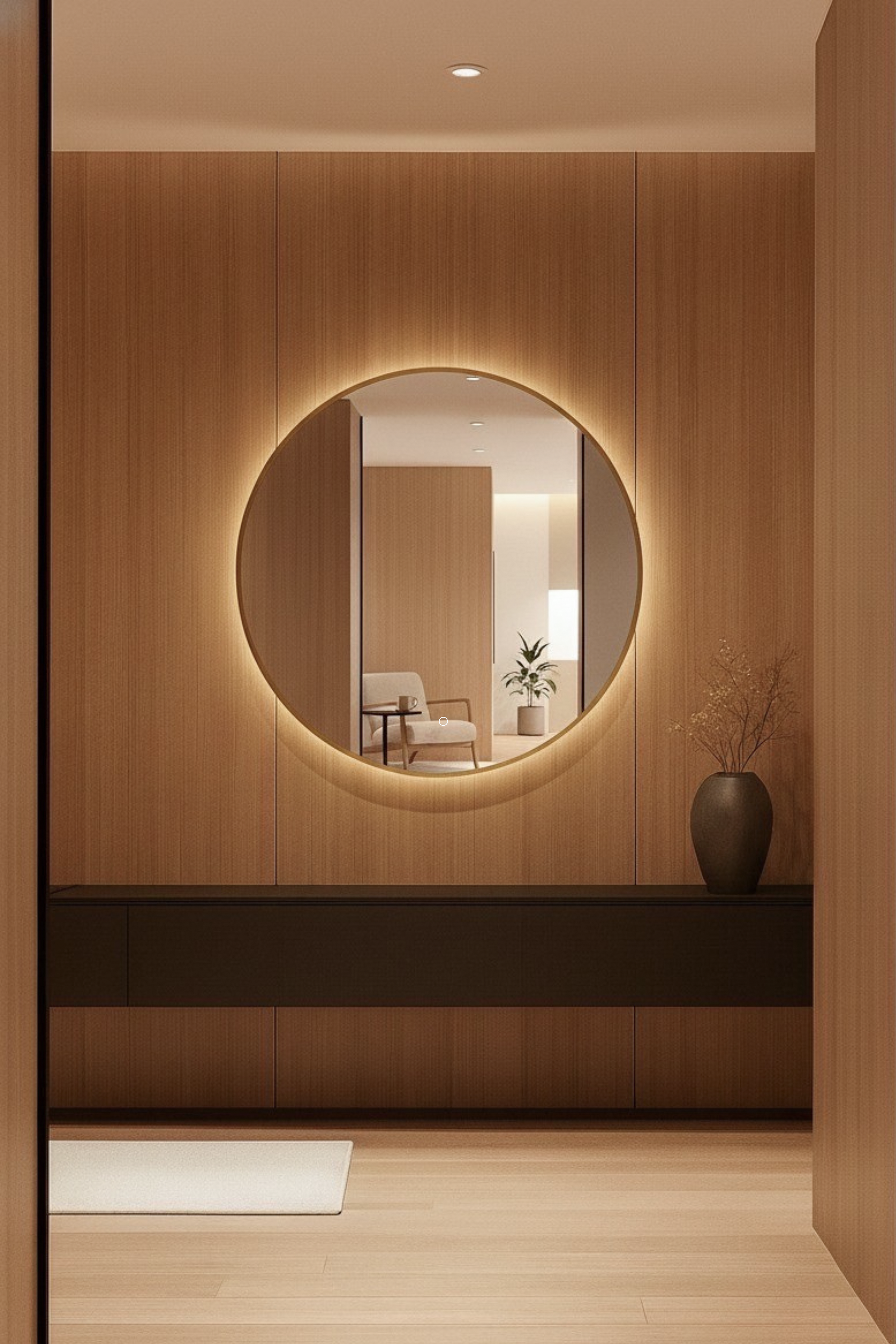 Designed to elevate your home's modern aesthetic, this circular LED mirror features a refined gold frame that adds warmth, elegance, and a touch of luxury to any space. Its integrated backlit LED lighting creates a soft, ambient halo that enhances both mood and functionality, making it ideal for entryways, bathrooms, or dressing areas. The high-definition mirror delivers a crisp, clear reflection for makeup, grooming, and daily routines, while the minimalist silhouette and metallic finish offer a clean, contemporary look. Seamlessly blending stylish design with everyday practicality, this wall-mounted mirror becomes a versatile and sophisticated focal point for modern interiors.