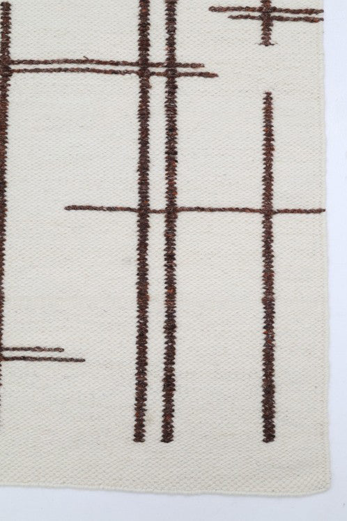 Set a clean, modern base with this handwoven white and brown wool area rug crafted from natural and New Zealand wool. Crisp linear bands move across a soft white ground, creating clear geometry and warm contrast that reads beautifully in everyday light. A thick, textured weave gives a cushioned step, with gentle highs and lows that add depth without fuss. Clean finished edges and the rectangular shape sit neatly under sofas, dining tables, and beds, anchoring minimalist and Scandinavian interiors. Choose it when you want real texture, quiet pattern, and comfortable warmth in the living room or bedroom.