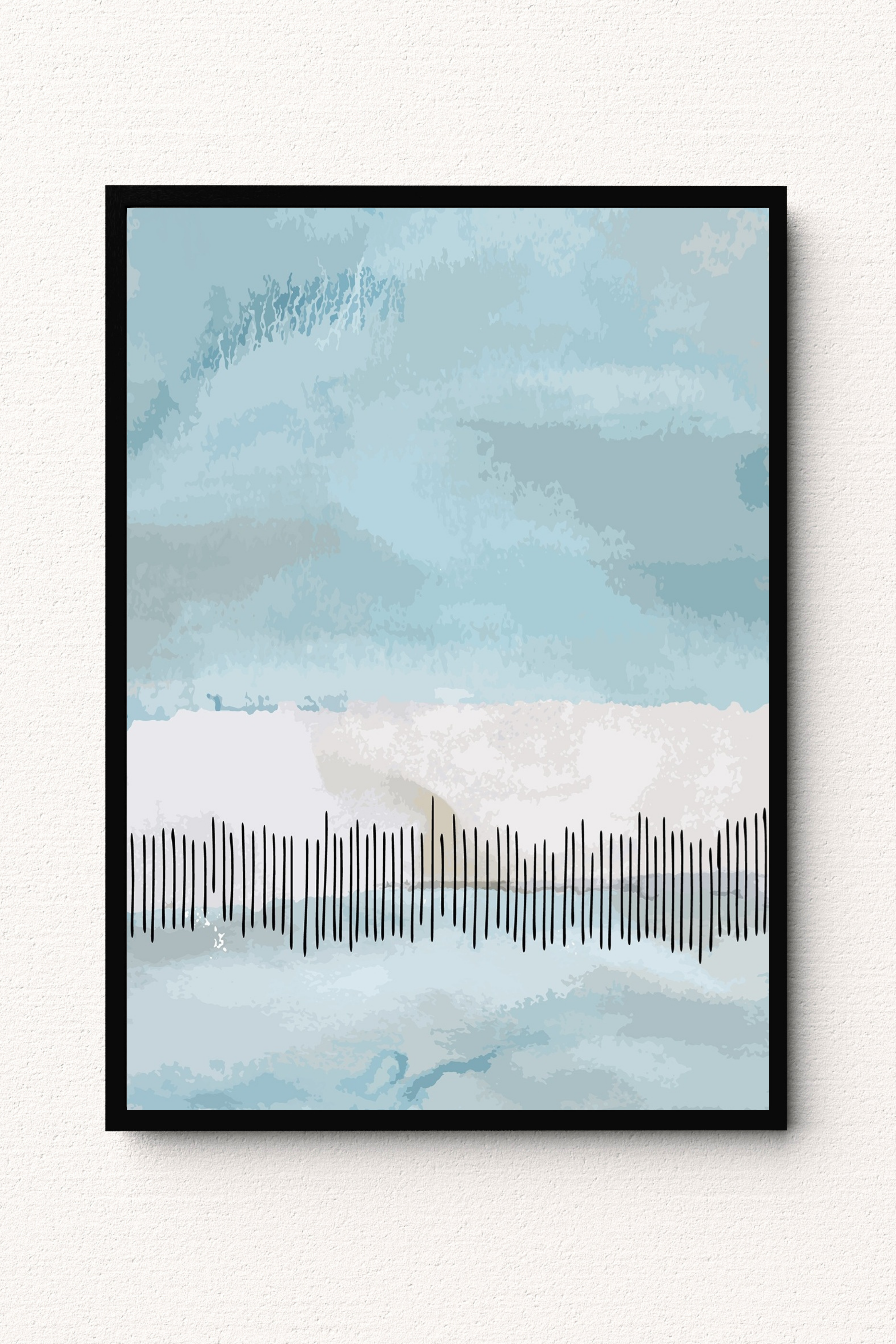 Invite calm and clarity into your home with a minimalist abstract print that lets you shape serene, modern interiors. Soft sage-gray watercolor washes flow into a crisp white lower half, while bold vertical black strokes define the horizon with contrast and balance. The matte finish enhances texture, and the muted color palette makes this piece versatile for Scandinavian, modern, or boho-inspired décor. Perfect for your living room, bedroom, or office, this abstract wall art evokes the stillness of misty mornings and timeless elegance.