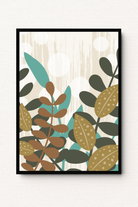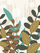 A delightful bohemian botanical print that creates a sense of lush, layered beauty. This contemporary decor features a captivating mix of stylized leaves in soft terracotta, deep teal, and a muted yellow-olive, with playful polka dot patterns adding a unique and cheerful texture. With its soft, organic shapes and a nod to mid-century modern aesthetics, this high-quality abstract print is the perfect way to infuse your home with warmth, color, and a touch of effortless style.