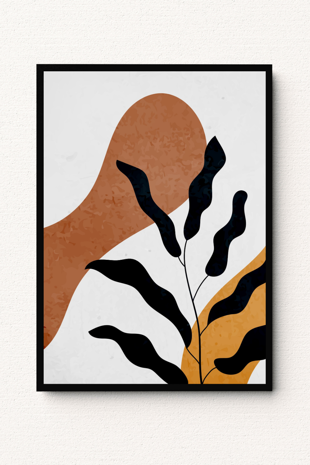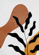 A perfect blend of minimalist design and botanical elegance, creating a calming and sophisticated atmosphere. Featuring organic, flowing black leaf shapes that contrast beautifully with textured ochre and earthy brown abstract forms, this contemporary wall art brings a touch of nature and a modern boho aesthetic to any room. The high-quality print and clean lines of this abstract decor make it an effortless way to upgrade your home decor and showcase your unique style.