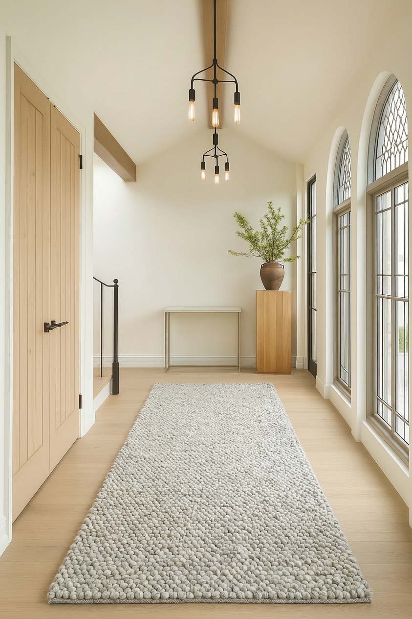 Calm light grey sets the tone as handwoven natural woolen yarn forms plush pebble rows you feel with every step. Neat ribbed channels between the pebbles add gentle rhythm, giving the surface a deep, textured look. The rectangular shape sits clean beneath a sofa or bed, with finished edges that keep everything tidy. This light grey wool rug pairs easily with minimalist, Scandinavian, and contemporary styling—think light wood, black accents, and stone.