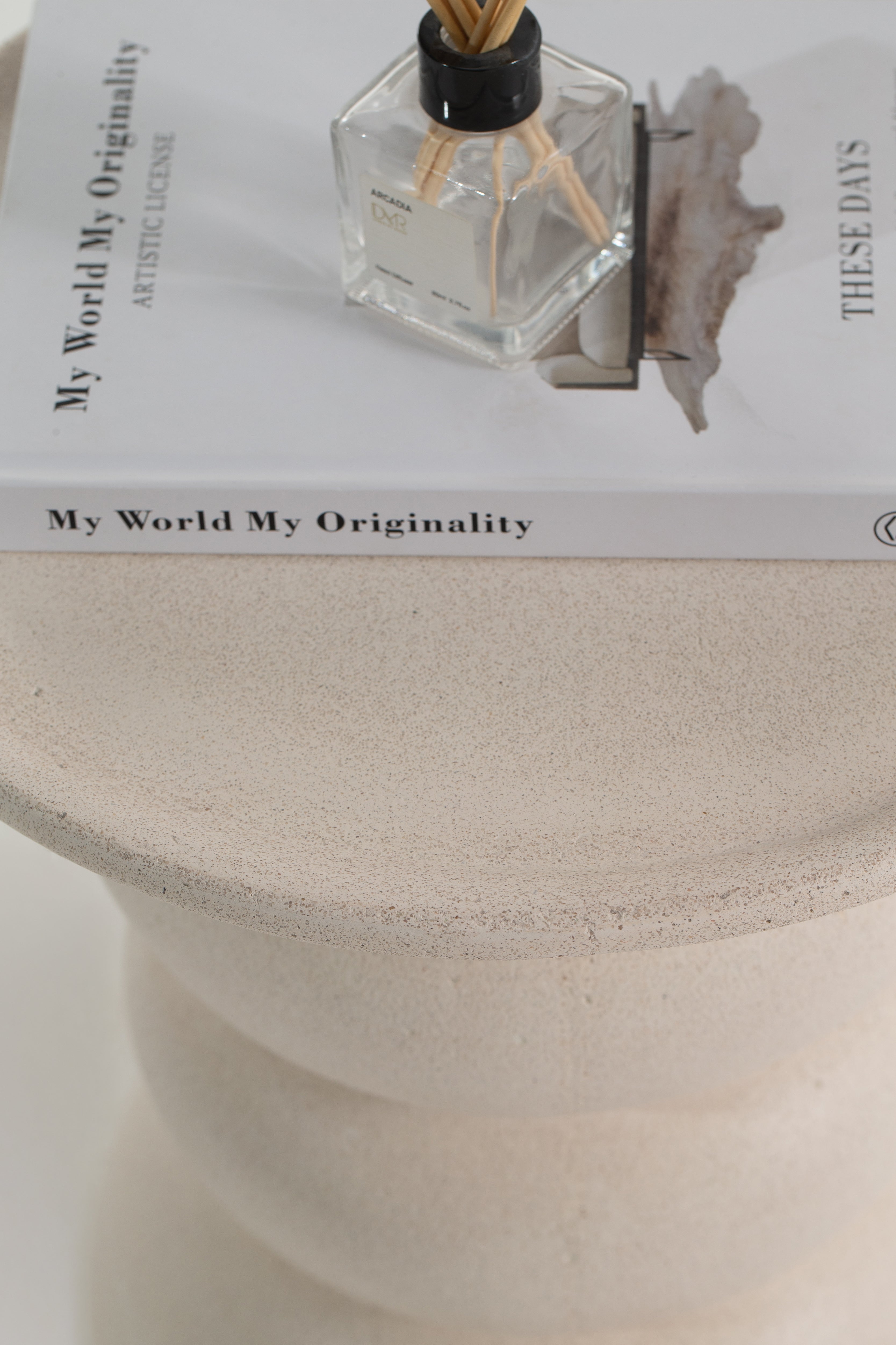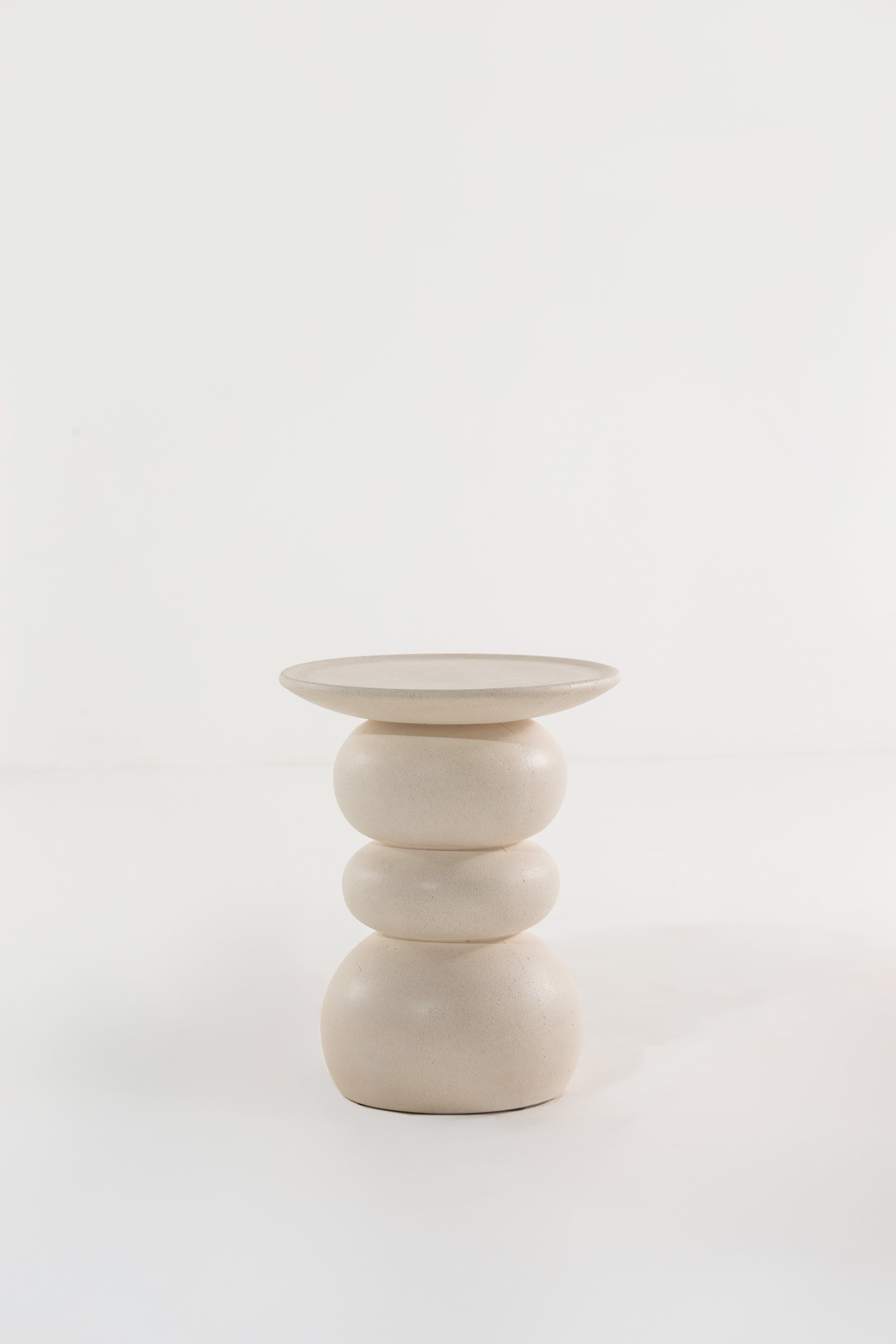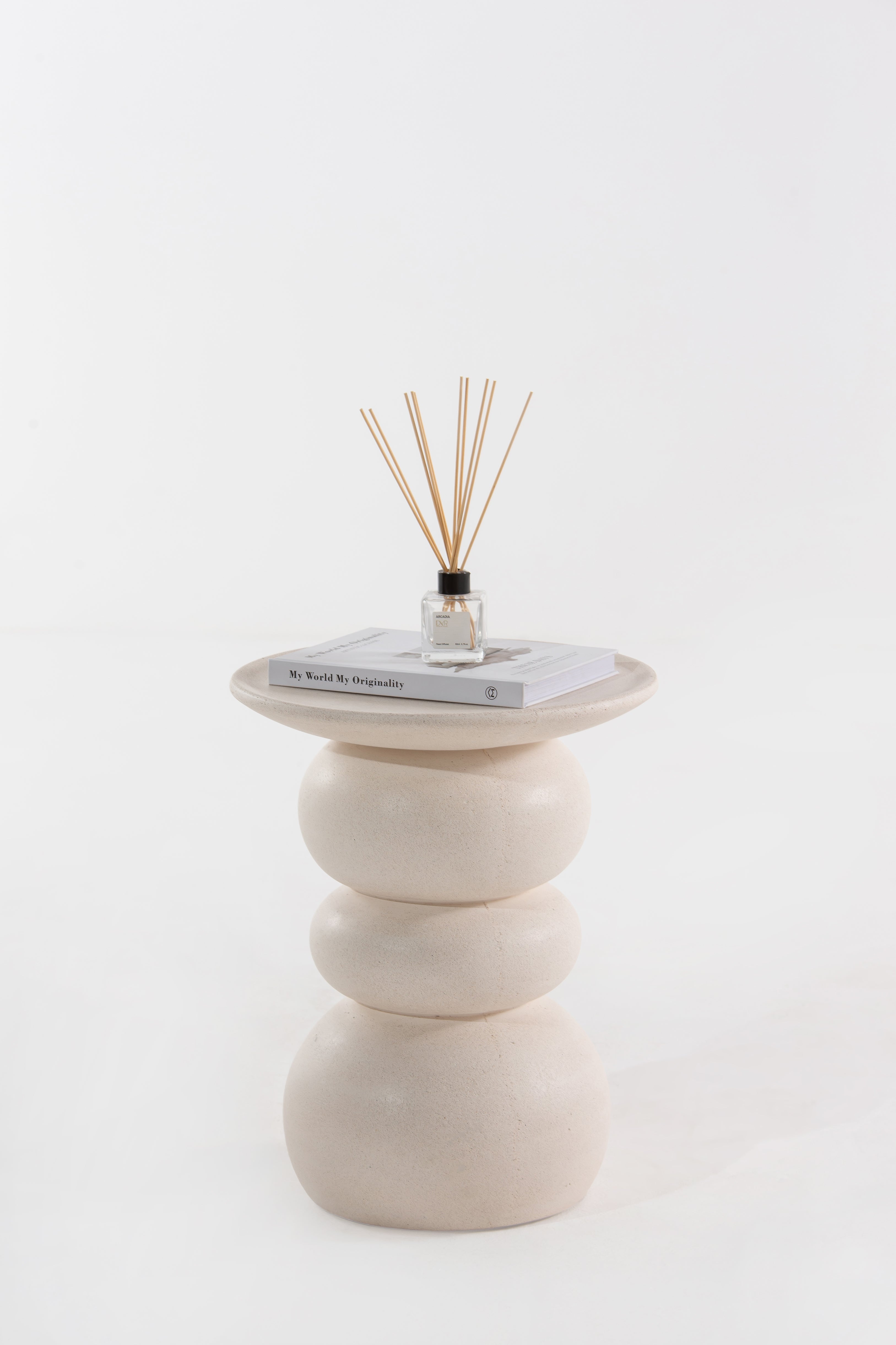 A serene blend of form and function, this off-white concrete side table is a sculptural statement piece for modern interiors. Featuring a hand-finished, pebble-stacked silhouette, its soft curves and organic shape add a sense of calm and visual interest to any room. The smooth matte texture and grounded concrete build offer both durability and style, making it ideal as a bedside table, living room accent, or decorative stand in minimalist, Japandi, or earthy-toned spaces. Its understated elegance effortlessly complements neutral palettes while serving as a functional surface for everyday essentials or curated decor.