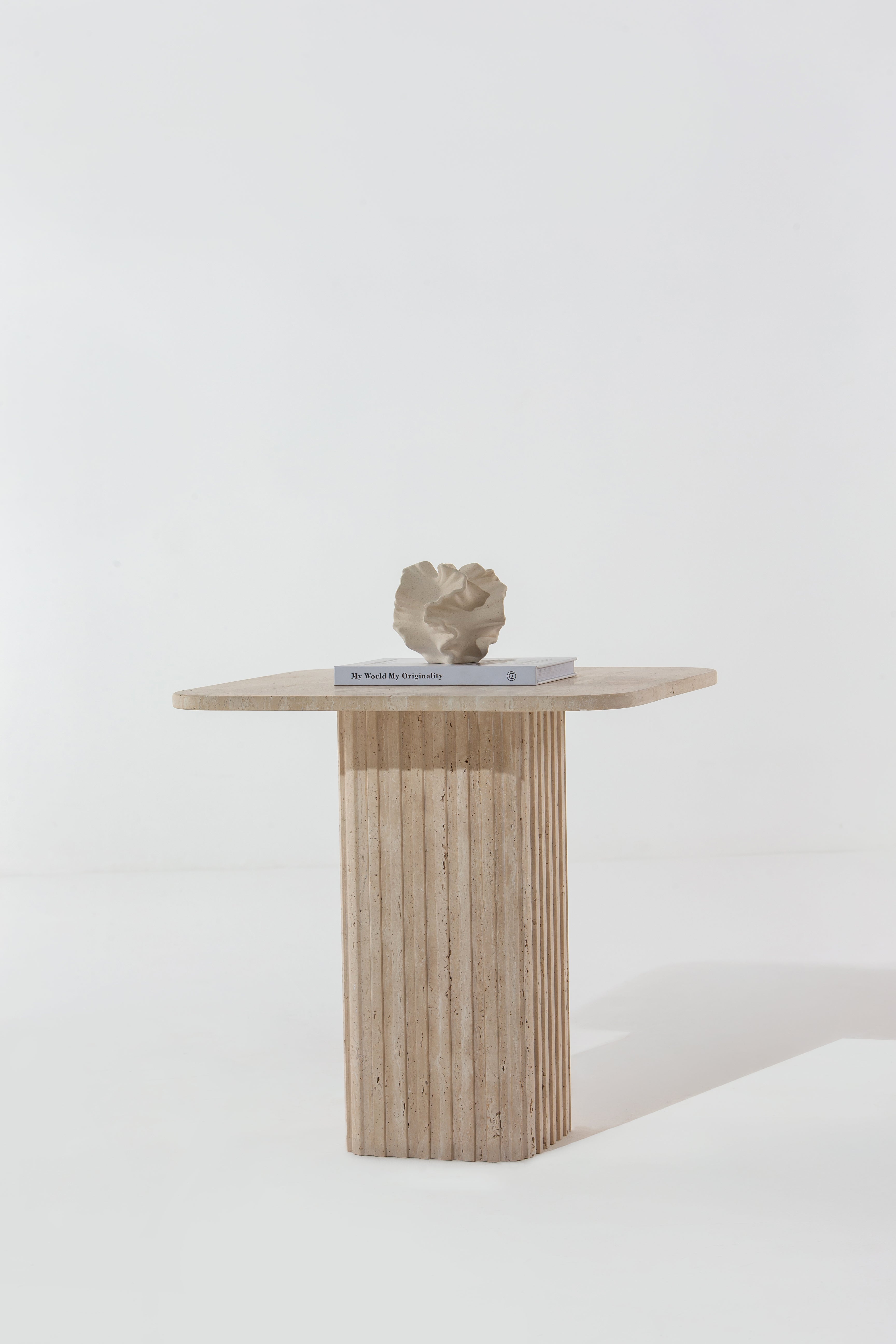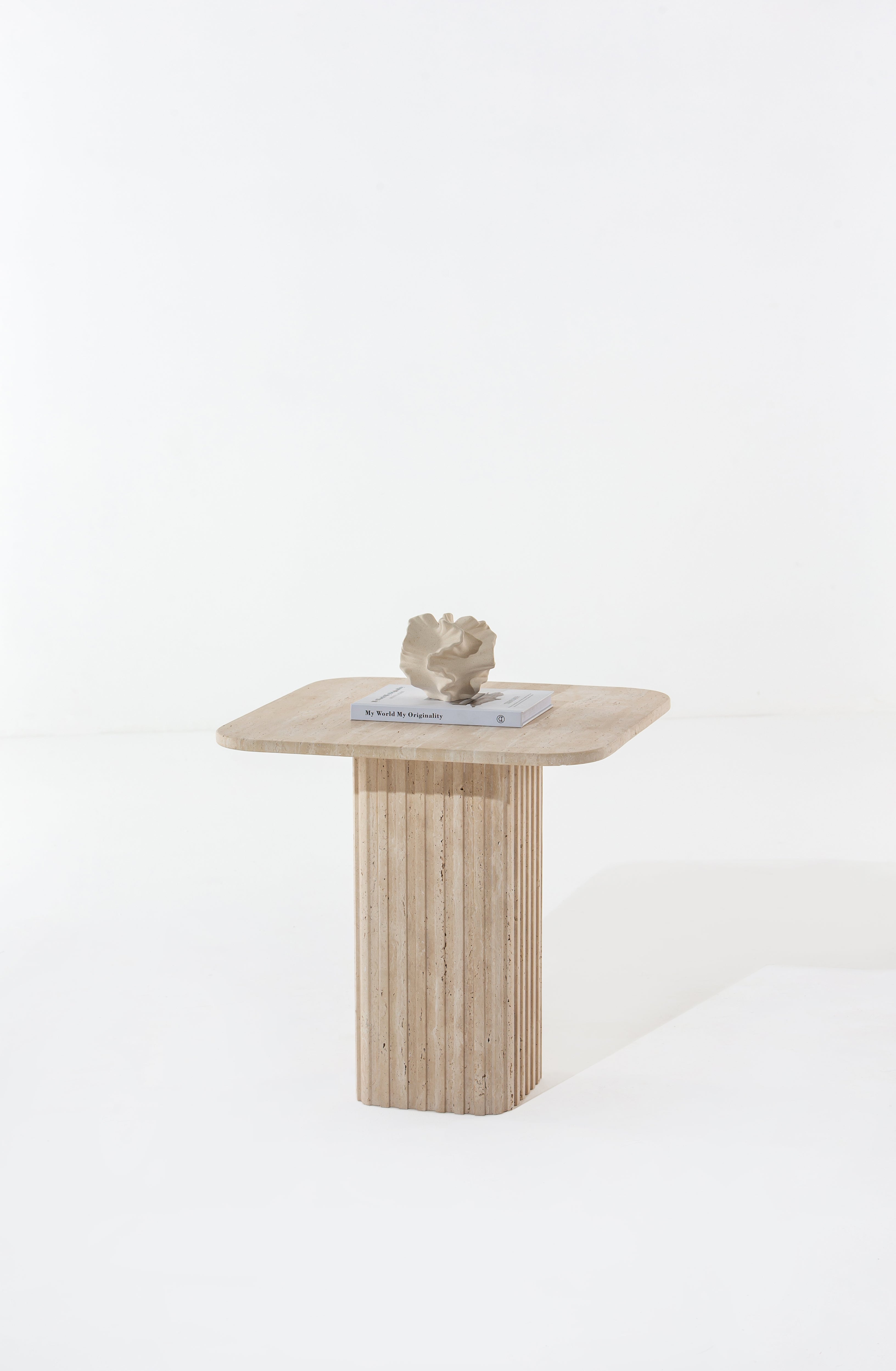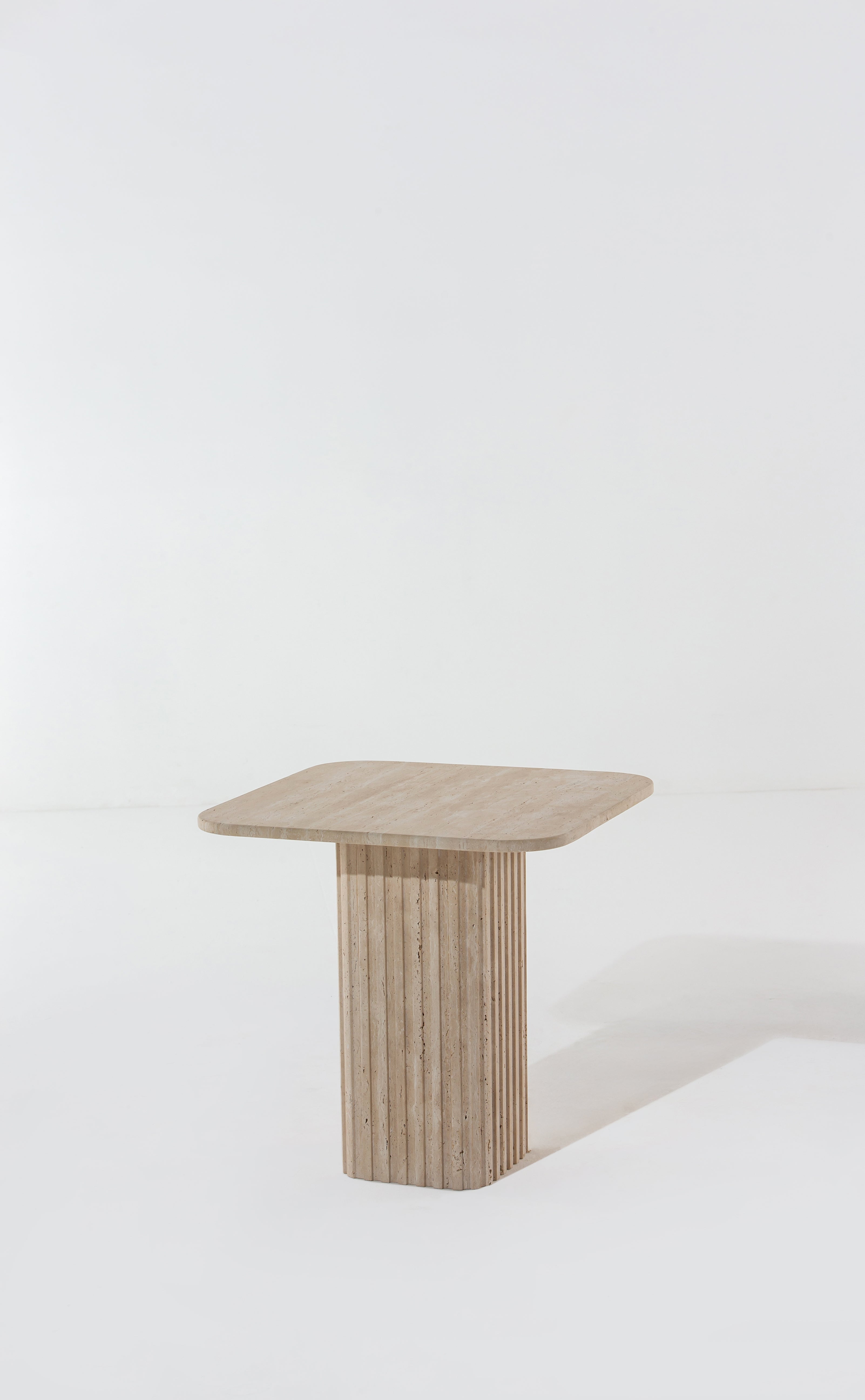 Elegant in proportion and rich in natural texture, this Fluted Travertine Side Table brings architectural charm to contemporary interiors. Featuring a rounded square top and a fluted cylindrical base, this piece is a sophisticated blend of softness and structure. Carved from natural beige travertine, its surface showcases subtle tonal variation and delicate veining, making every table uniquely beautiful. The fluted base adds depth, rhythm, and classical inspiration, while the soft curves of the top balance its sculptural presence.