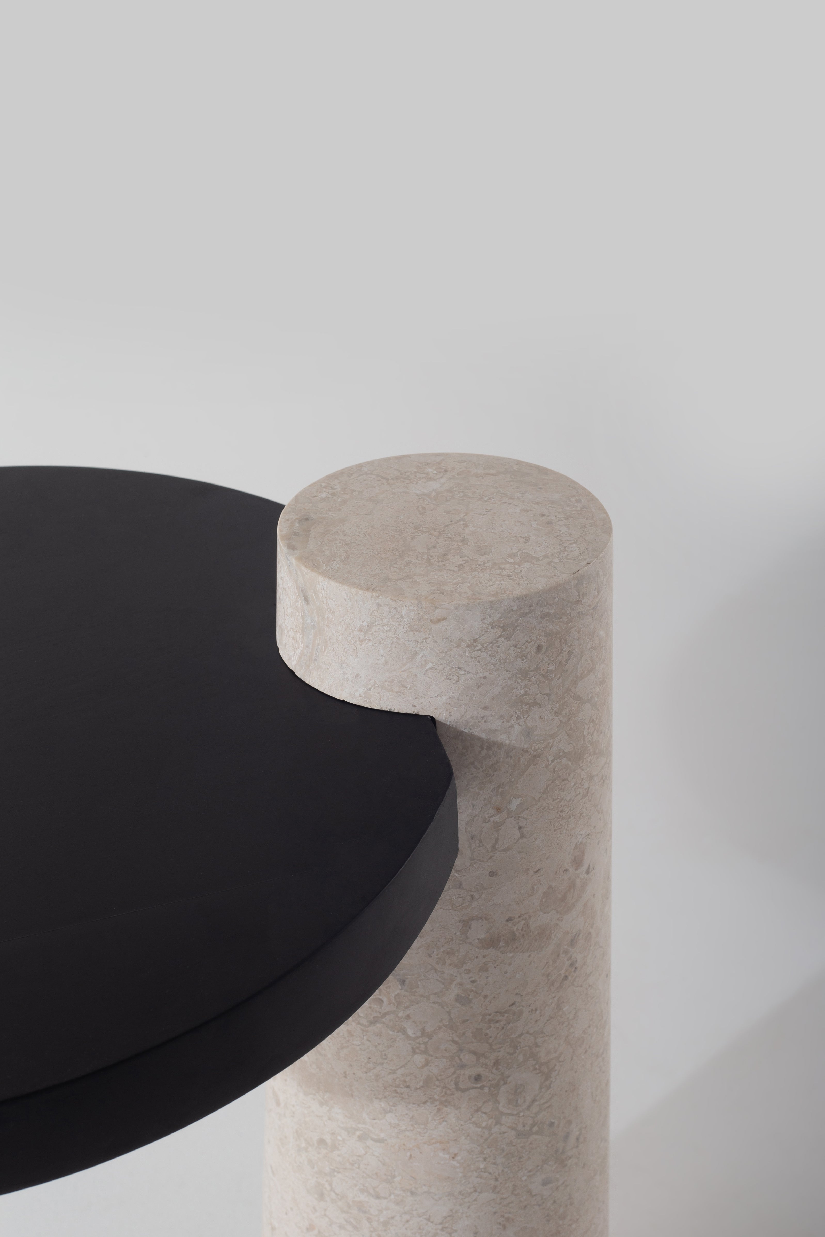 A sculptural statement for modern interiors, this side table blends raw stone and refined craftsmanship. The cylindrical solid stone base in warm beige tones supports a suspended tabletop, available in rich walnut wood or deep black. The asymmetric cutout design adds an architectural touch, making it a bold yet functional accent for living spaces. Perfect beside a sofa or as a standalone piece, it invites a balance of organic texture and contemporary design.