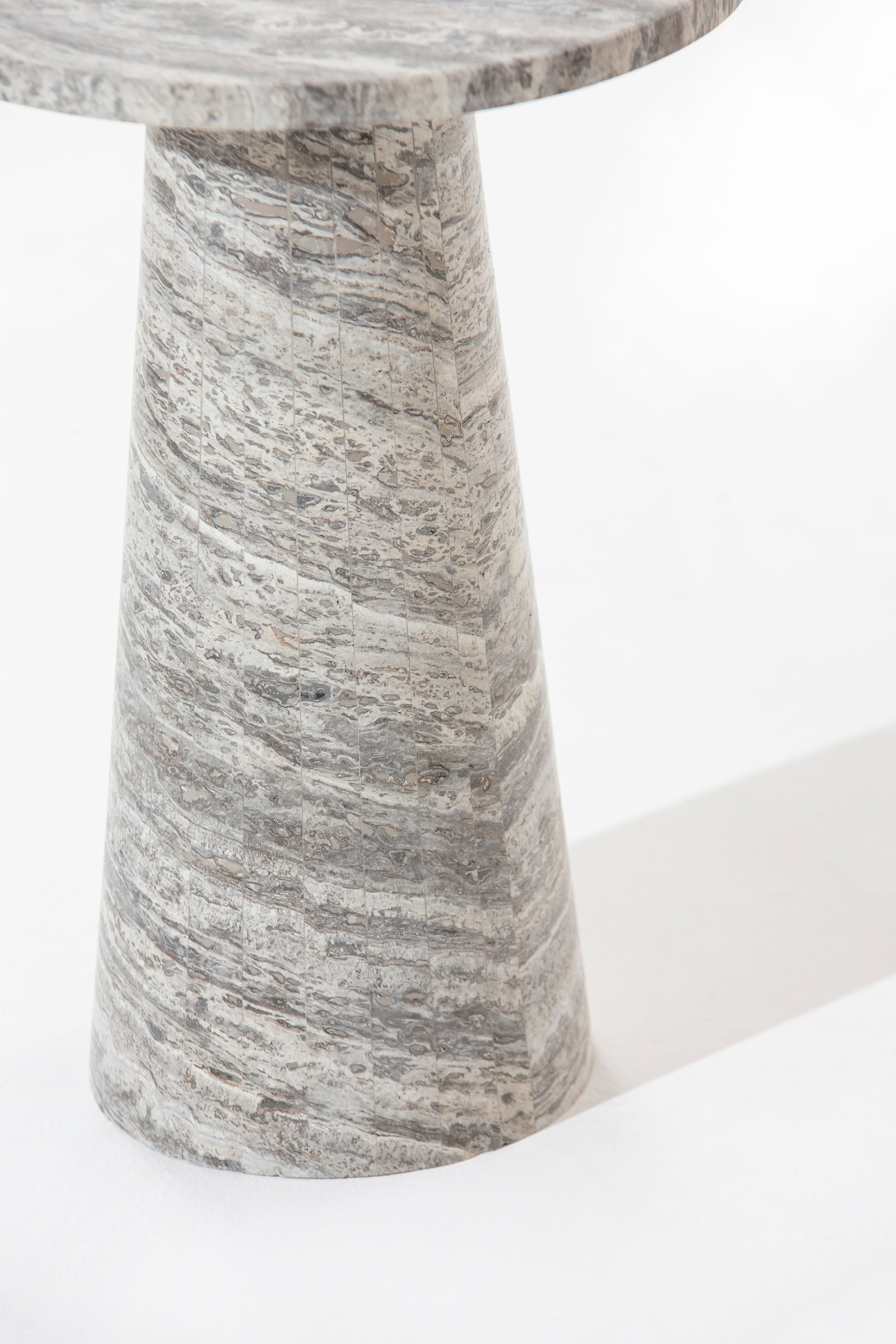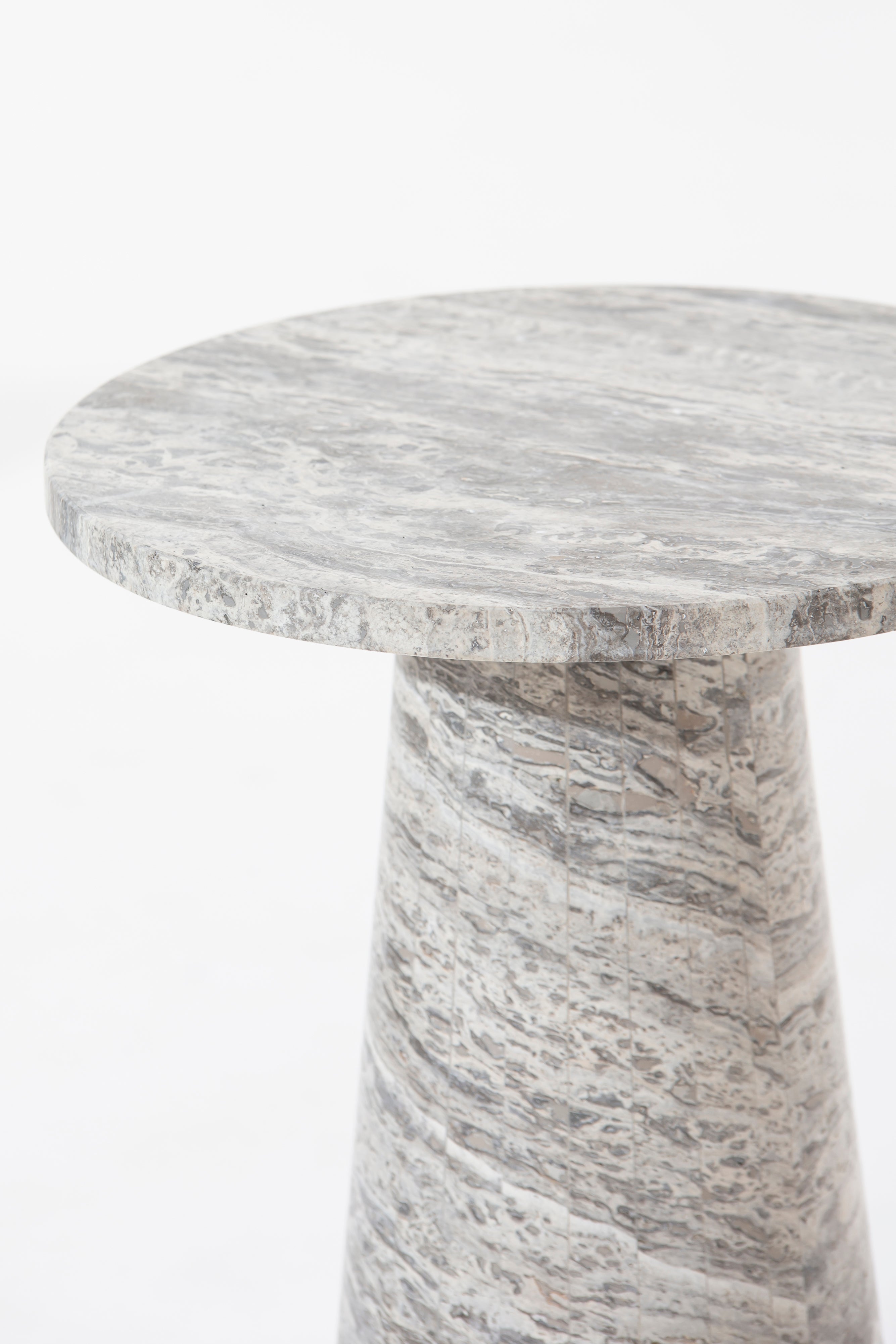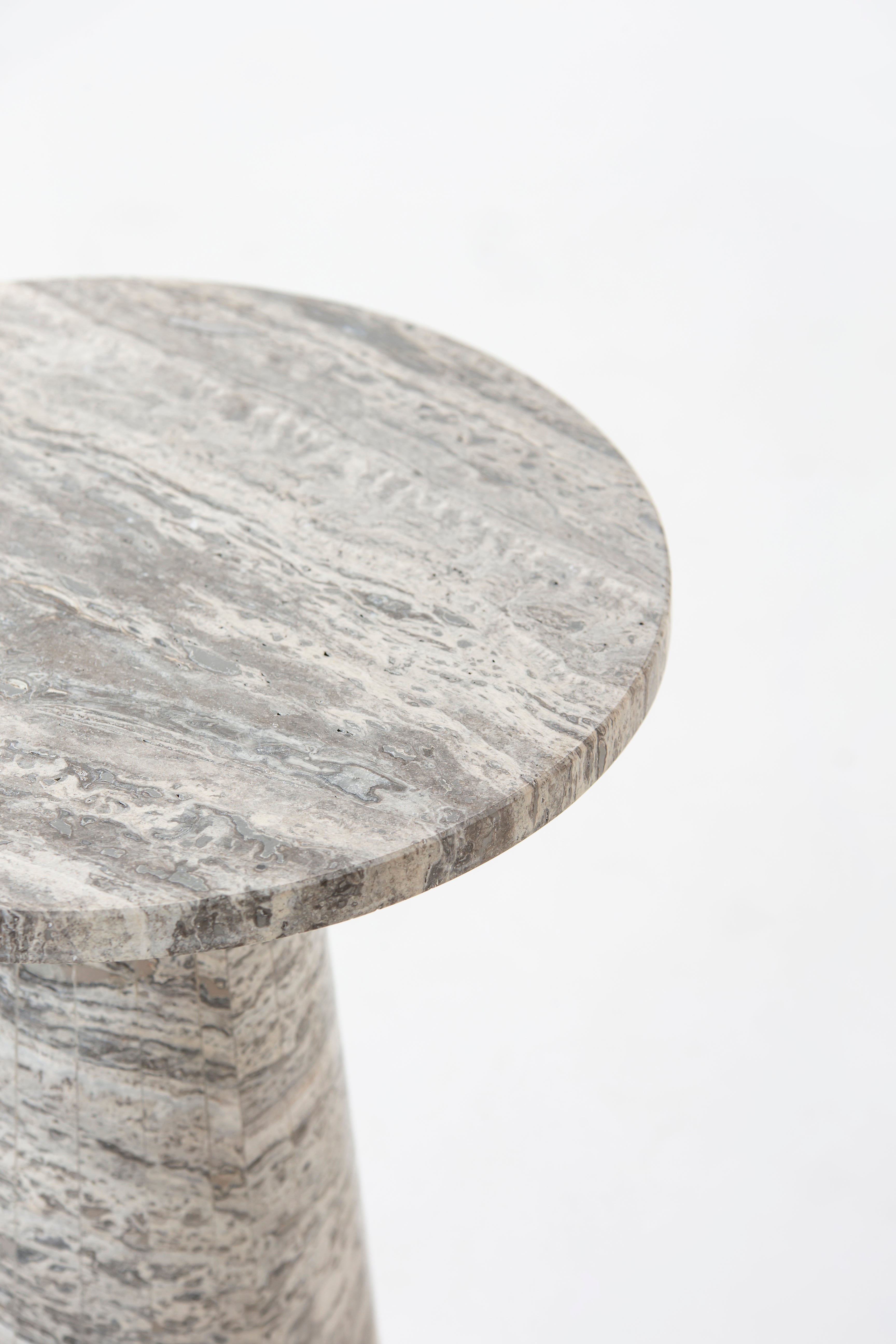A sculptural statement inspired by ancient Greek columns. Expertly carved from solid Grey Travertine, its conical pedestal base and smooth round top create a minimalist silhouette grounded in strength and elegance. The natural grey veining flows across the surface like stone strata, adding depth and visual rhythm. Whether styled as a standalone piece or paired in a modern interior, Kionas becomes your grounding accent — where natural texture meets classical design.