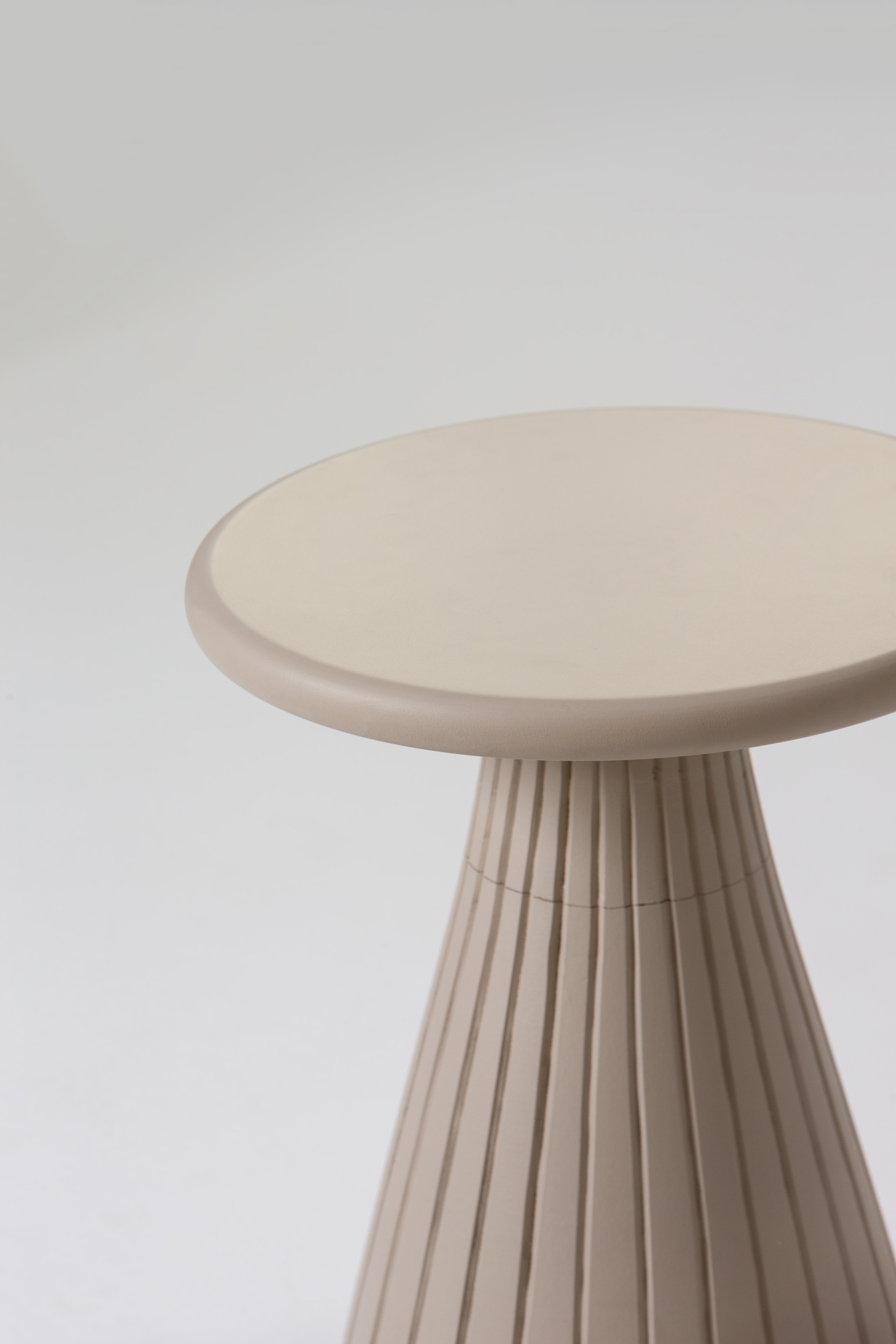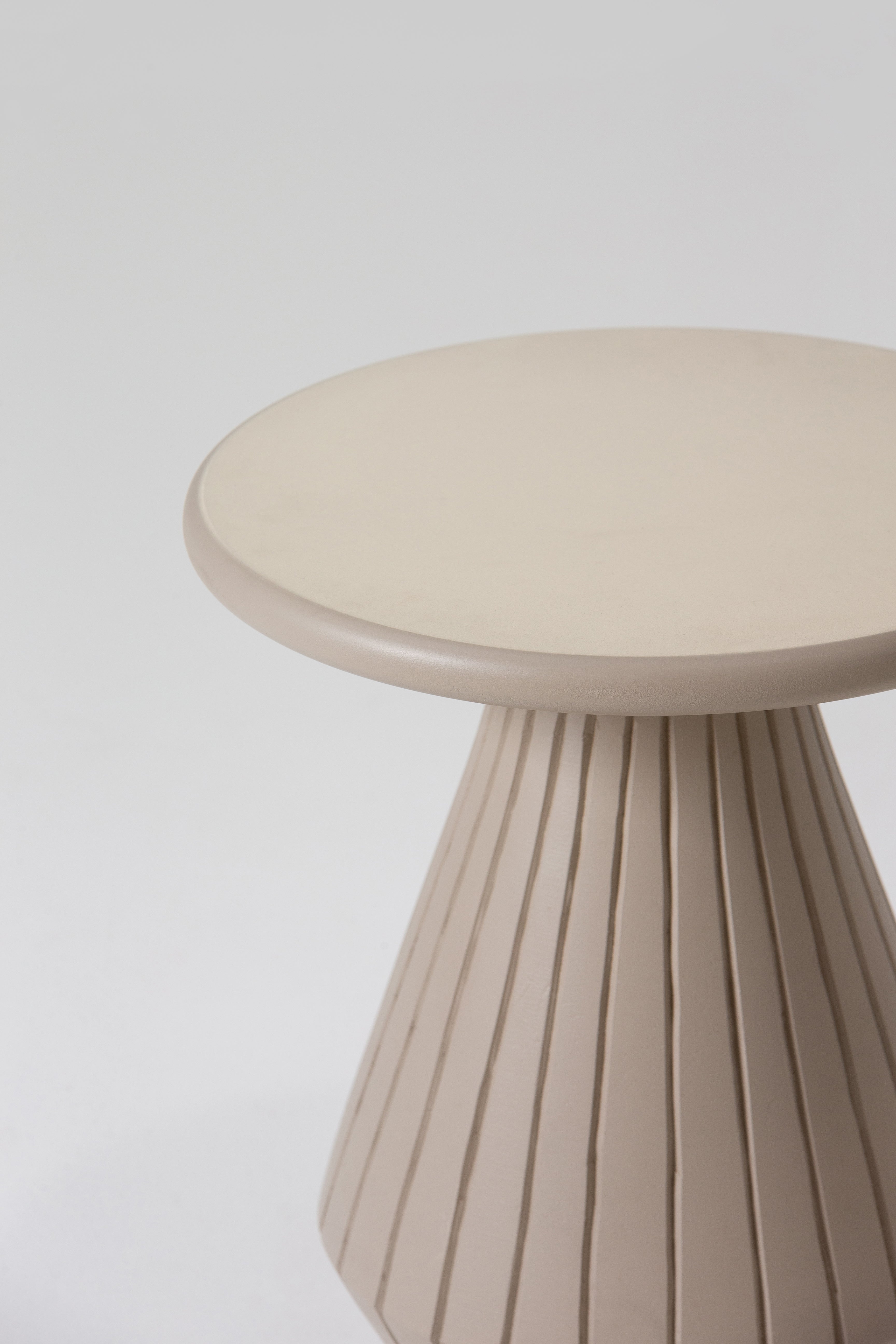 This painted mango wood side table features a fluted base with a smooth circular top, adding a sculptural charm to any interior. Finished in a neutral tone, it complements modern, minimalist, or Scandinavian decor, offering a durable and stylish surface for essentials or decor pieces.
