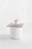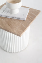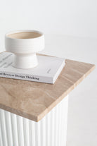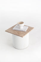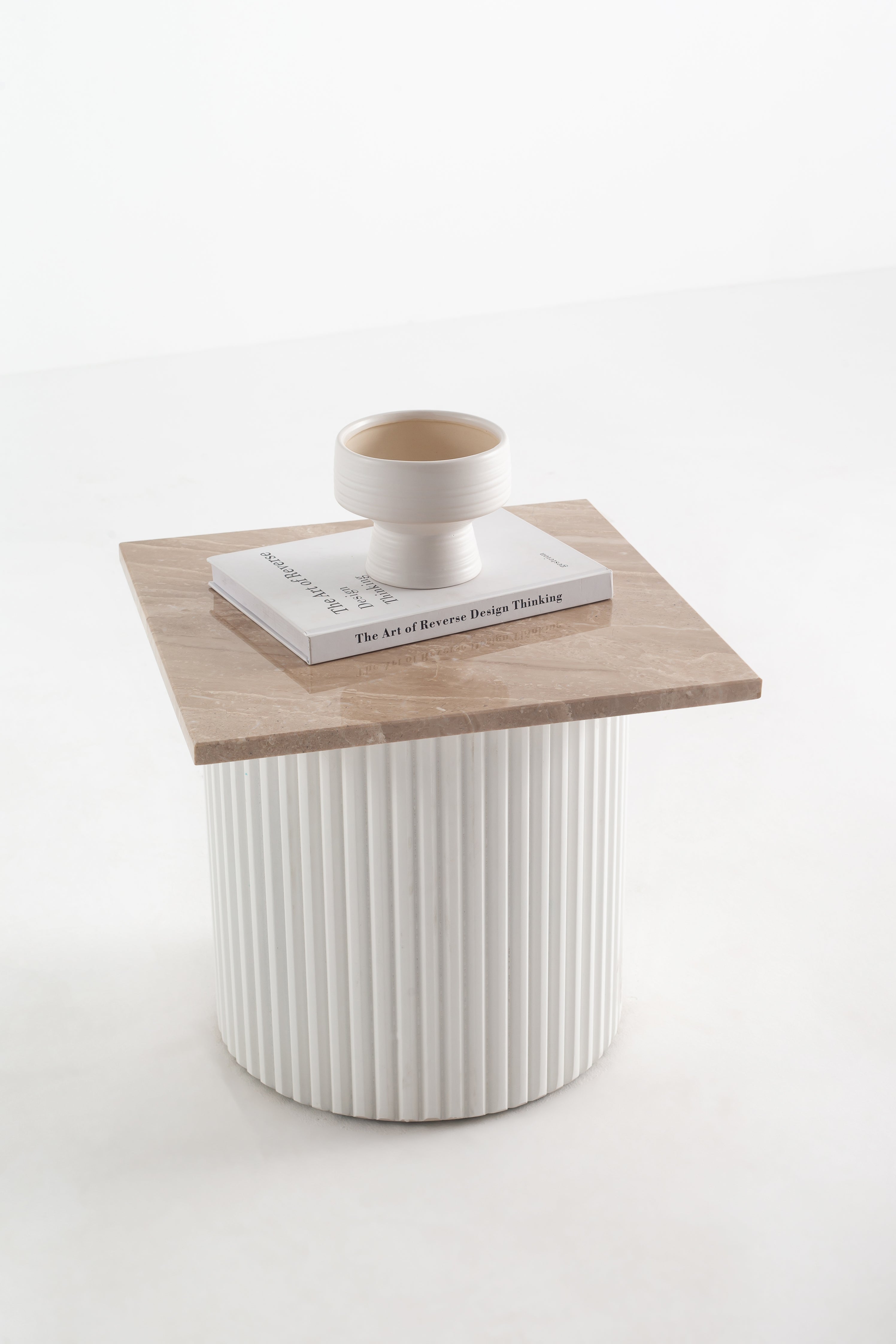 Picture yourself styling a side table that blends modern minimalism with architectural charm. A smooth square marble top in soft beige hues rests gracefully on a fluted cylindrical base finished in pure white, creating a striking balance of shape, texture, and color. The clean lines and refined details make it a versatile piece—perfect beside your sofa, armchair, or bed—while the marble surface adds an elegant touch that reflects light beautifully, turning everyday moments into a curated experience.