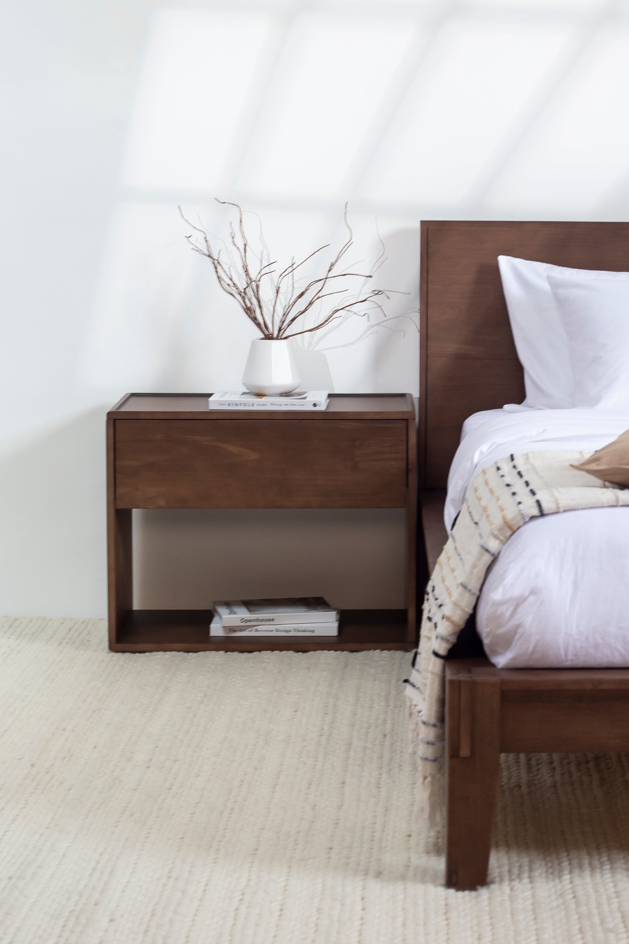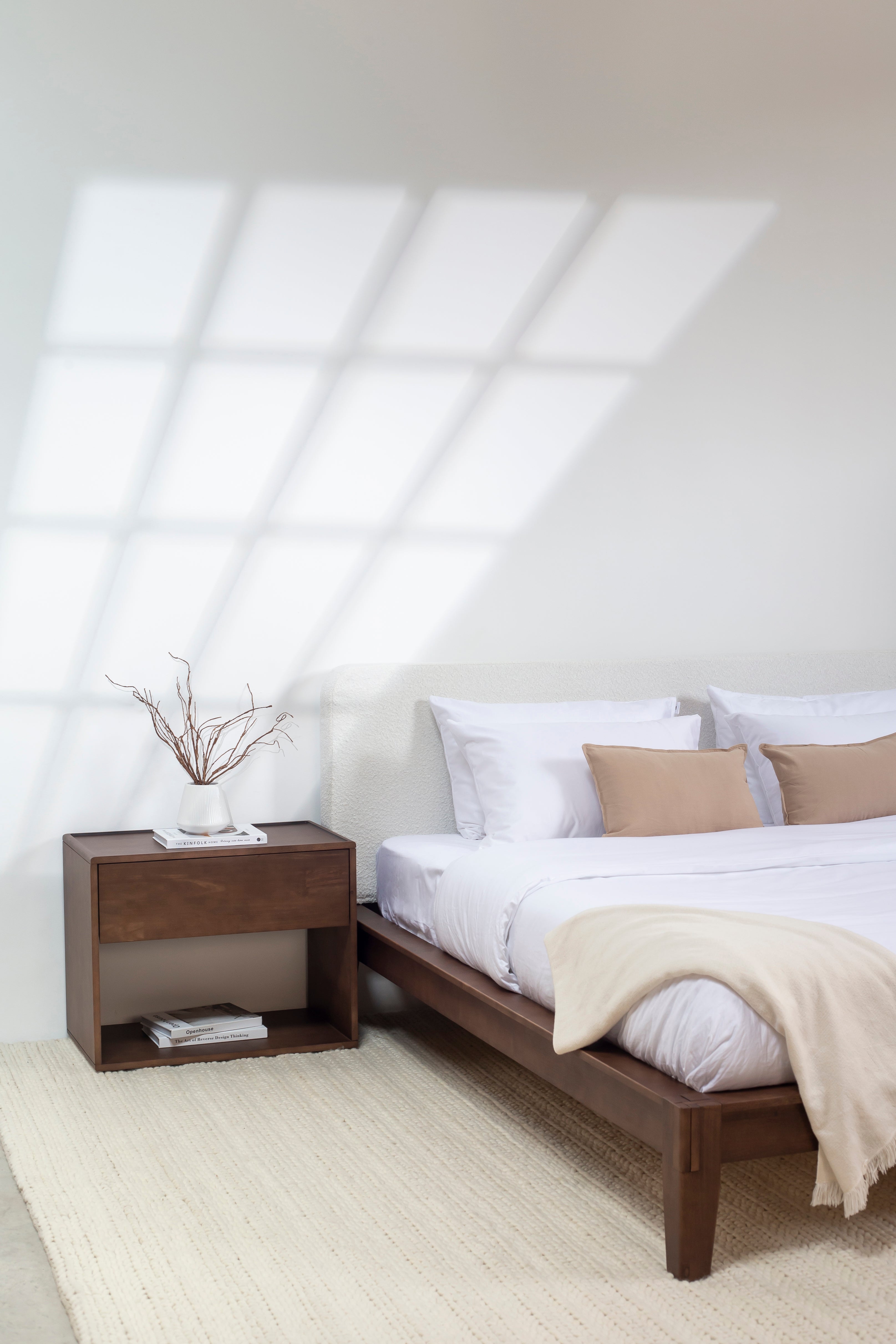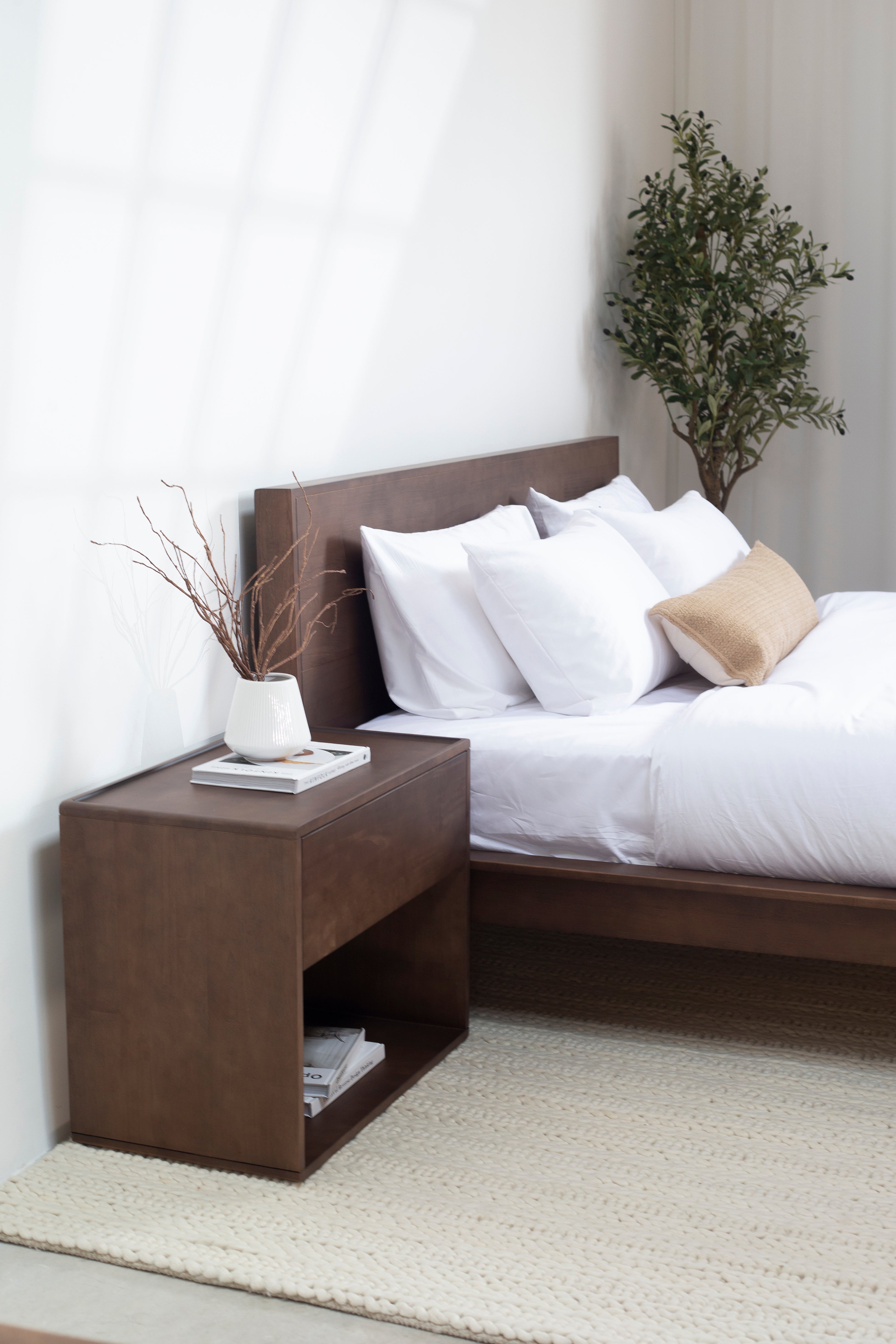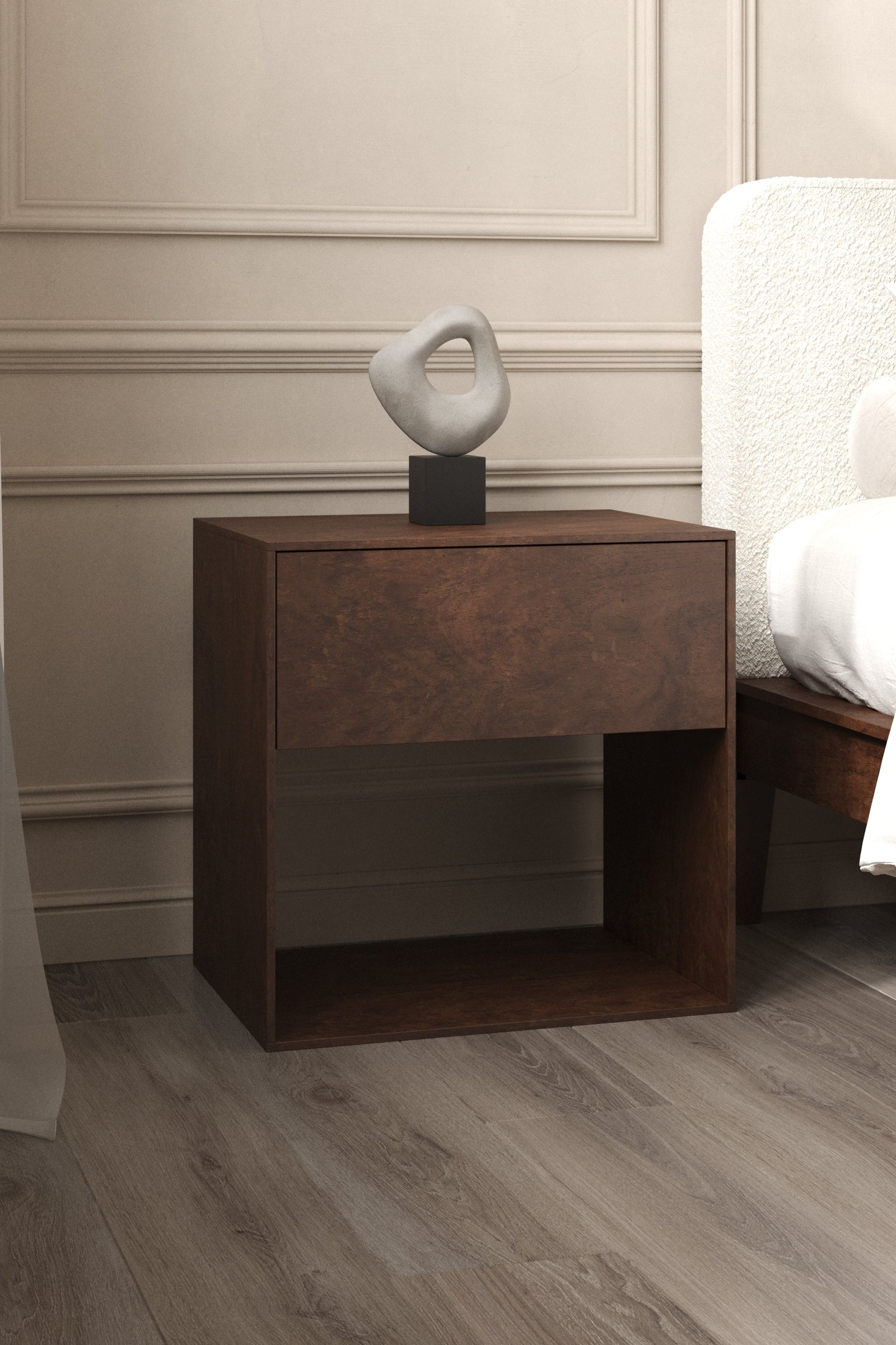 Crafted from robust rubber wood, this bedside table exudes warmth with its rich dark brown hue. Featuring a clean rectangular silhouette and a seamless drawer with plywood and MDF construction, it combines minimalist elegance with functionality. The E2-grade rubber veneer adds a smooth texture, while the spacious lower shelf provides ample room for books or décor. A sophisticated choice for any bedroom aesthetic.