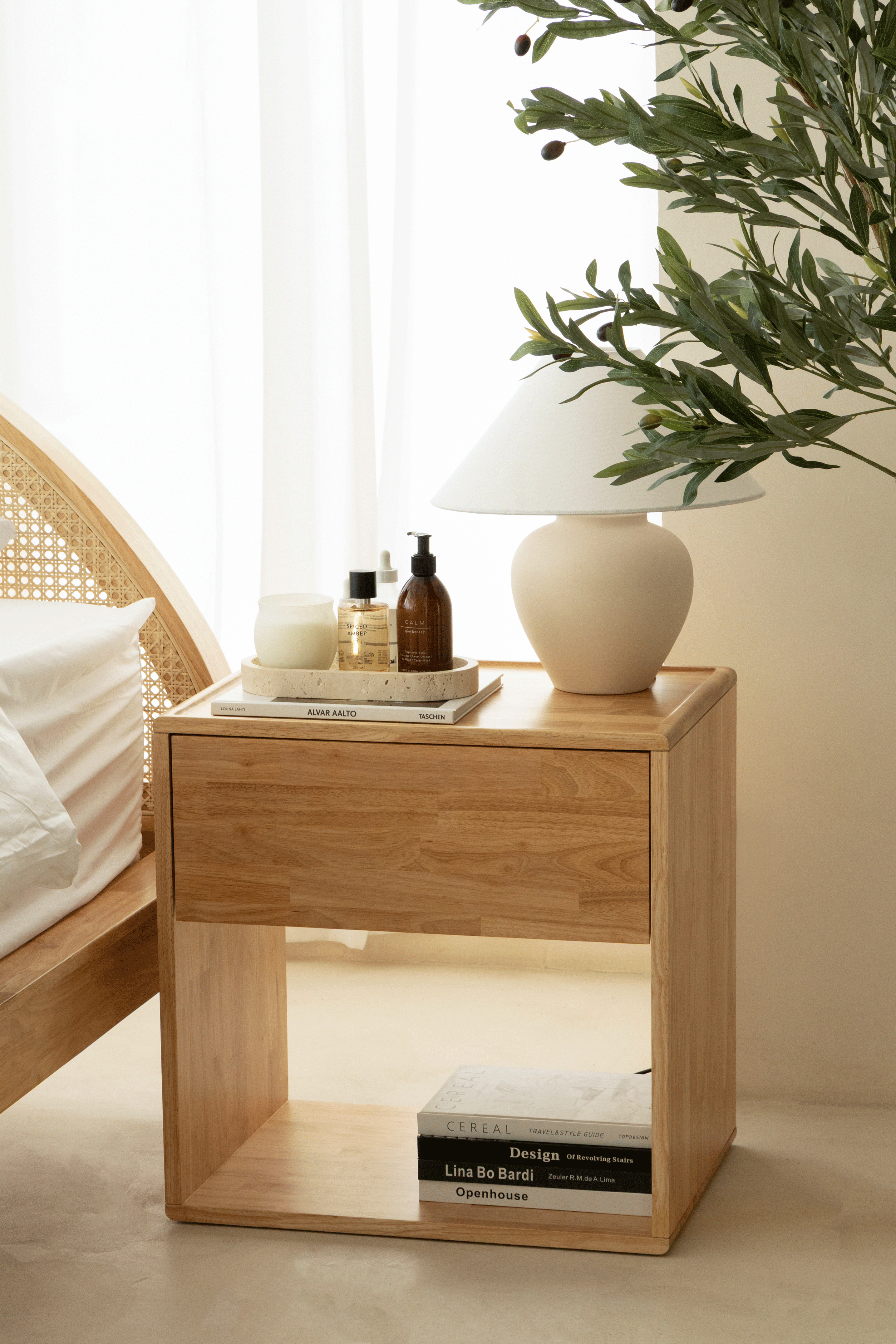This Bedside Table combines functionality with minimalist charm, making it a perfect fit for modern interiors. Crafted from high-quality rubber veneer, this table showcases a natural light wood finish with smooth grains, lending a warm, organic touch to any bedroom decor. Its sleek rectangular shape features clean edges and a practical design, complemented by a spacious drawer equipped with soft-close slides for seamless use. Beneath the drawer, an open shelf provides additional space for books or decor items. With durable construction and a timeless style, the Reika bedside table is an elegant addition that blends aesthetics and utility effortlessly.