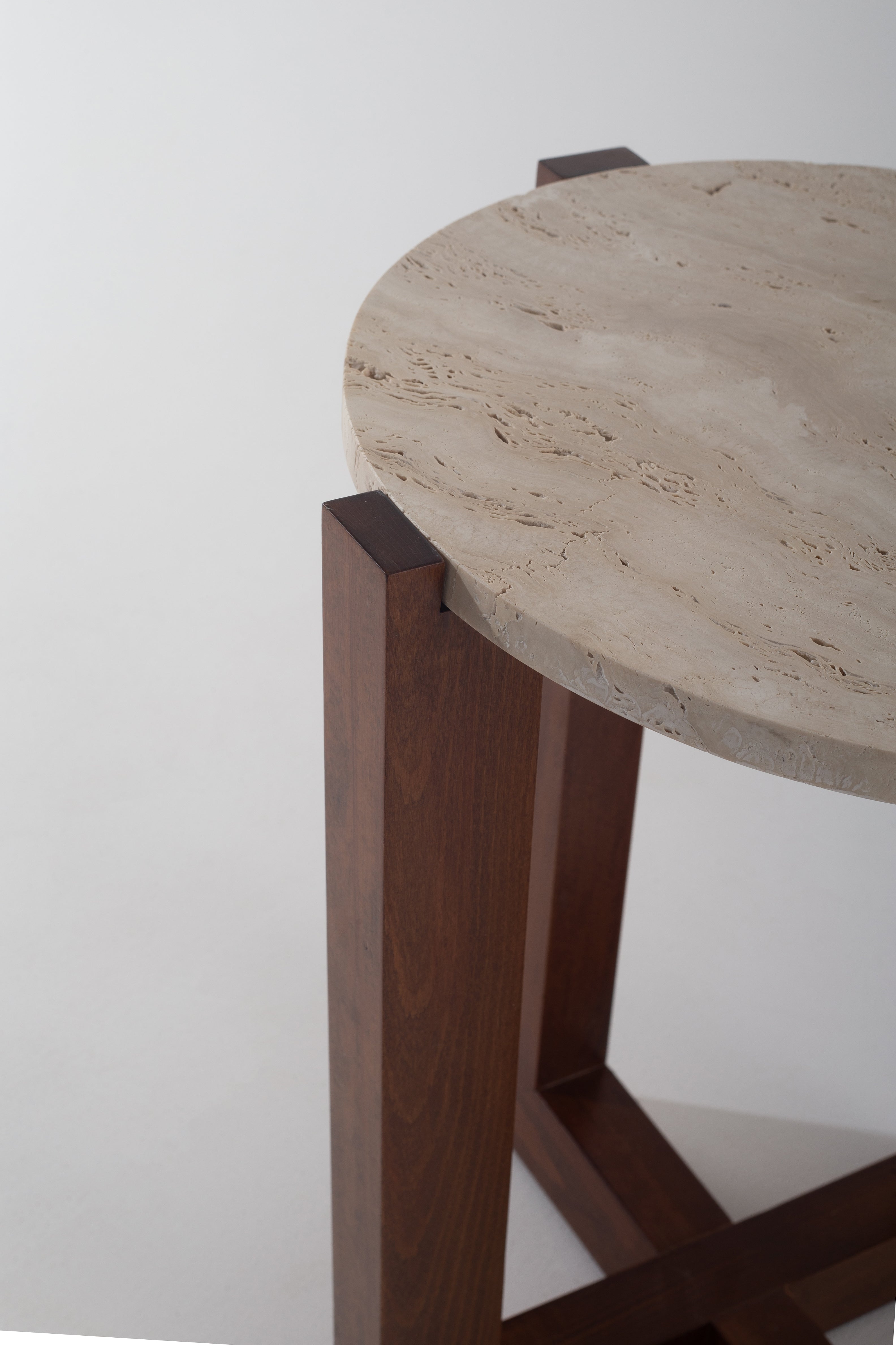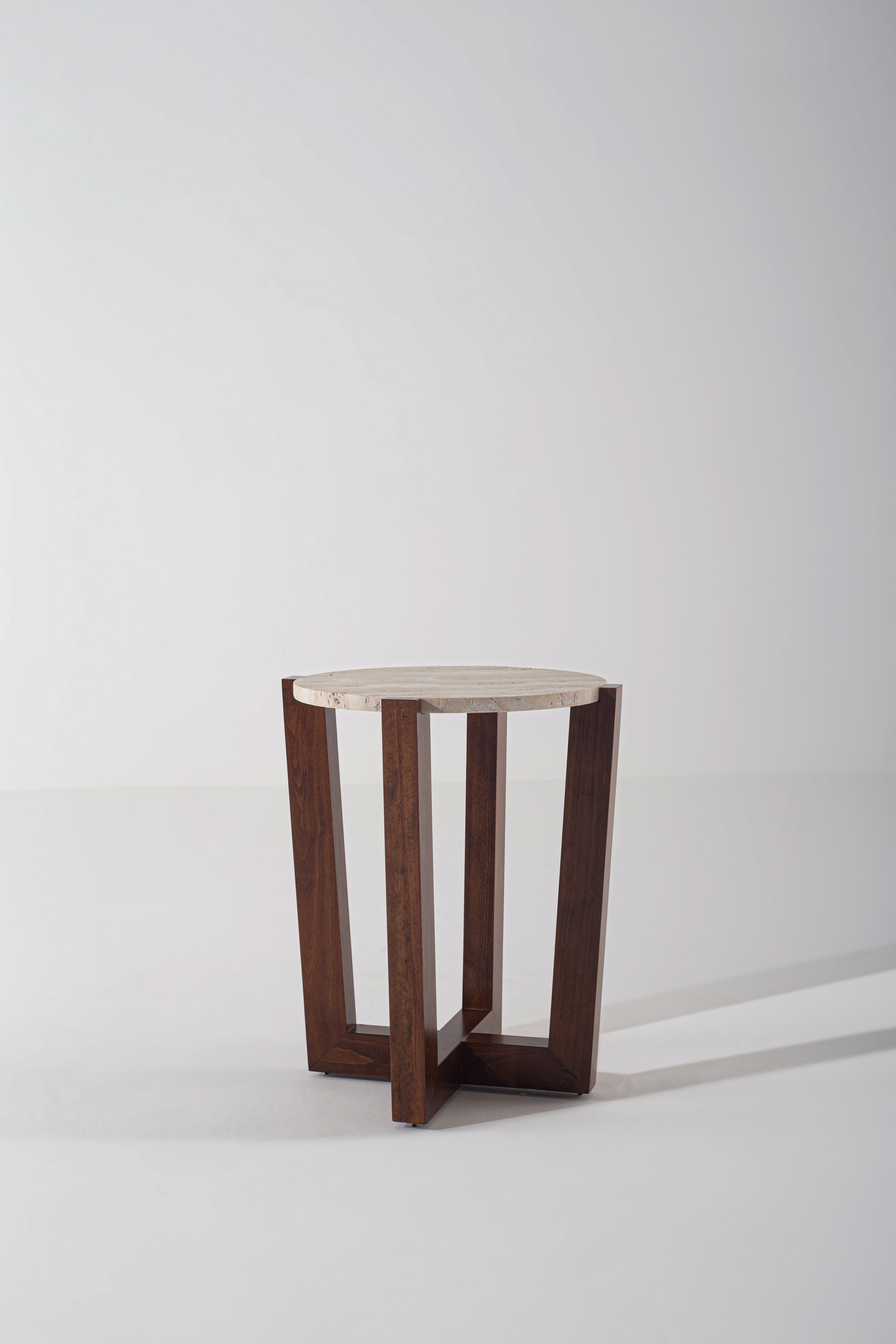 Designed to stand out, this side table pairs a sculptural wooden base with a refined stone top. The geometric legs create a striking silhouette, adding depth and balance to your space. Choose between a round or octagonal travertine top, each enhancing the warm wood tones with natural textures. Whether placed beside a sofa or as a bedside accent, its modern form and organic materials bring timeless appeal to any setting.