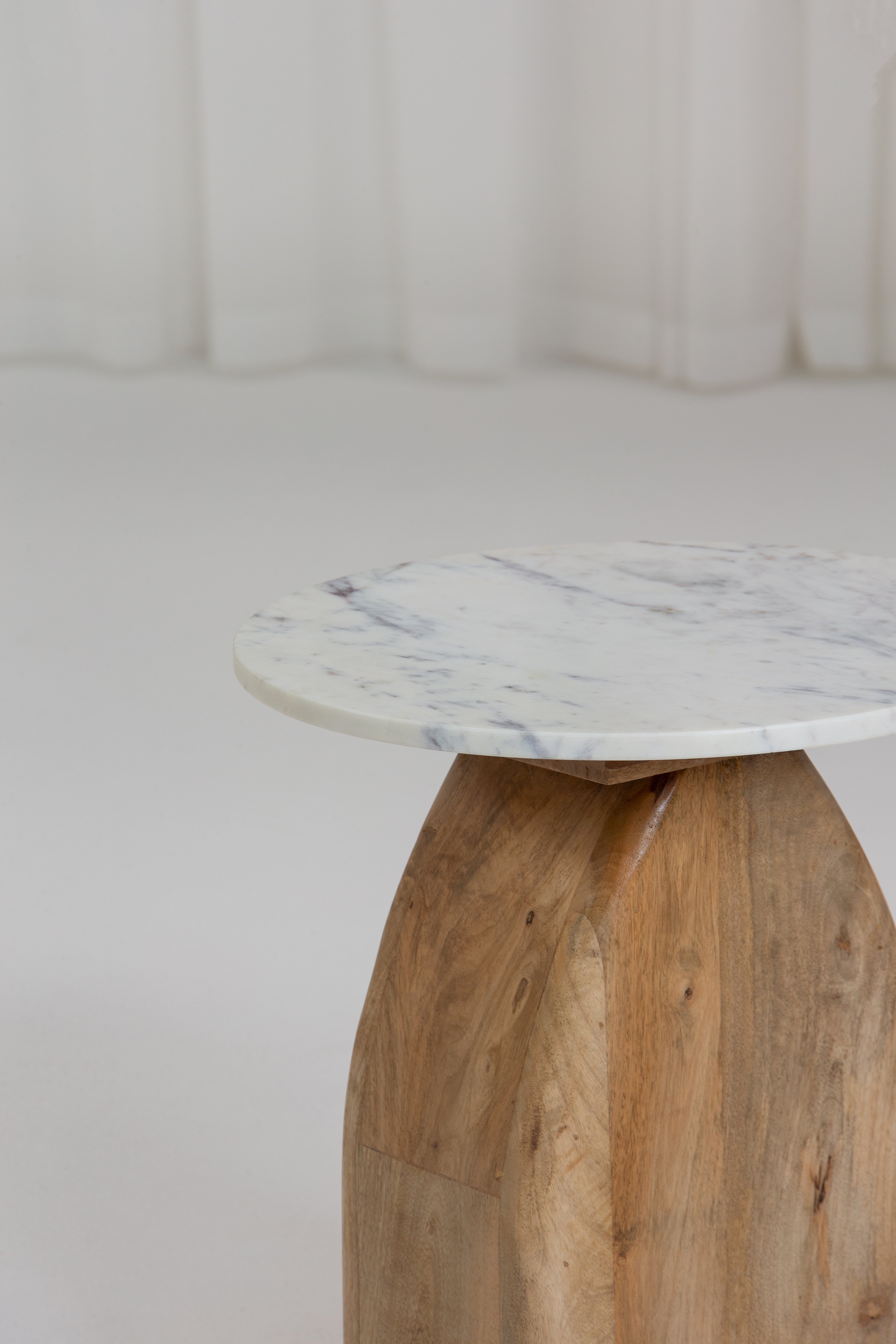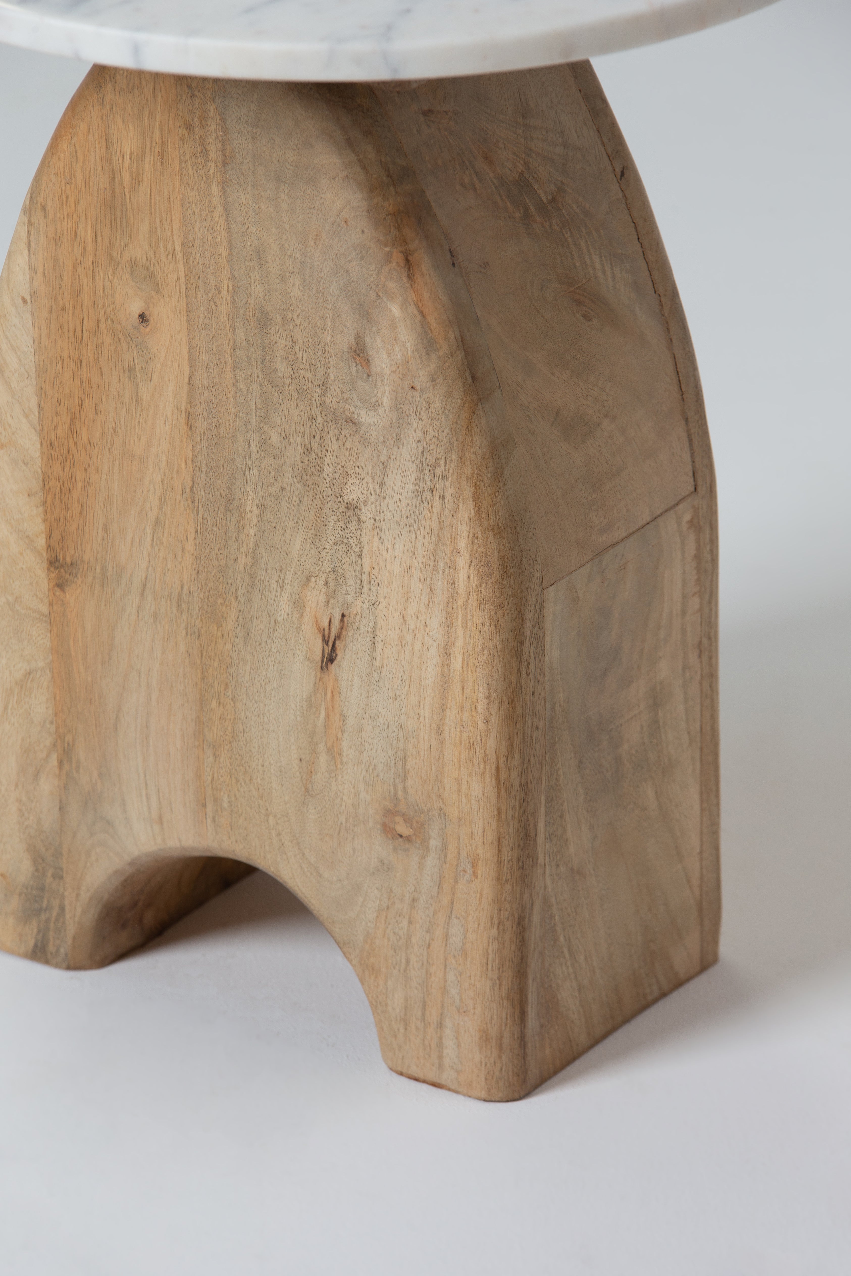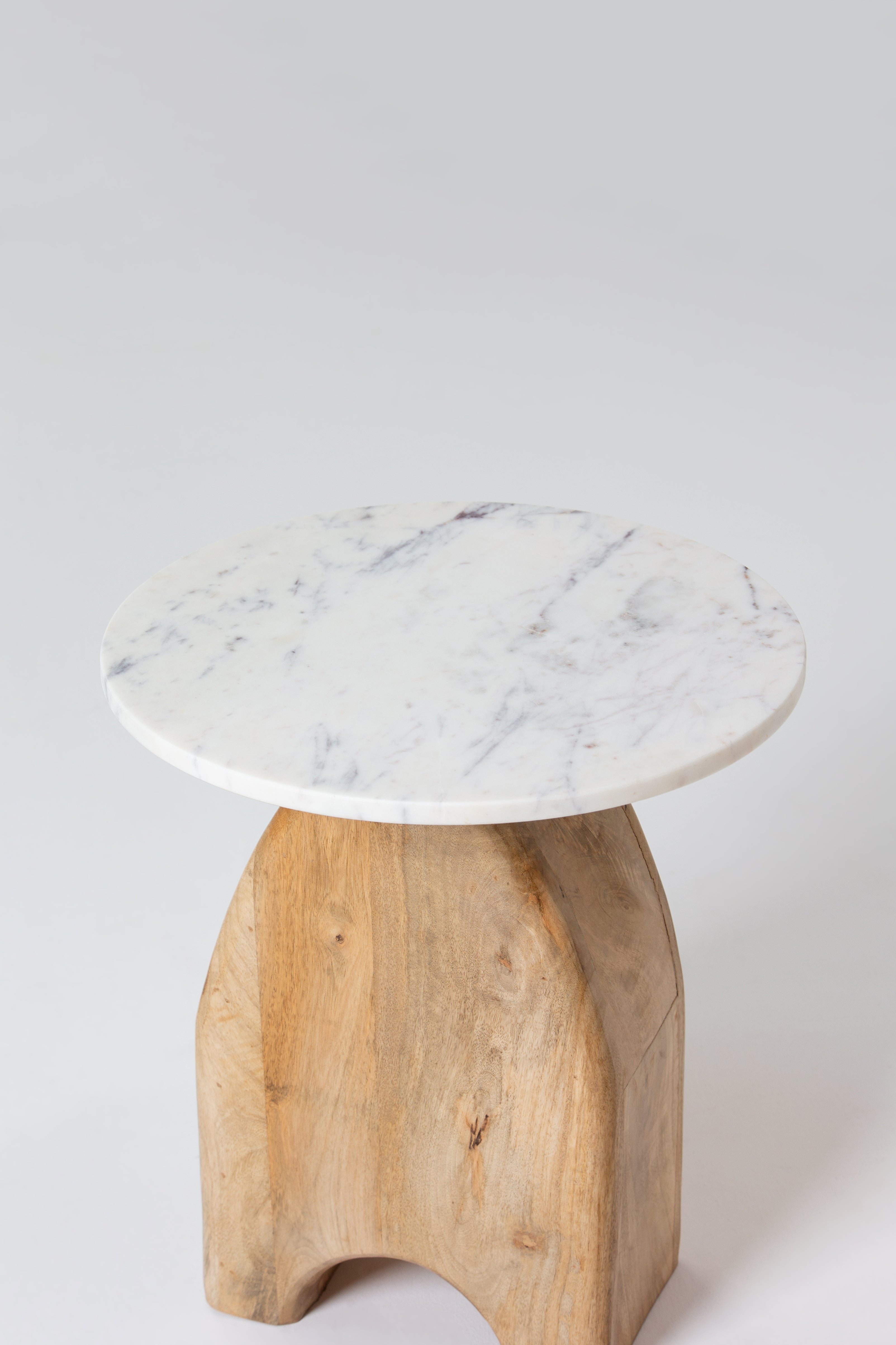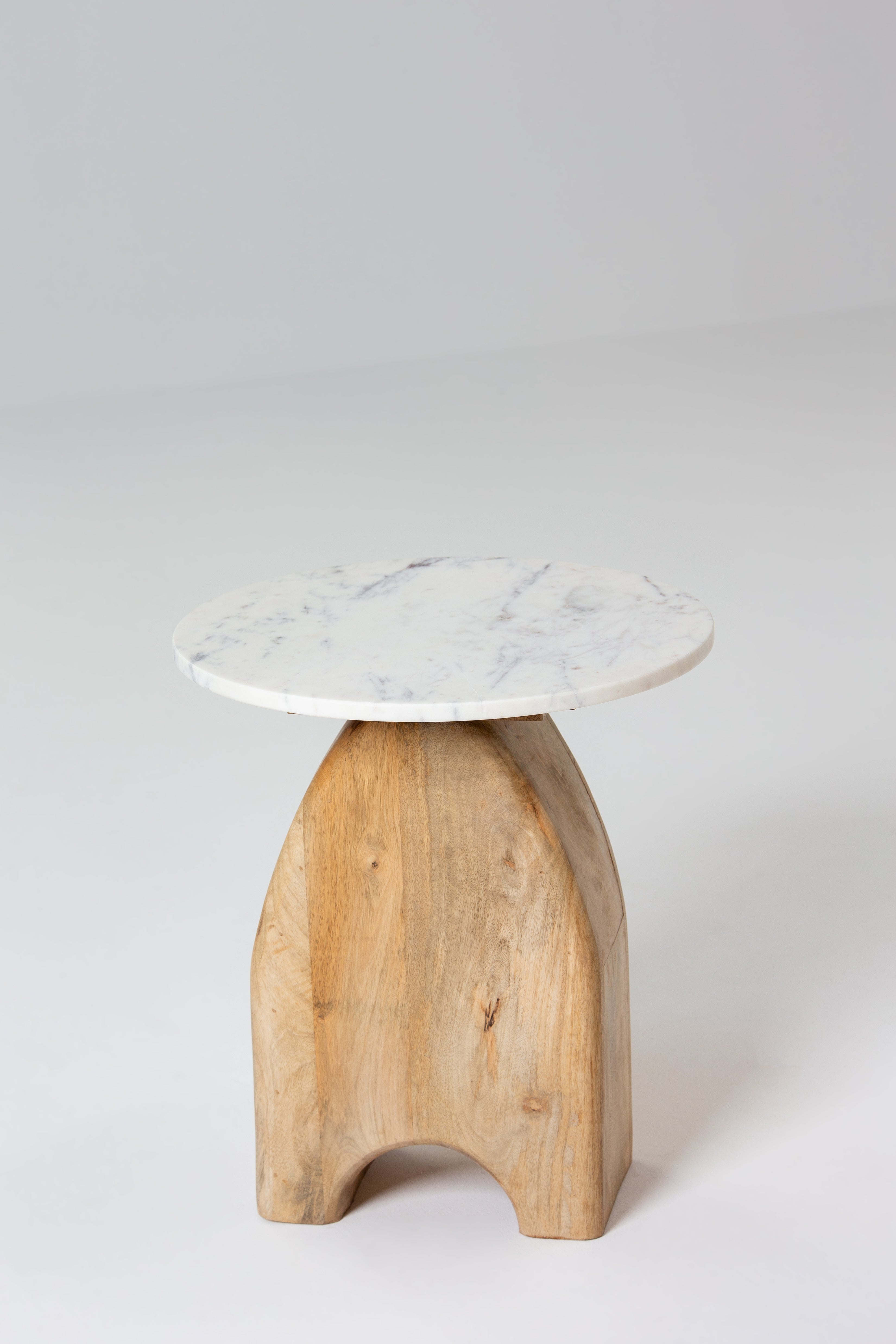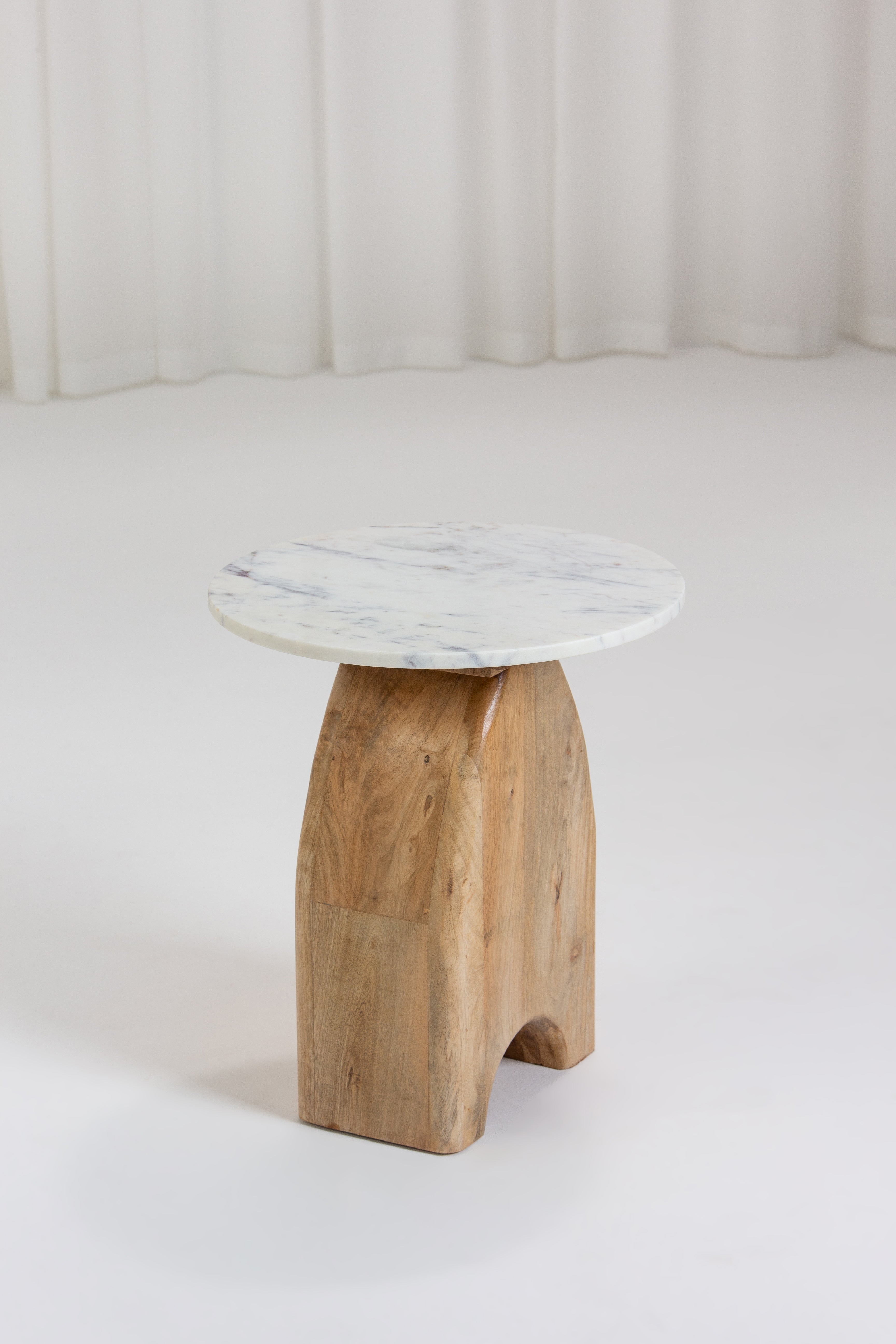 This side table features a sleek white marble top paired with a natural mango wood base, showcasing an arched design that exudes charm and character. The polished marble surface adds a luxurious touch, while the sturdy wooden base highlights organic grain patterns and warm, earthy tones. Its unique silhouette makes it a standout piece, perfect for enhancing modern, Scandinavian, or bohemian interiors with elegance and functionality.