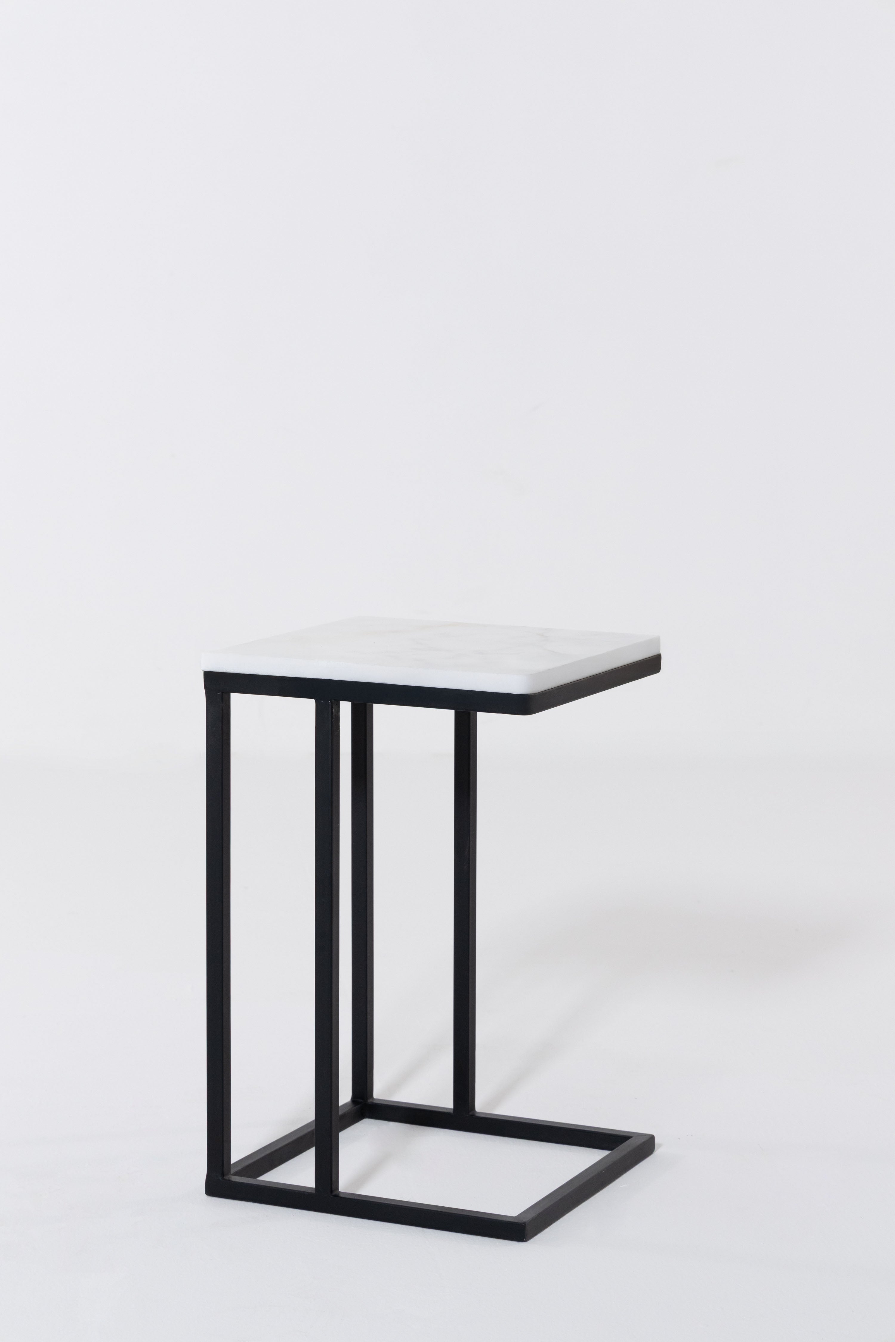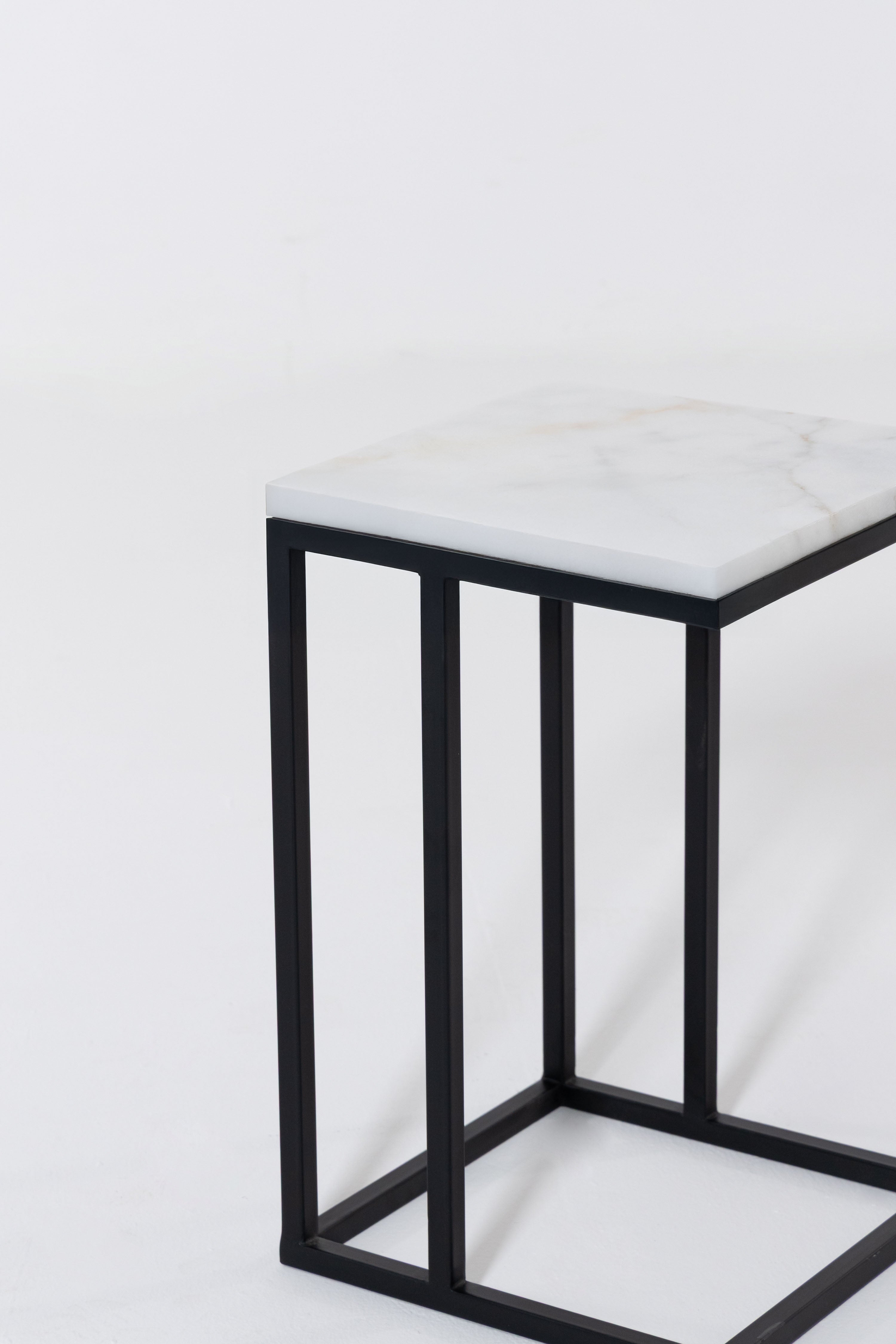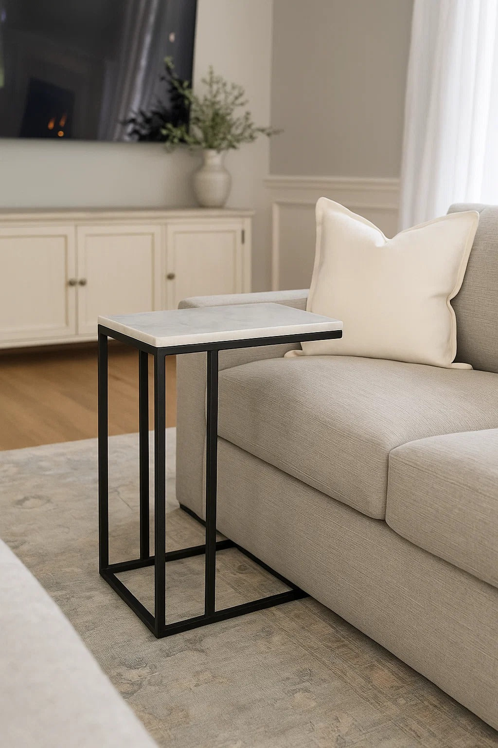 This marble coffee table brings sofa-side function with a white tabletop set on a black metal C-shaped frame. The open base slides under seating so your coffee, laptop, or book sits within easy reach, while the stable structure stays put on busy days. Smooth surfaces wipe clean after snacks and everyday use. Light to move yet sturdy in place, it suits living rooms, bedrooms, or home offices and keeps small spaces tidy with a modern profile that pairs well with neutral furnishings. day and night.