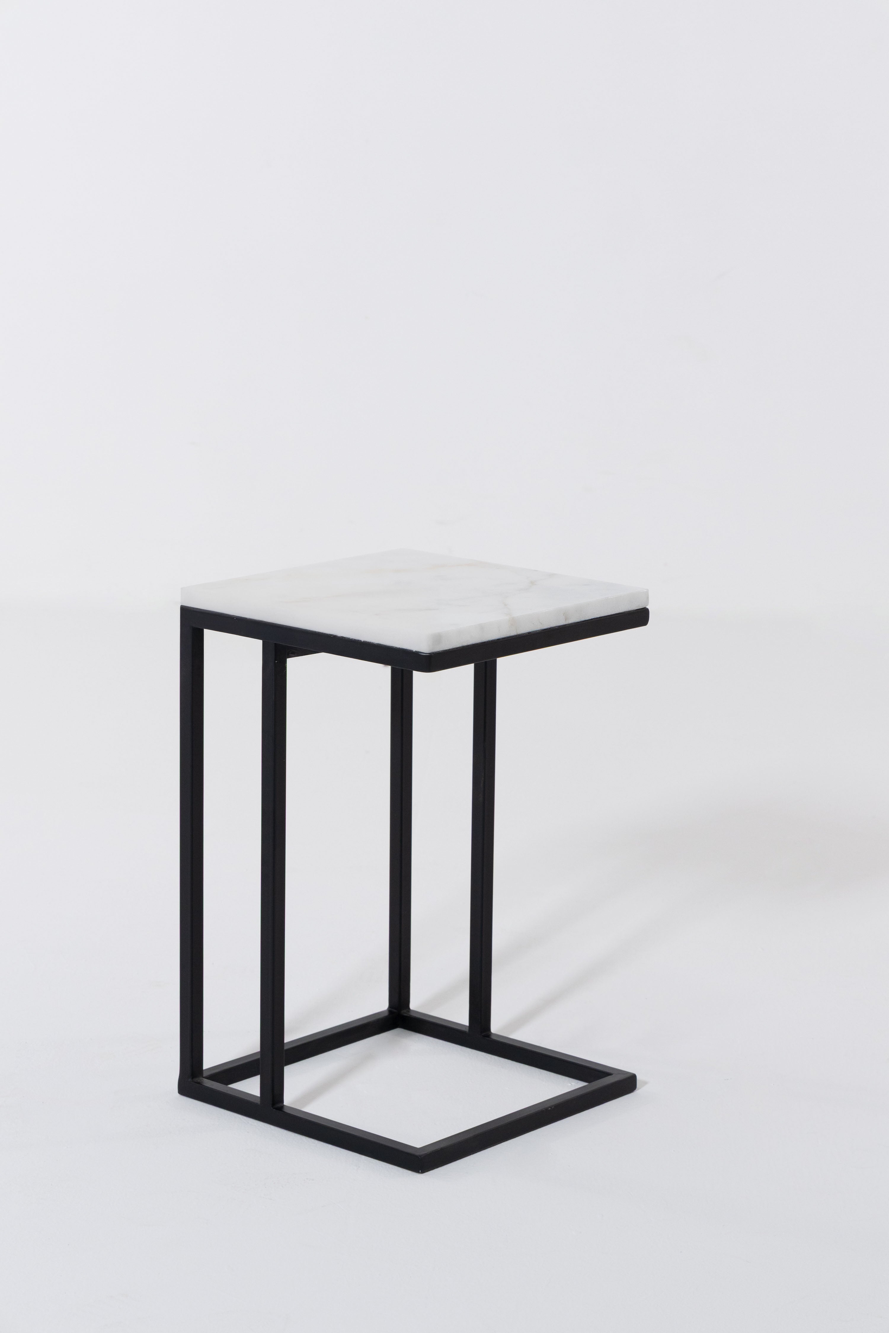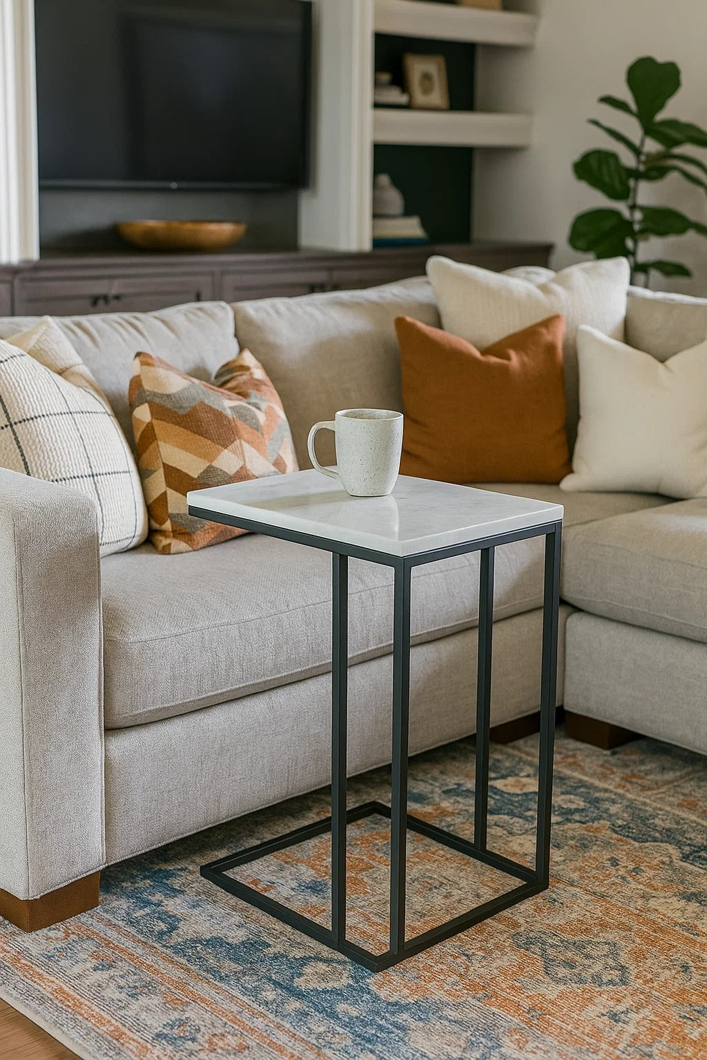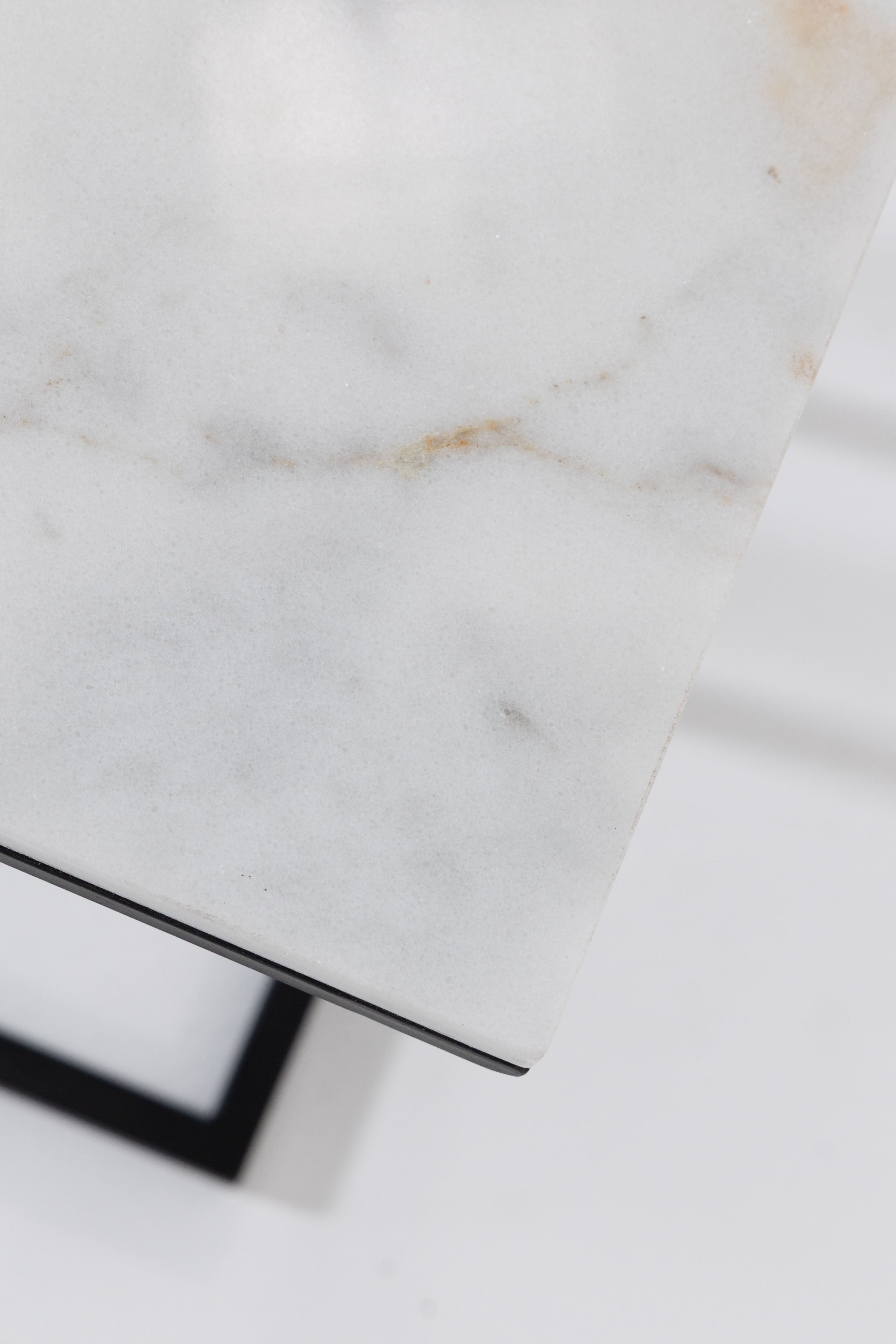 This marble coffee table brings sofa-side function with a white tabletop set on a black metal C-shaped frame. The open base slides under seating so your coffee, laptop, or book sits within easy reach, while the stable structure stays put on busy days. Smooth surfaces wipe clean after snacks and everyday use. Light to move yet sturdy in place, it suits living rooms, bedrooms, or home offices and keeps small spaces tidy with a modern profile that pairs well with neutral furnishings. day and night.