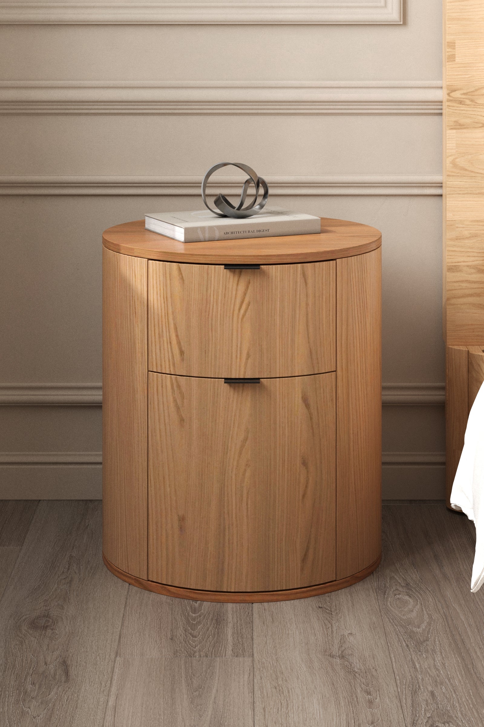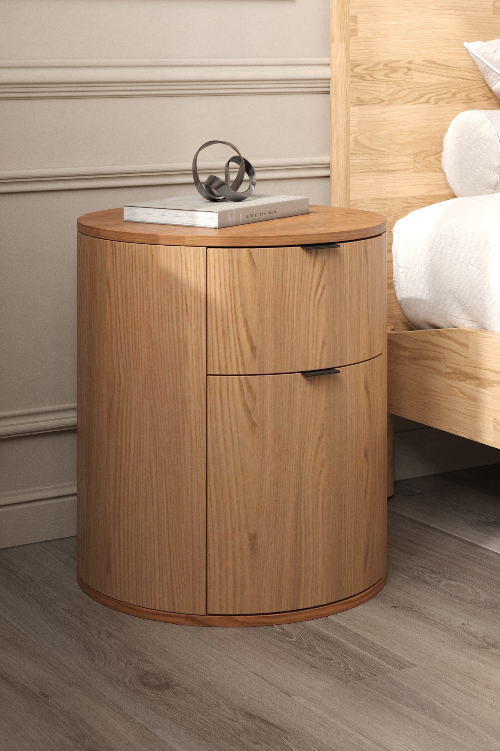 A minimalist yet luxurious nightstand crafted from solid wood. With its smooth, rounded silhouette, natural oak finish, and subtle wood grain texture, this bedside table blends seamlessly into modern, Scandinavian, and Japandi interiors. Featuring a top drawer and concealed cabinet with discreet black pulls, it's perfect for storing nighttime essentials while keeping your space clutter-free. As the protagonist of your serene bedroom retreat, you’ll love how the Sinem Table’s organic form and warm tones bring both function and timeless elegance to your daily routine.