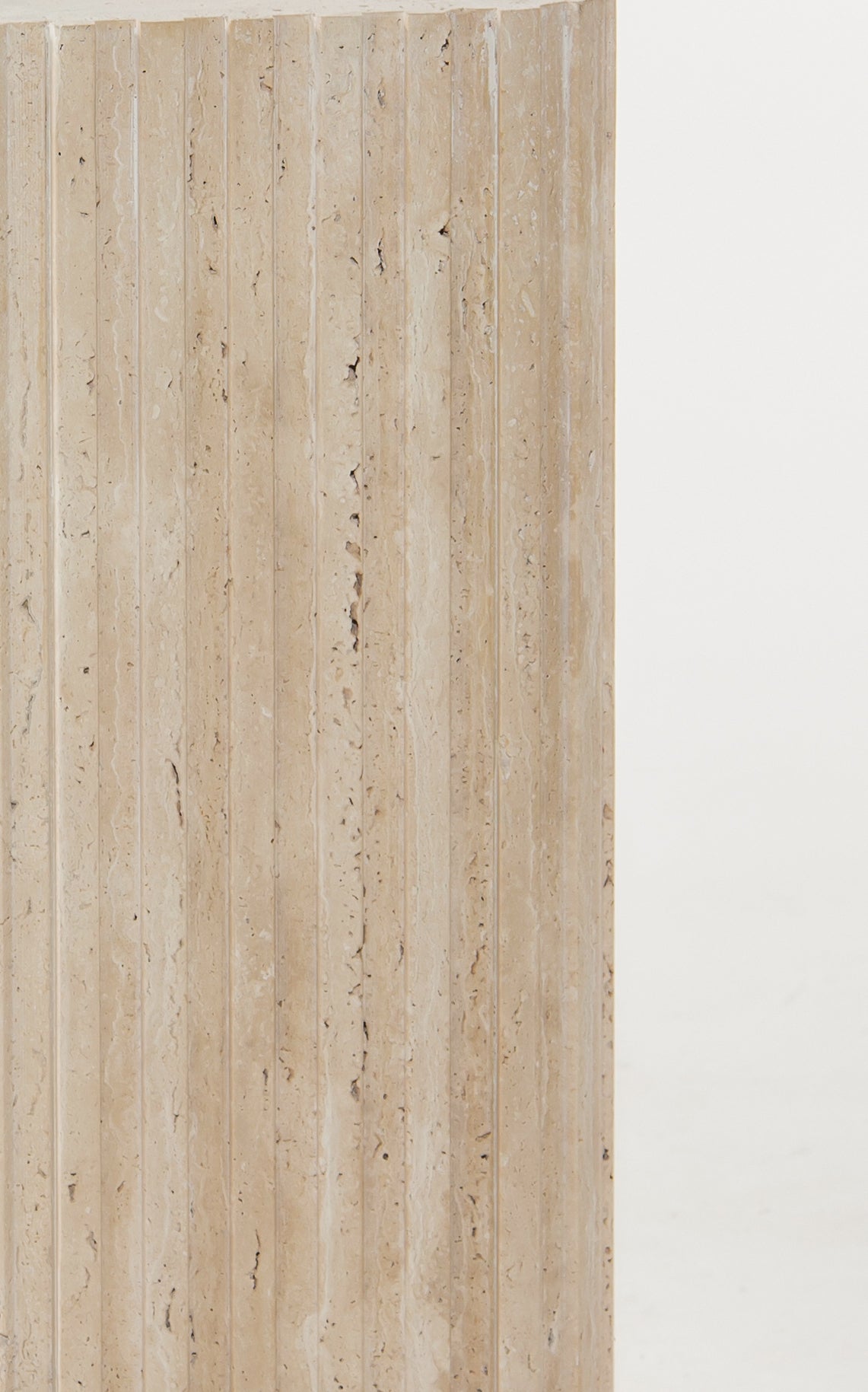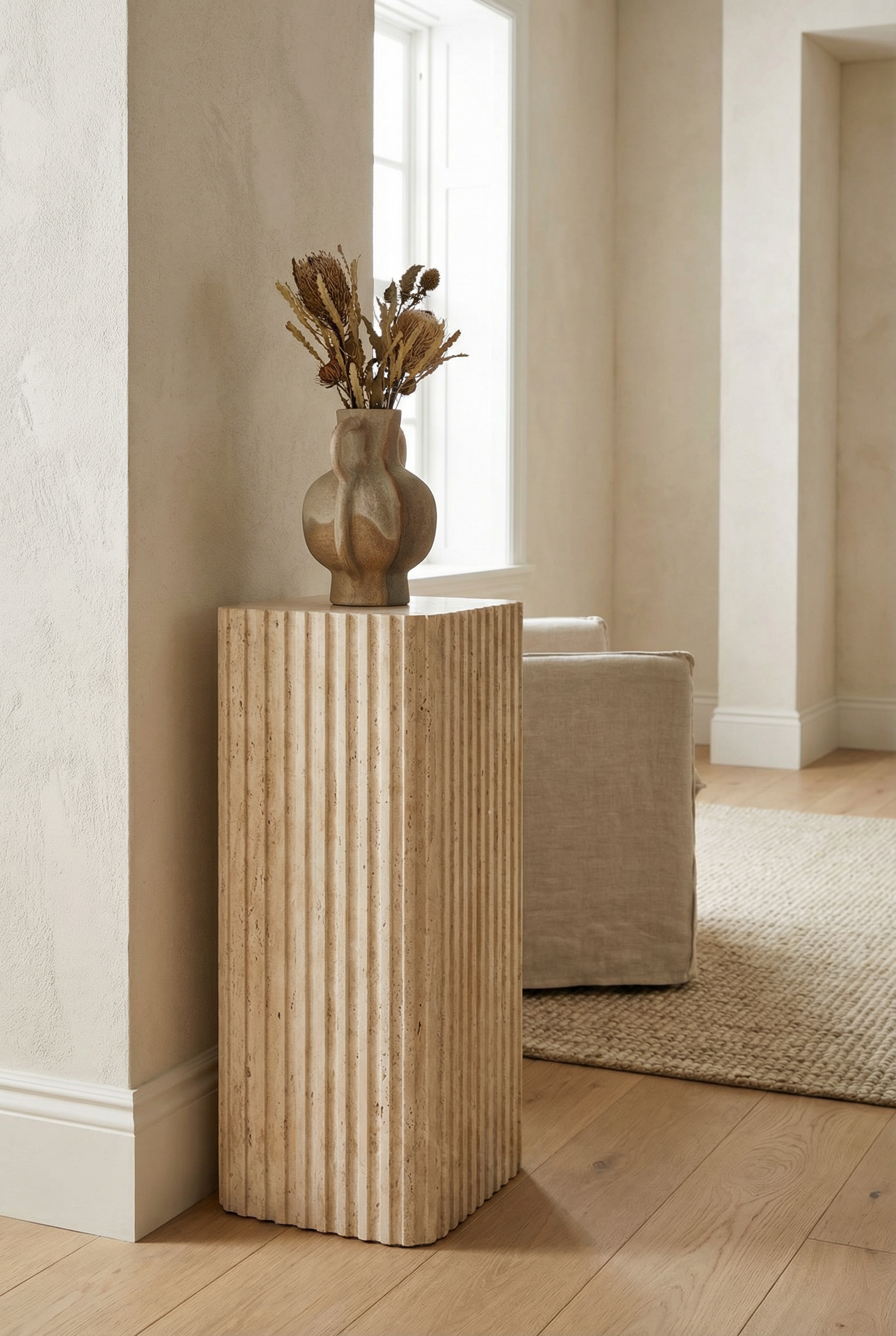 Elevate your interiors with the understated elegance of this Fluted Travertine Pedestal. Expertly crafted from natural travertine, this vertical accent piece features a gently rounded rectangular form with fluted detailing that adds rhythm, depth, and sculptural presence. Its clean lines and compact footprint make it the perfect plinth for displaying art, vases, sculptures, or lighting, while its natural stone texture offers earthy warmth and quiet luxury. The column-inspired silhouette lends itself well to both contemporary and classic spaces.