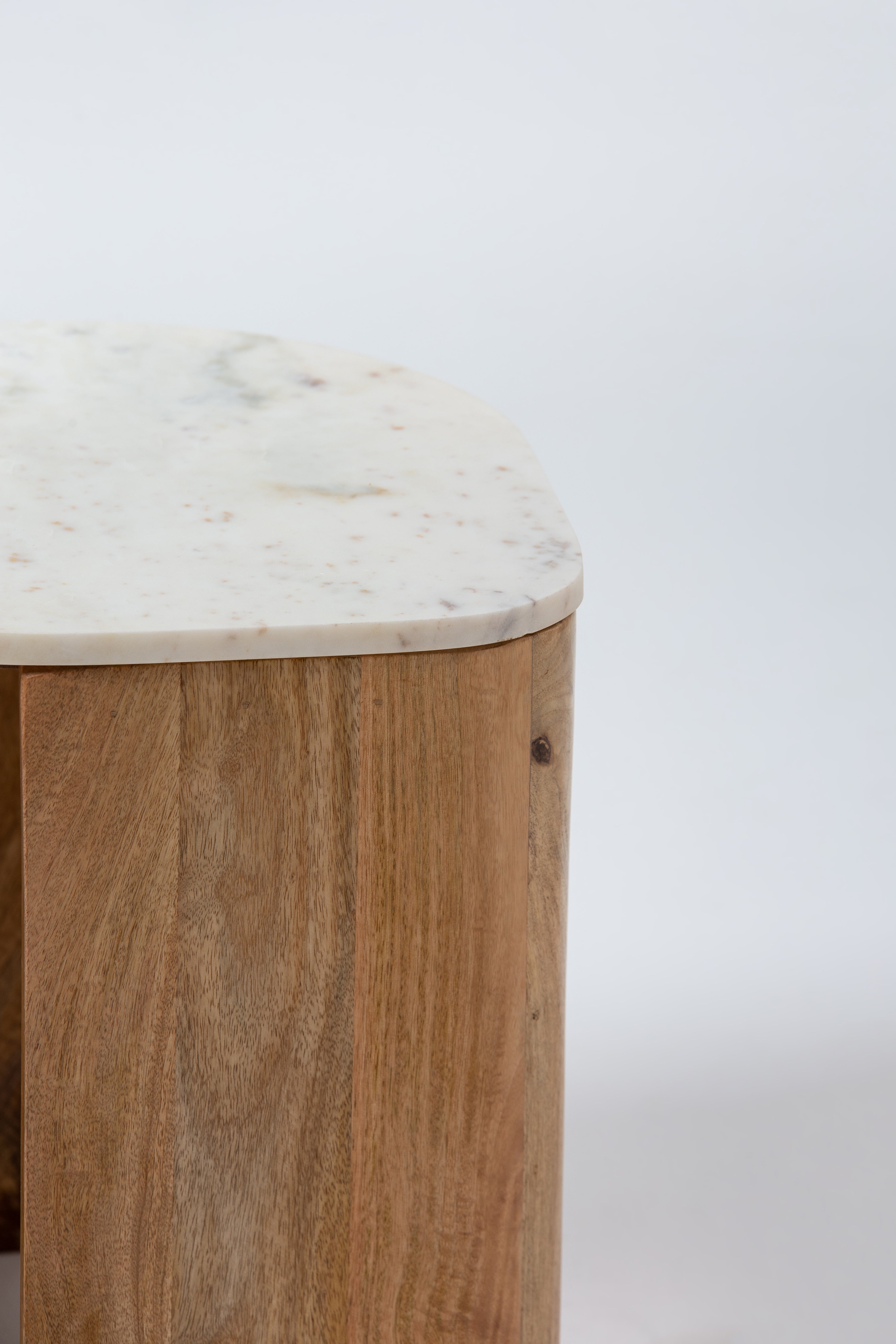 A sleek white marble surface rests on a solid mango wood base, exuding natural elegance and contemporary design. The organic shape and contrasting textures make it a standout piece for modern interiors, perfect as a functional accent or decorative table.