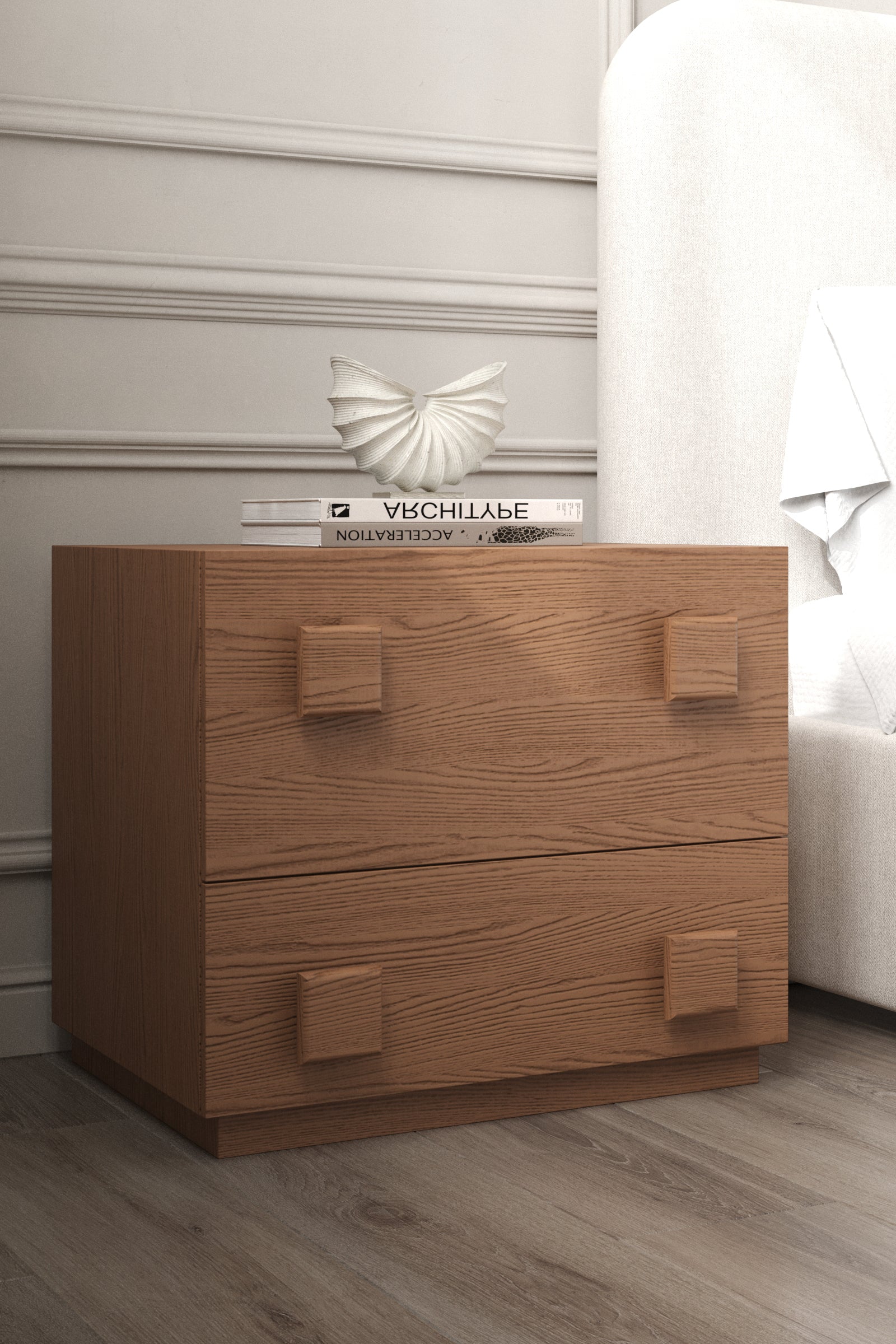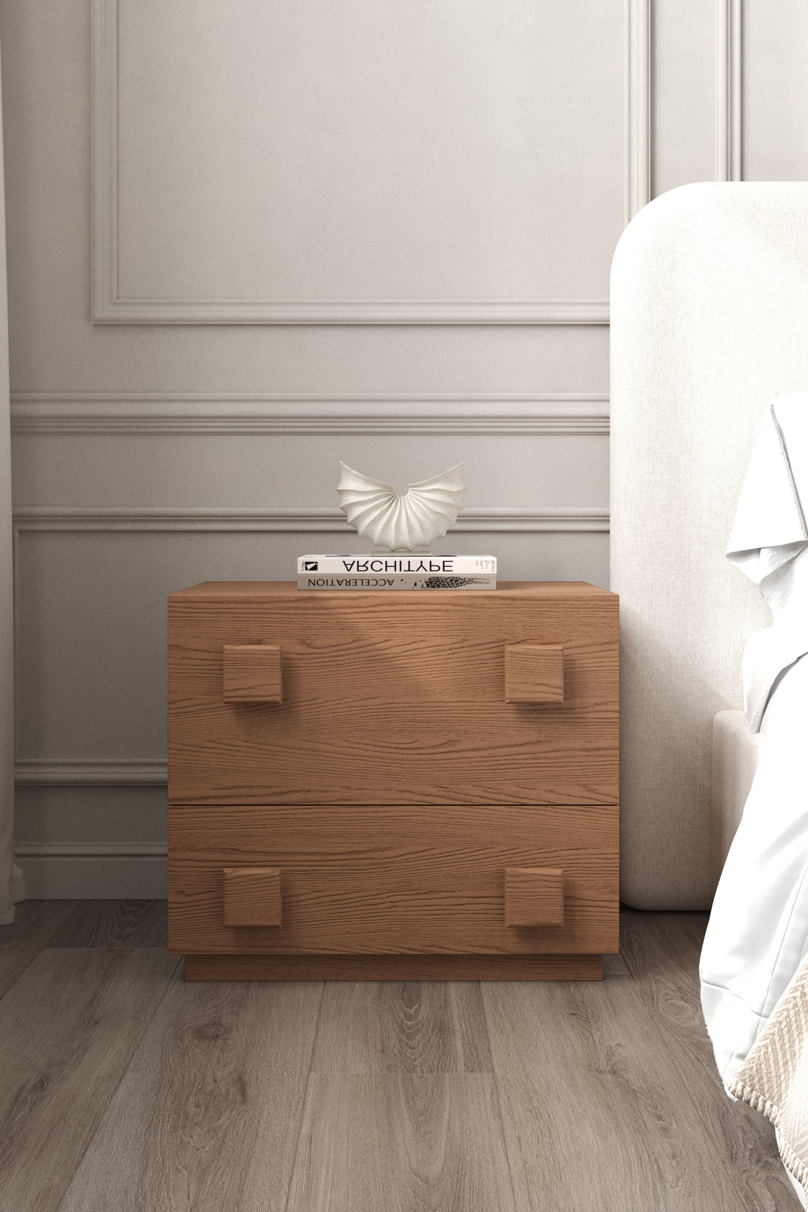 Complete your bedroom with a bedside cabinet that blends geometric design and natural warmth. Crafted from light wood with a clean cube silhouette, it features two spacious drawers accented by bold square handles that add sculptural character. The minimalist design highlights the beauty of natural grain while providing practical storage for your essentials. Perfect for modern, Scandinavian, or contemporary interiors, this piece brings both function and understated elegance to your bedside.